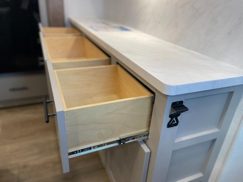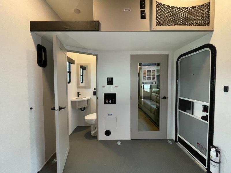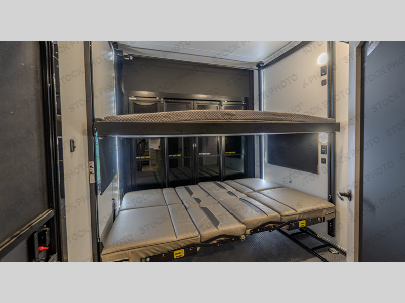 Load up the dirt bikes, pack your bags, and head to the campground in this spacious toy hauler. Once your toys are unloaded using the weather resistant ramp door, relax on the HappiJac roll-over sofas with a folding table in between, and this area can become your guests' bedroom at night since there is a drop-down queen bed, a half bath, plus an additional 30" x 72" bunk/loft bed. You will have the front bedroom all to yourselves that includes a king bed with an optional queen bed plus a wardrobe slide out to keep your space tidy. Everyone can meet in the main living area/kitchen for movie night with the HDTV and sofa slide out, while the chef of makes dinner on the three-burner cooktop. There is also a hutch and pantry for storage and a kitchen island for more counter space!
