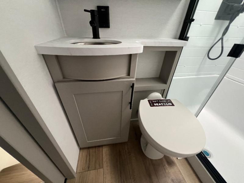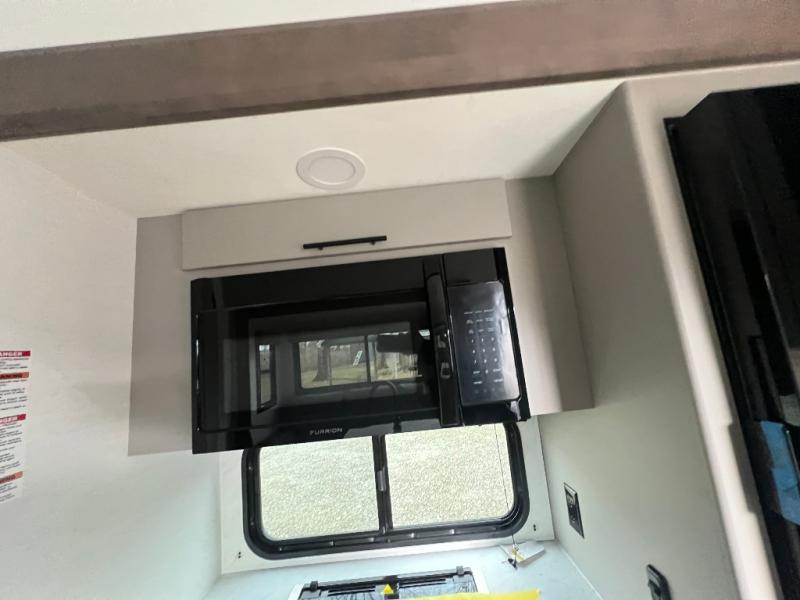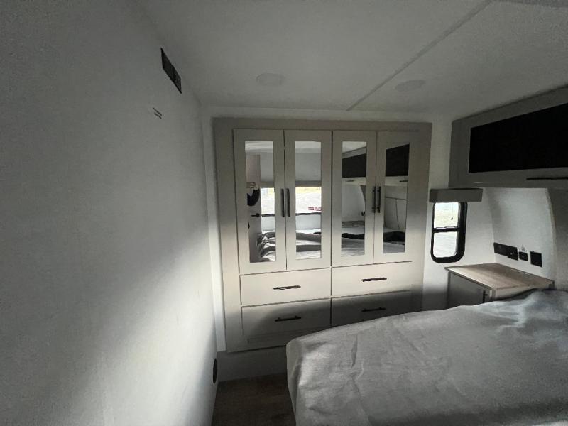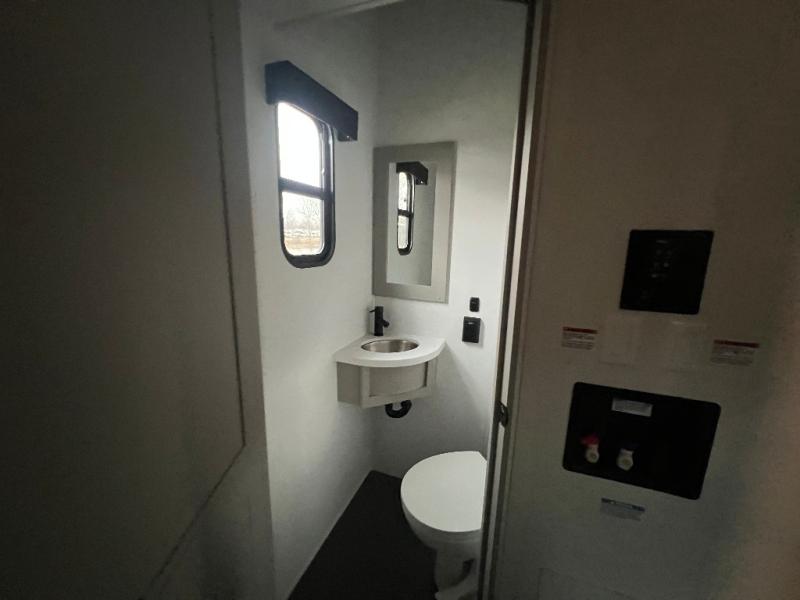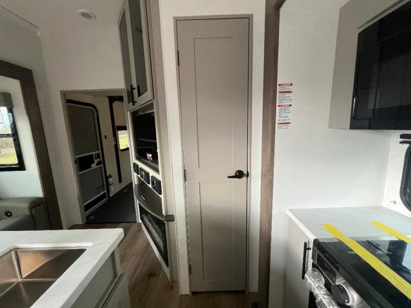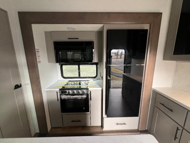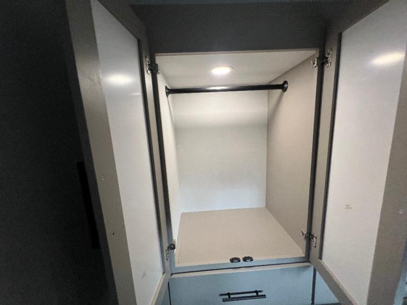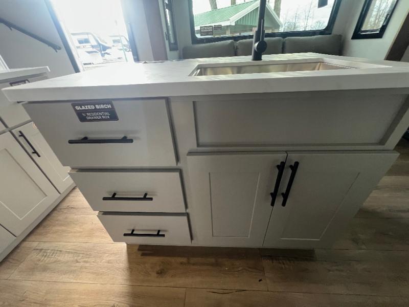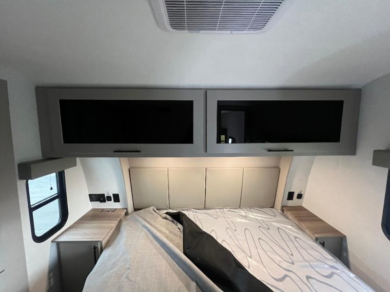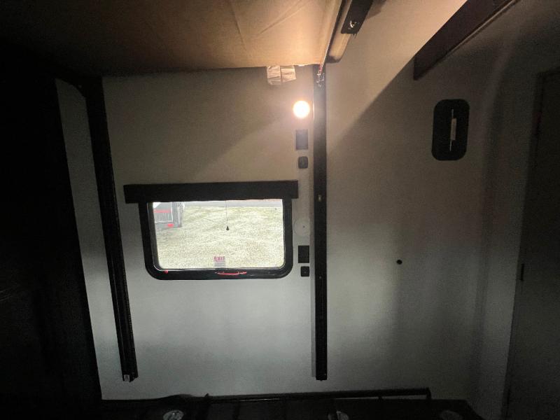 Load up the dirt bikes, pack your bags, and head to the campground in this spacious toy hauler. Once your toys are unloaded using the weather resistant ramp door, relax on the HappiJac roll-over sofas with a folding table in between, and this area can become your guests' bedroom at night since there is a drop-down queen bed, a half bath, plus an additional 30" x 72" bunk/loft bed. You will have the front bedroom all to yourselves that includes a king bed with an optional queen bed plus a wardrobe slide out to keep your space tidy. Everyone can meet in the main living area/kitchen for movie night with the HDTV and sofa slide out, while the chef of makes dinner on the three-burner cooktop. There is also a hutch and pantry for storage and a kitchen island for more counter space!