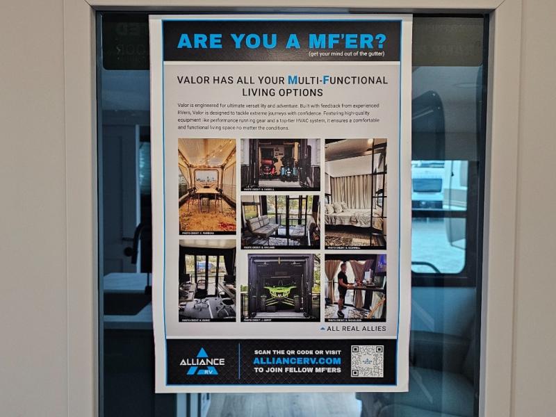 The Valor All-Access 32T13 is built for those who want serious toy-hauling capability without giving up comfort. With its spacious garage, bath and a half, triple slide layout, and durable Alliance construction, this toy hauler is ready for long weekends, extended trips, and everything in between.