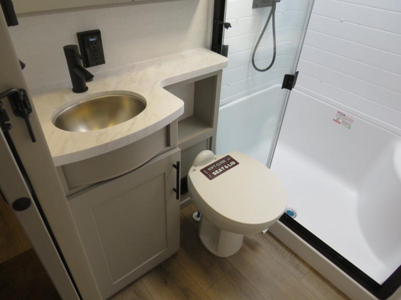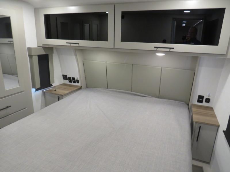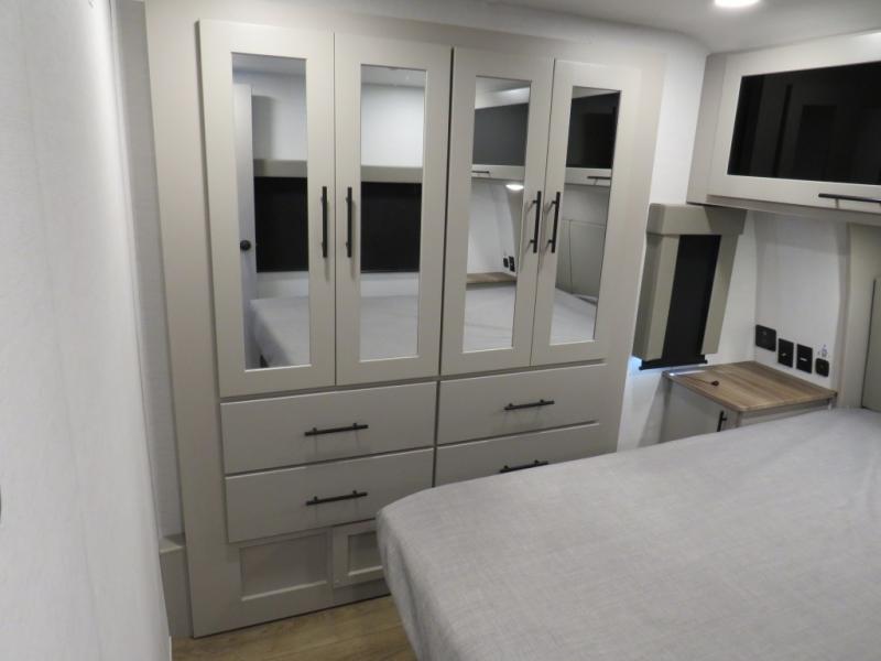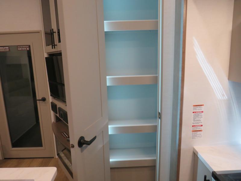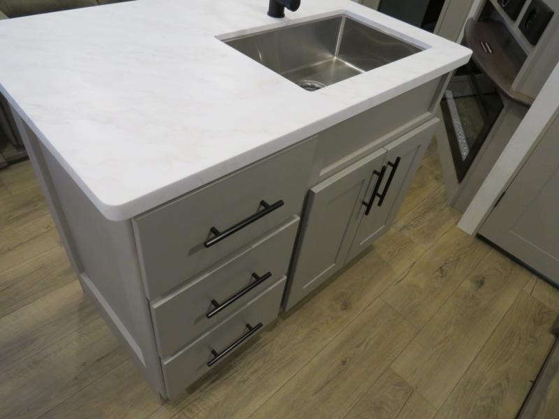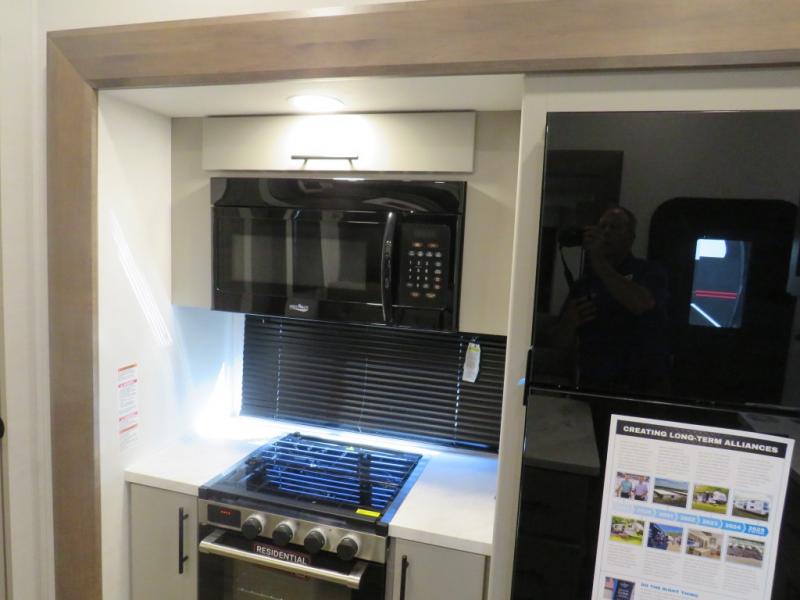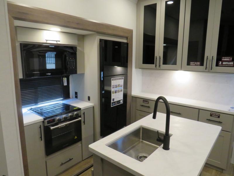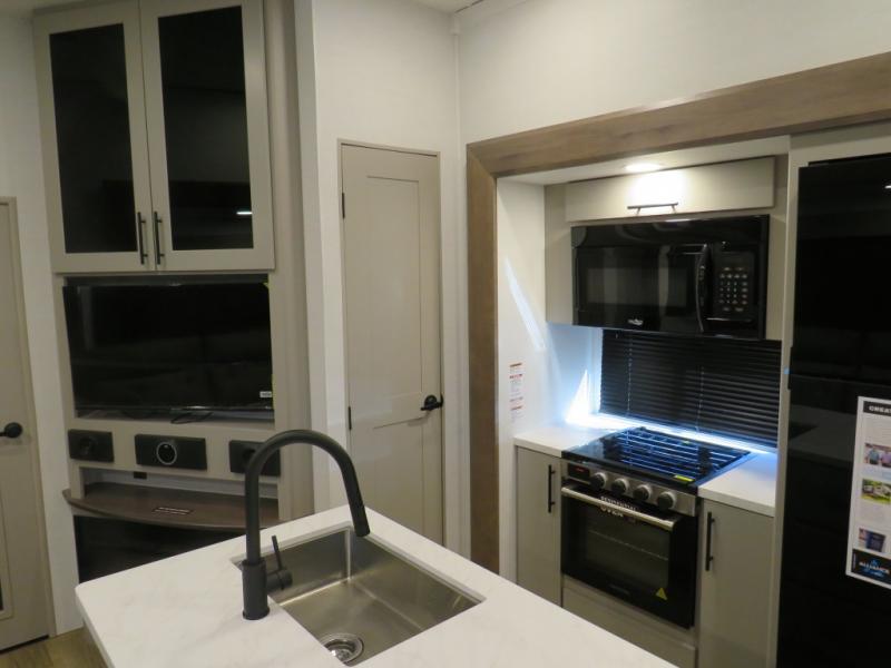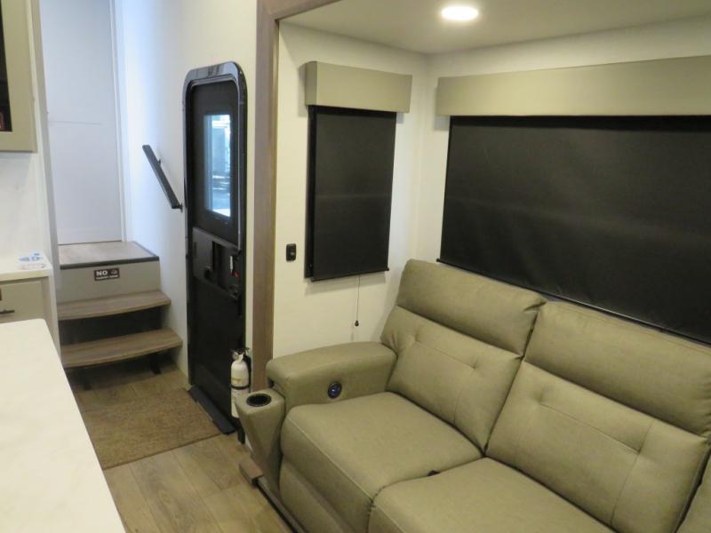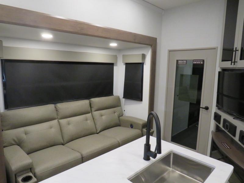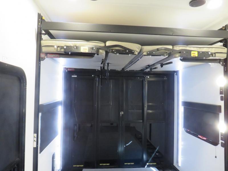 If you're needing more space for your toys, this toy hauler will meet your needs with a 14' separate garage! Once your toys are unloaded using the weather resistant ramp door, relax on the HappiJac roll-over sofas with a folding table in between, and this area can become your guests' bedroom at night since there is a drop-down queen bed, a half bath, plus an additional 30" x 72" bunk/loft bed. You will have the front bedroom all to yourselves that includes a king bed with an optional queen bed plus a wardrobe slide out to keep your space tidy. Everyone can meet in the main living area/kitchen for movie night with the HDTV and sofa slide out, while the chef of makes dinner on the three burner cooktop. There is also a hutch and pantry for storage and a kitchen island for more counter space!