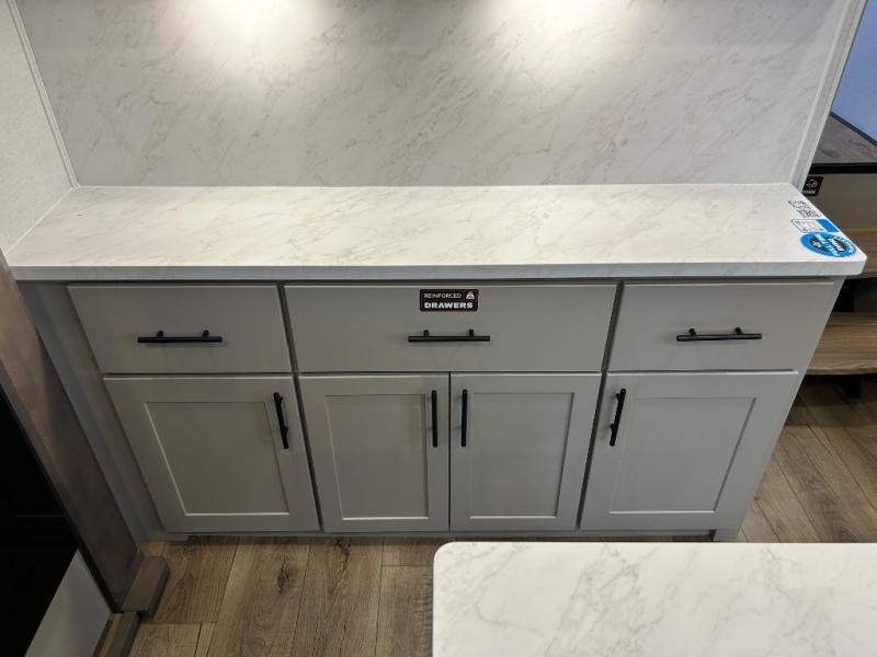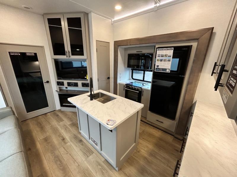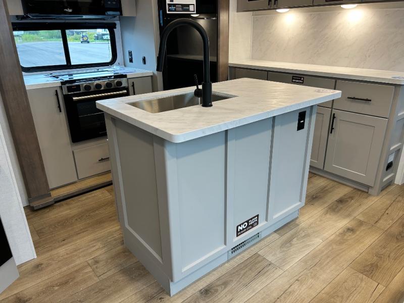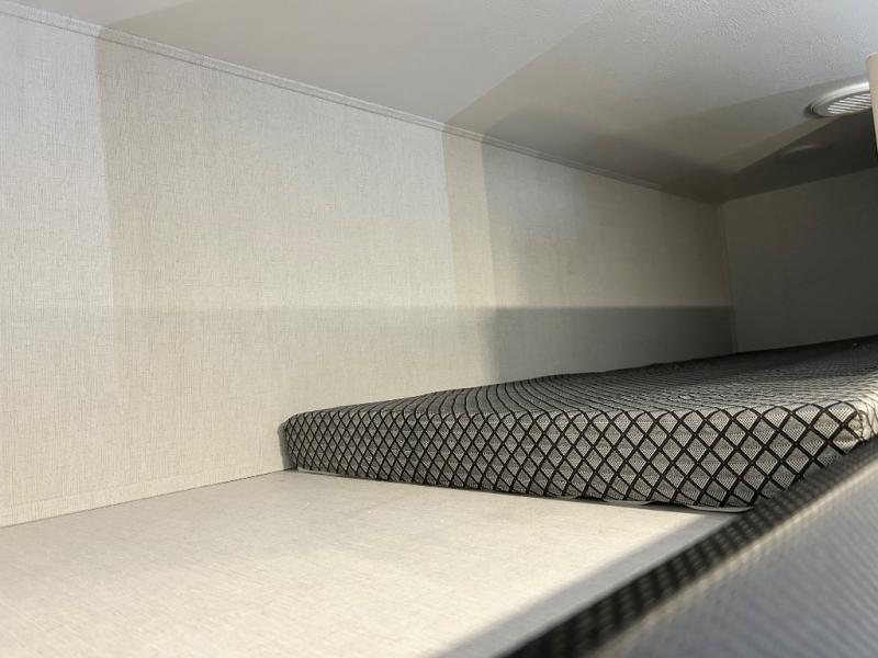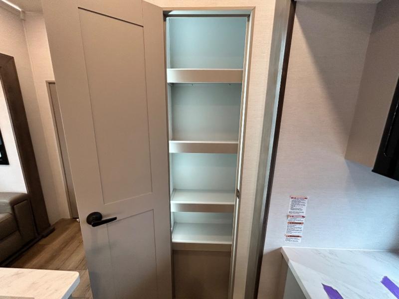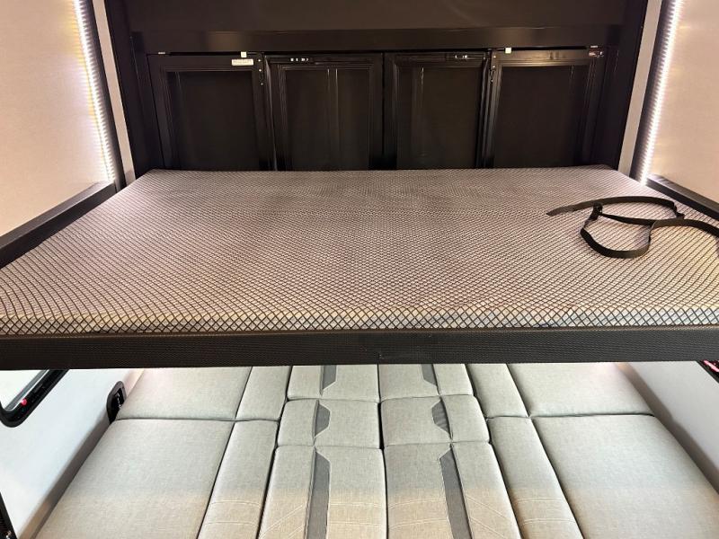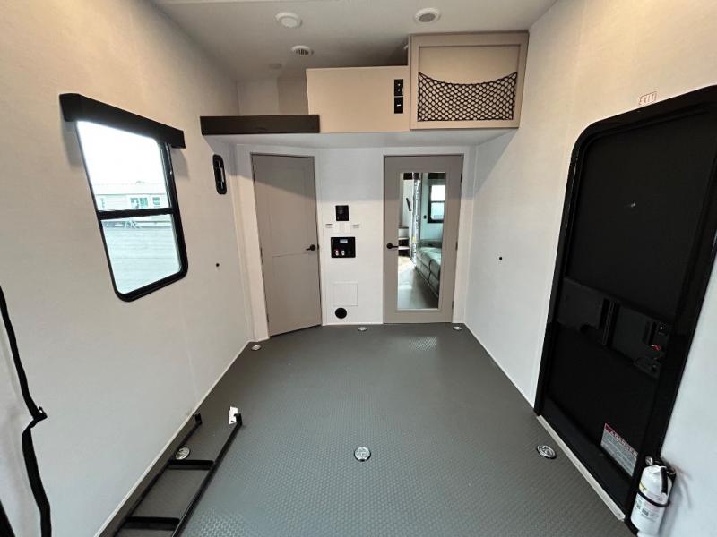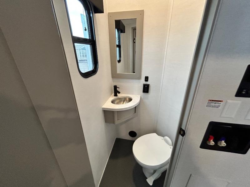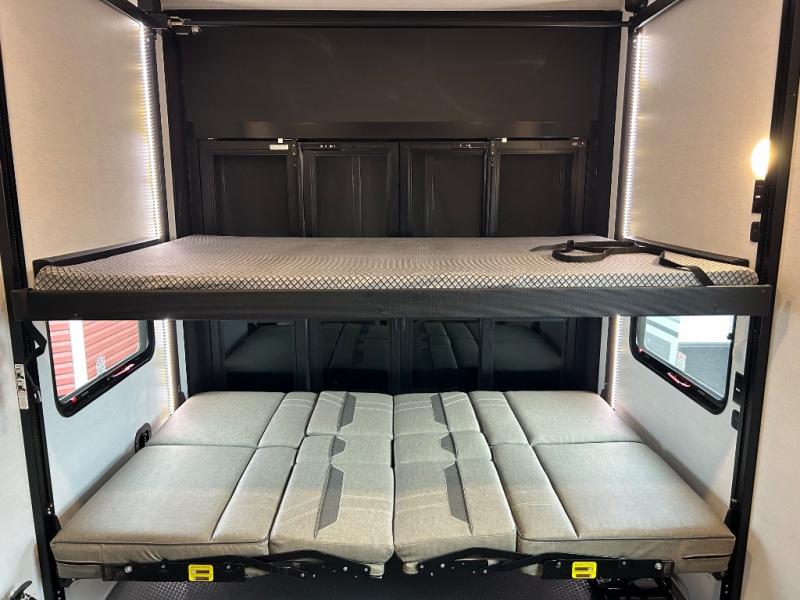 If you're needing more space for your toys, this toy hauler will meet your needs with a 14' separate garage! Once your toys are unloaded using the weather resistant ramp door, relax on the HappiJac roll-over sofas with a folding table in between, and this area can become your guests' bedroom at night since there is a drop-down queen bed, a half bath, plus an additional 30" x 72" bunk/loft bed. You will have the front bedroom all to yourselves that includes a king bed with an optional queen bed plus a wardrobe slide out to keep your space tidy. Everyone can meet in the main living area/kitchen for movie night with the HDTV and sofa slide out, while the chef of makes dinner on the three burner cooktop. There is also a hutch and pantry for storage and a kitchen island for more counter space!