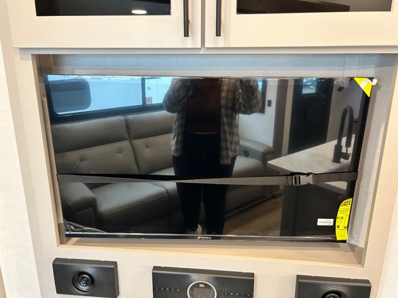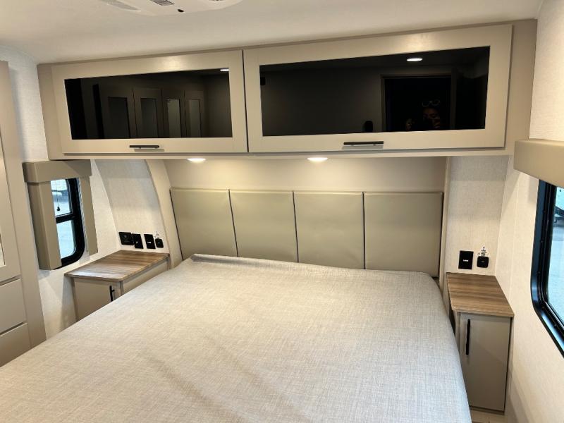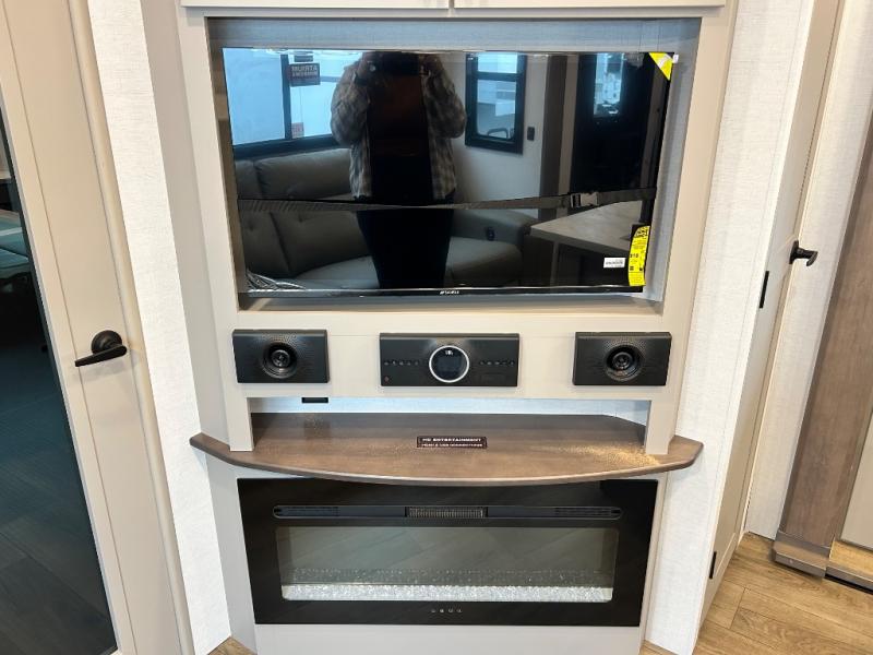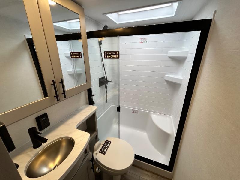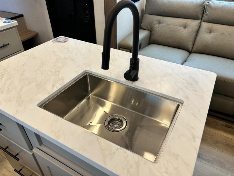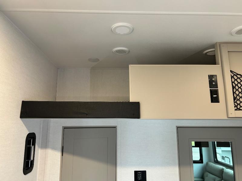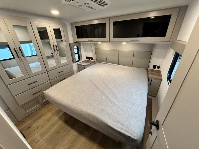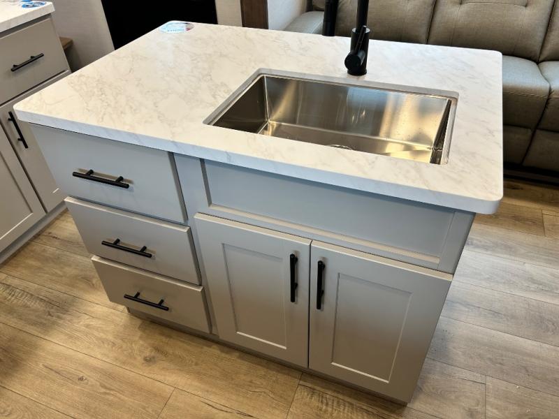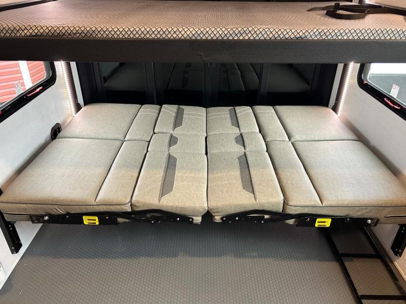 If you're needing more space for your toys, this toy hauler will meet your needs with a 14' separate garage! Once your toys are unloaded using the weather resistant ramp door, relax on the HappiJac roll-over sofas with a folding table in between, and this area can become your guests' bedroom at night since there is a drop-down queen bed, a half bath, plus an additional 30" x 72" bunk/loft bed. You will have the front bedroom all to yourselves that includes a king bed with an optional queen bed plus a wardrobe slide out to keep your space tidy. Everyone can meet in the main living area/kitchen for movie night with the HDTV and sofa slide out, while the chef of makes dinner on the three burner cooktop. There is also a hutch and pantry for storage and a kitchen island for more counter space!