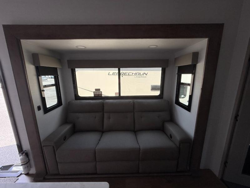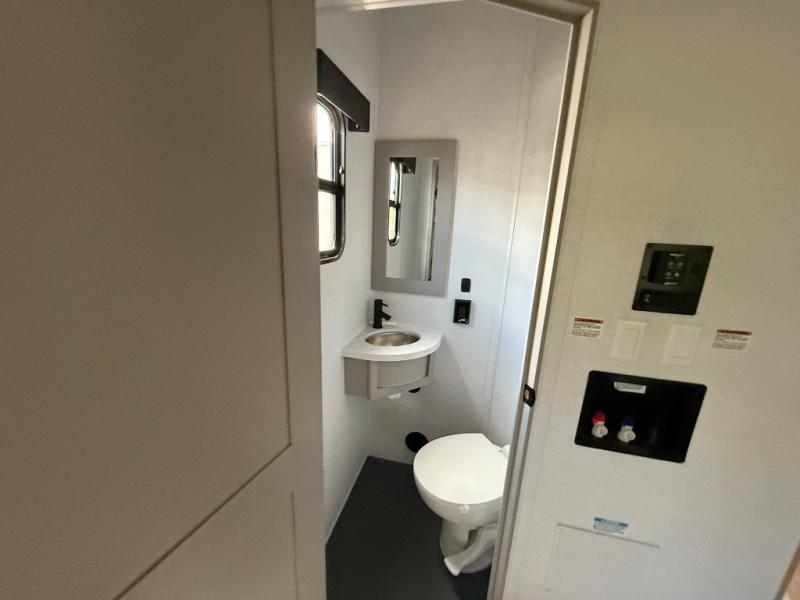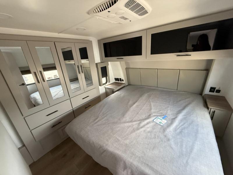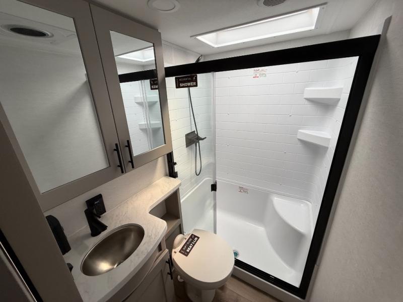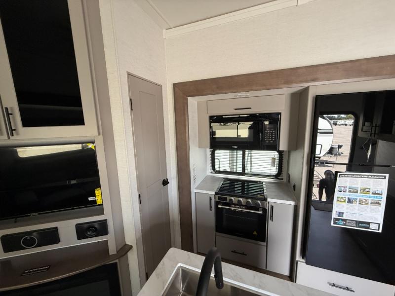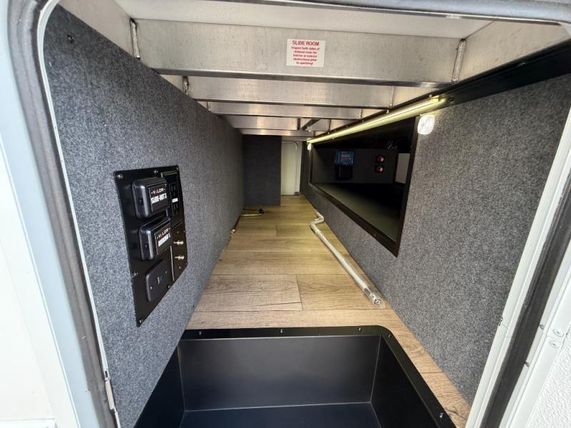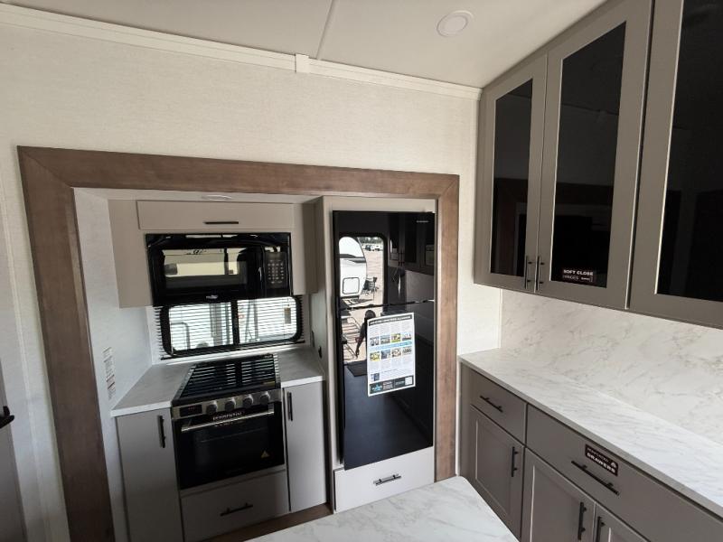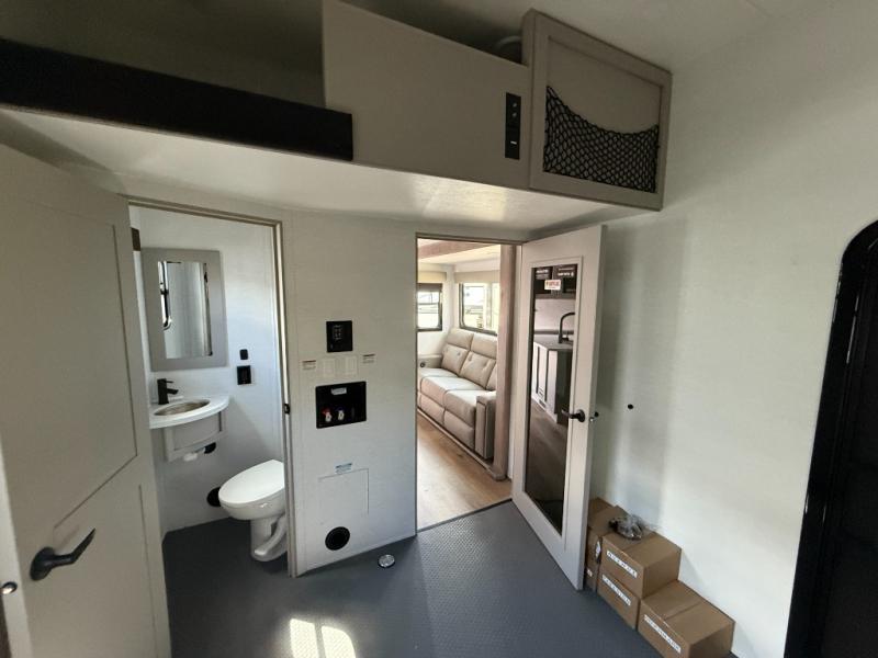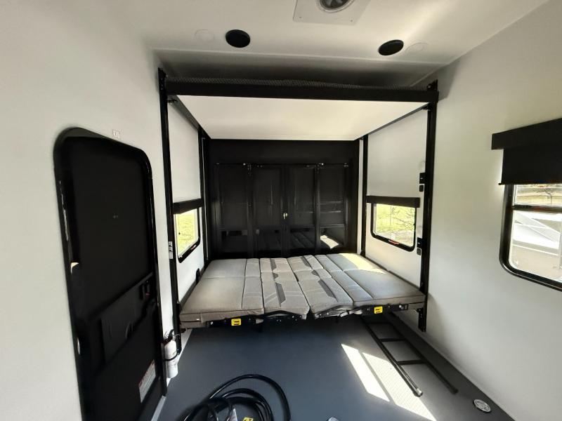 If you're needing more space for your toys, this toy hauler will meet your needs with a 14' separate garage! Once your toys are unloaded using the weather resistant ramp door, relax on the HappiJac roll-over sofas with a folding table in between, and this area can become your guests' bedroom at night since there is a drop-down queen bed, a half bath, plus an additional 30" x 72" bunk/loft bed. You will have the front bedroom all to yourselves that includes a king bed with an optional queen bed plus a wardrobe slide out to keep your space tidy. Everyone can meet in the main living area/kitchen for movie night with the HDTV and sofa slide out, while the chef of makes dinner on the three burner cooktop. There is also a hutch and pantry for storage and a kitchen island for more counter space!