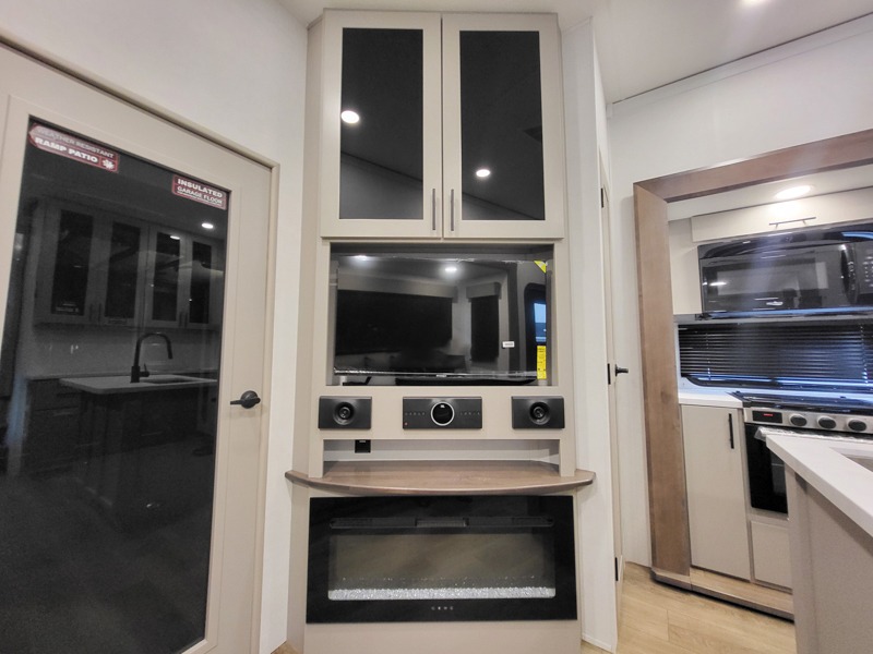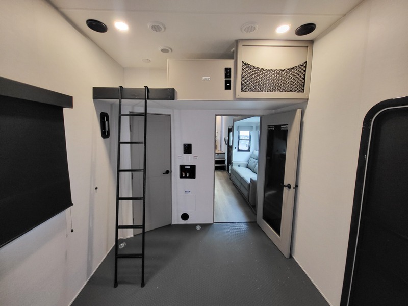 If you're needing more space for your toys, this toy hauler will meet your needs with a 14' separate garage! Once your toys are unloaded using the weather resistant ramp door, relax on the HappiJac roll-over sofas with a folding table in between, and this area can become your guests' bedroom at night since there is a drop-down queen bed, a half bath, plus an additional 30" x 72" bunk/loft bed. You will have the front bedroom all to yourselves that includes a king bed with an optional queen bed plus a wardrobe slide out to keep your space tidy. Everyone can meet in the main living area/kitchen for movie night with the HDTV and sofa slide out, while the chef of makes dinner on the three burner cooktop. There is also a hutch and pantry for storage and a kitchen island for more counter space!