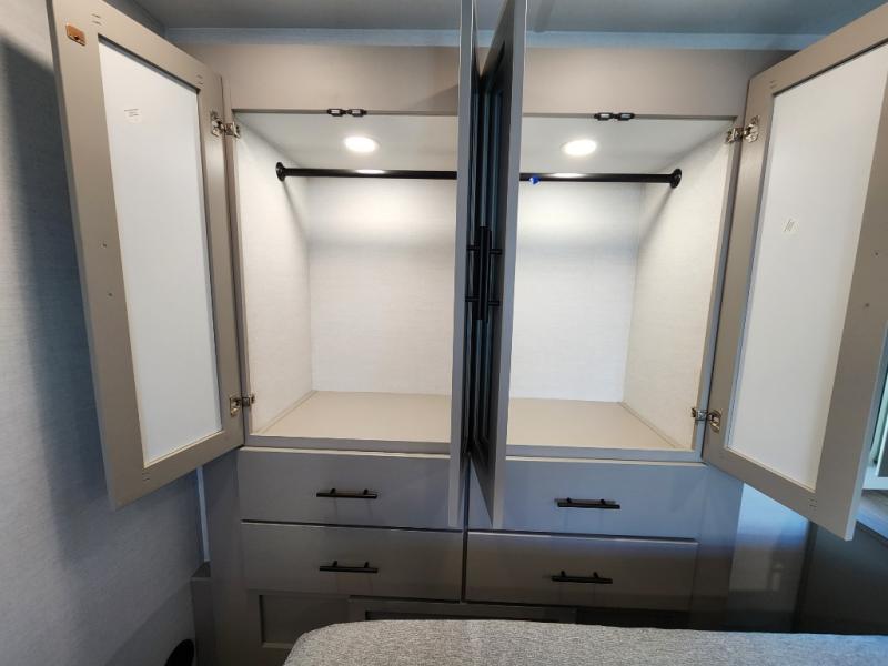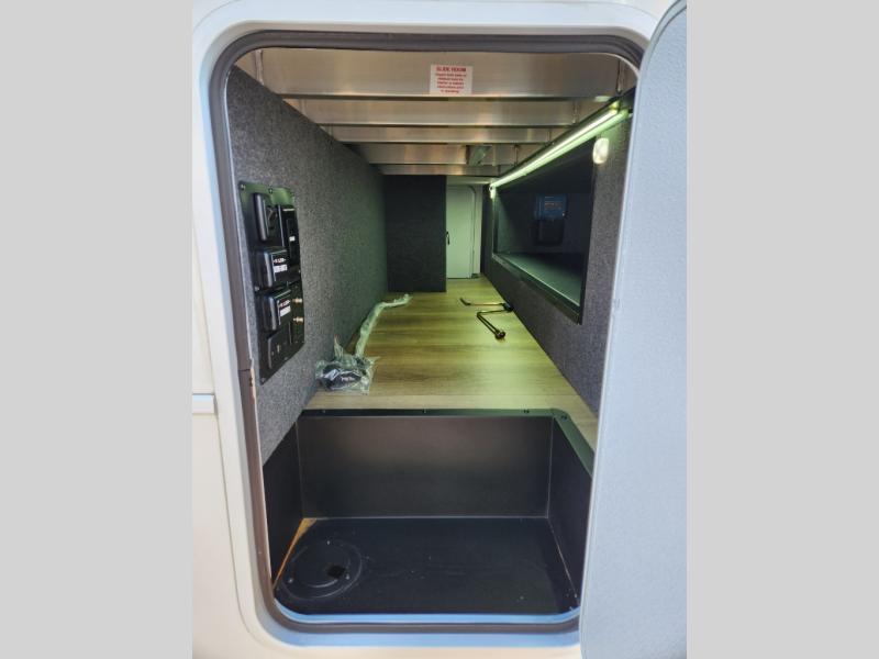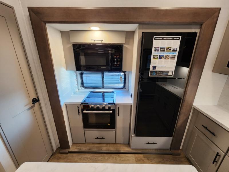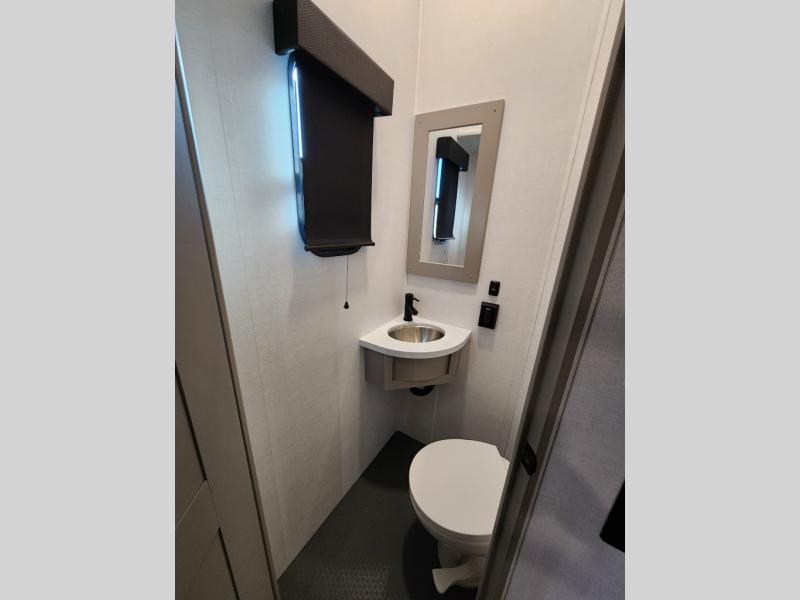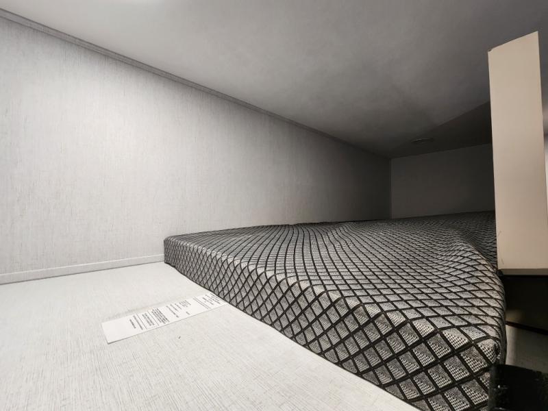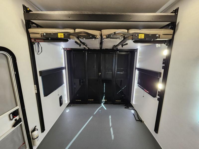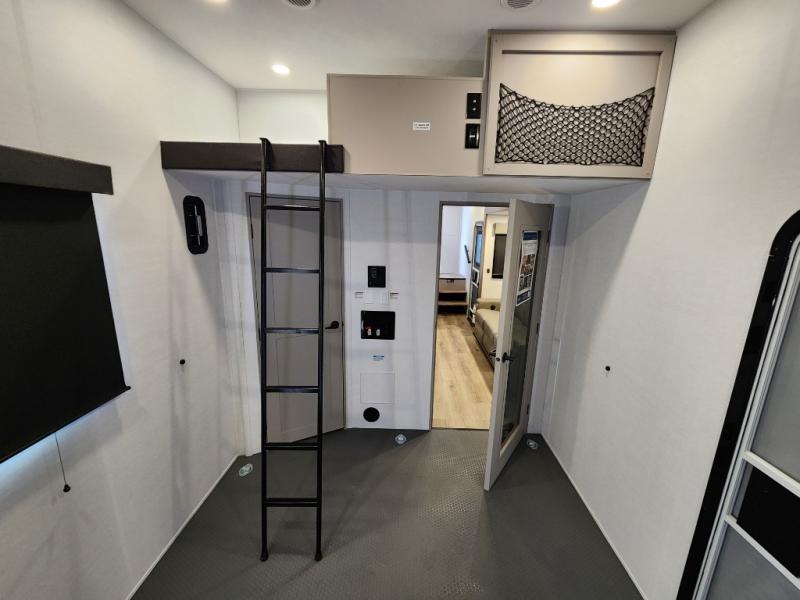 If you're needing more space for your toys, this toy hauler will meet your needs with a 14' separate garage! Once your toys are unloaded using the weather resistant ramp door, relax on the HappiJac roll-over sofas with a folding table in between, and this area can become your guests' bedroom at night since there is a drop-down queen bed, a half bath, plus an additional 30" x 72" bunk/loft bed. You will have the front bedroom all to yourselves that includes a king bed with an optional queen bed plus a wardrobe slide out to keep your space tidy. Everyone can meet in the main living area/kitchen for movie night with the HDTV and sofa slide out, while the chef of makes dinner on the three burner cooktop. There is also a hutch and pantry for storage and a kitchen island for more counter space!