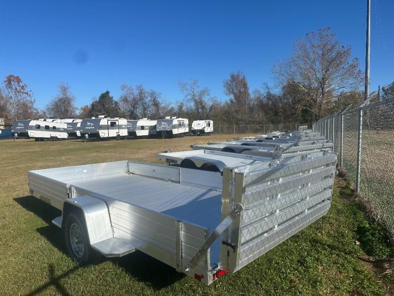 • 3500# Rubber torsion axle (rated at 2990#) - No brakes - Easy lube hubs • ST205/75R14 Radial tires • Aluminum wheels, 5-4.5 BHP • Aluminum fenders • Extruded aluminum floor • 8.5" Front & side retaining rails • A-Framed aluminum tongue, 48" long with 2" coupler • 6) Stake pockets (3 per side) • 4) Tie down loops (2 per side) • Tongue Handle • Receptacle Holder • Fender Steps • Swivel tongue jack, 1200# capacity • LED Lighting package, safety chains • Aluminum tailgate - 75.5" x 44" long / Bi-fold - 75.5" x 60" long • Overall width = 101.5" • Overall length = 225"