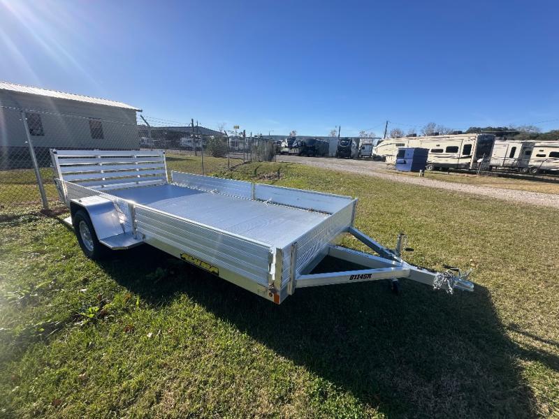 Standard Equipment • 12" Solid front • 2) 69"x12" Front side ramps - 12" solid side on balance of trailer • Aluminum bi-fold rear tailgate - 75.5" wide x 60" long • 3500# Rubber torsion axle - No brakes - Easy lube hubs (2990 GVWR) • ST205/75R14 Aluminum wheels & tires • Aluminum fenders • Extruded aluminum floor • A-Framed aluminum tongue, 48" long with 2" coupler • 6) Tie down loops on 8112 / 8) Tie down loops on 8114 & 8115 • Tongue Handle • Receptacle Holder • Fender Steps • Swivel tongue jack, 1200# capacity • LED Lighting package, safety chains • Overall width = 101 ½" • Overall length = 193" / 219"/ 230"