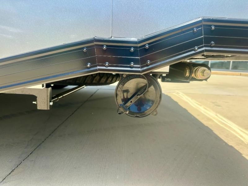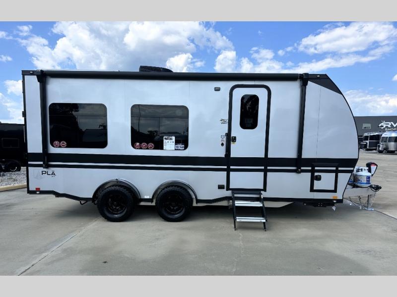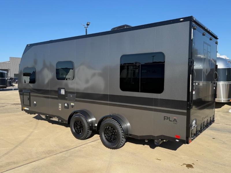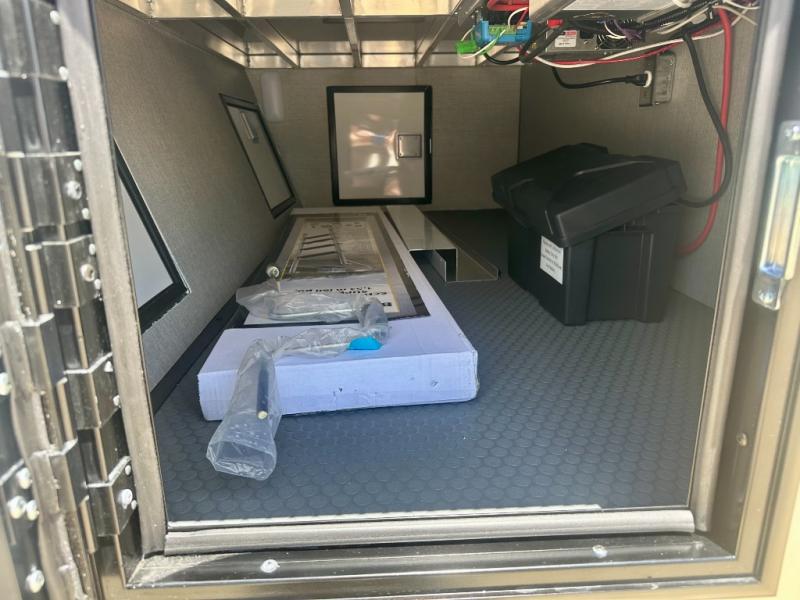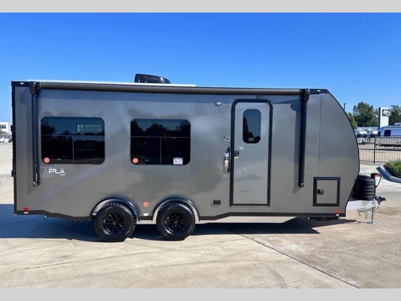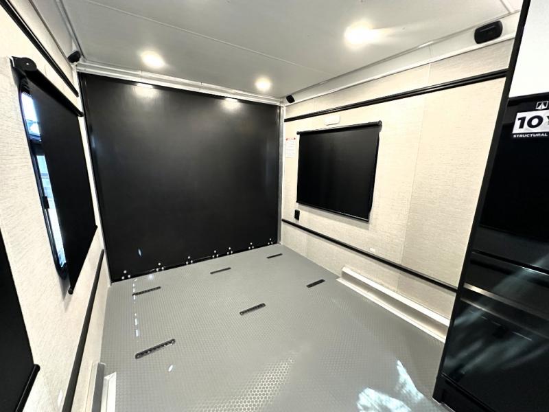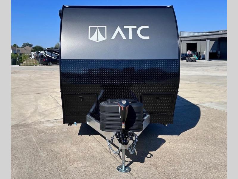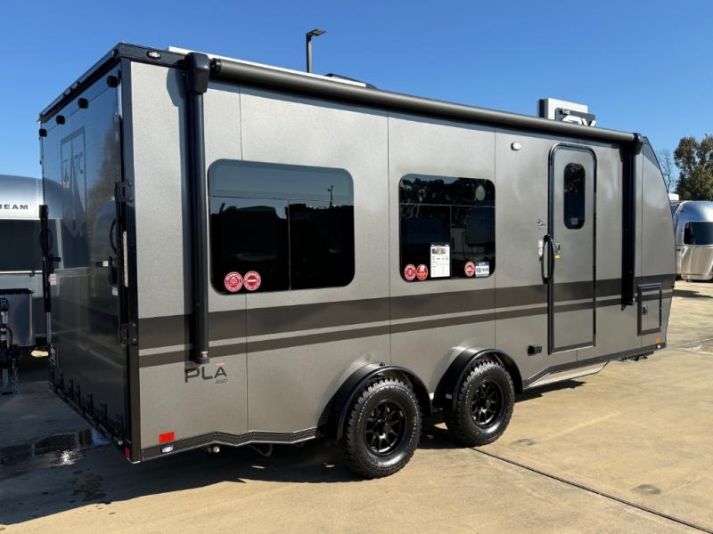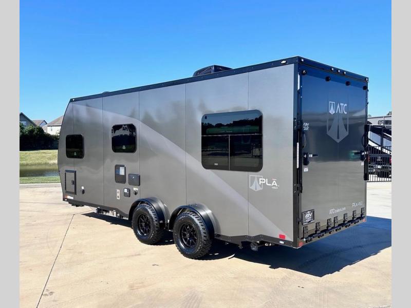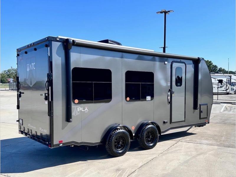 With any PLA 450 toy hauler travel trailer by ATC Trailers, you will enjoy lightweight towing and a configurable garage space for your toys, gear, and more! The all-aluminum and composite construction features no wood so you won't have to worry about rot, and the All-Weather Protection Package means you can extend your camping season. There is a 200-watt solar panel with a solar port, a heated lithium battery, plus 12V outlets to keep your adventures going. Outside, you'll find storage for your gear, a power awning with a light strip, sleek frameless dual pane tinted windows, and more convenient features. The interior is just as accommodating with decorative backsplash, configurable furniture track system, blackout roller shades, and residential solid surface countertops!