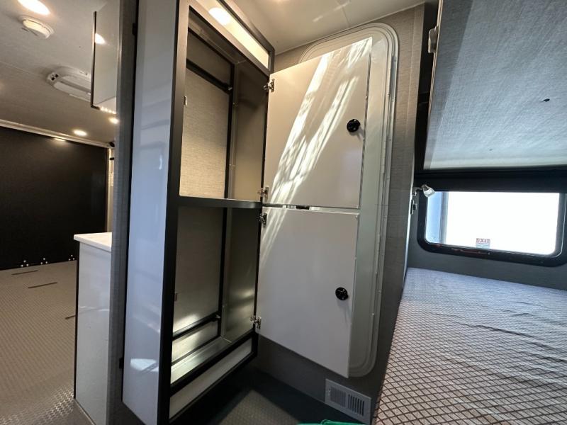 Grab your riding helmet and load up your bikes in this toy hauler! Once your toys are unloaded from the cable-less ramp door with non-slip tread, you can relax on the sofa here or make lunch in the kitchen. There is a flush mount two burner LP cooktop and a convection microwave, plus a 12V refrigerator to store leftovers. The wet bath includes a shower and porcelain toilet so you can freshen up after a trail ride, and the front bunk beds with reading lamps will let you stay up late with a good book!