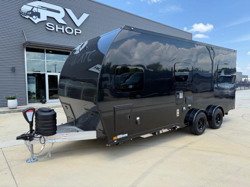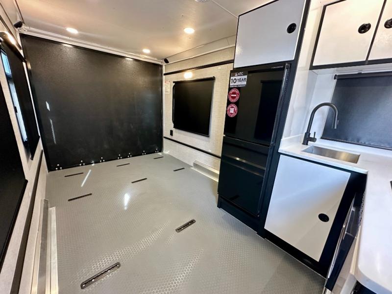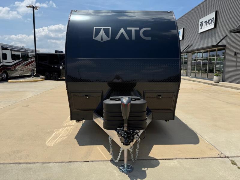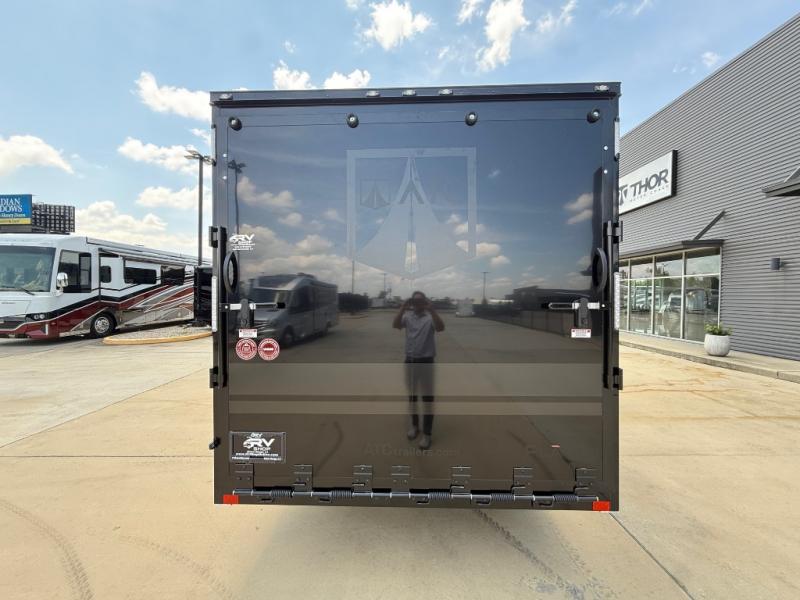 With any PLA 450 toy hauler travel trailer by ATC Trailers, you will enjoy lightweight towing and a configurable garage space for your toys, gear, and more! The all-aluminum and composite construction features no wood so you won't have to worry about rot, and the All-Weather Protection Package means you can extend your camping season. There is a 200-watt solar panel with a solar port, a heated lithium battery, plus 12V outlets to keep your adventures going. Outside, you'll find storage for your gear, a power awning with a light strip, sleek frameless dual pane tinted windows, and more convenient features. The interior is just as accommodating with decorative backsplash, configurable furniture track system, blackout roller shades, and residential solid surface countertops!