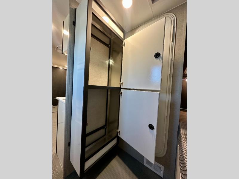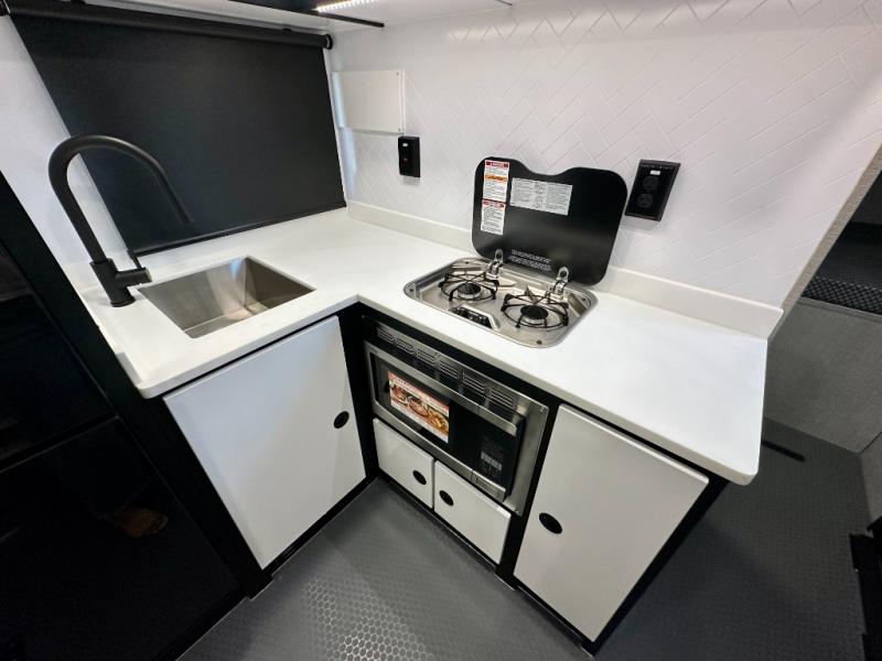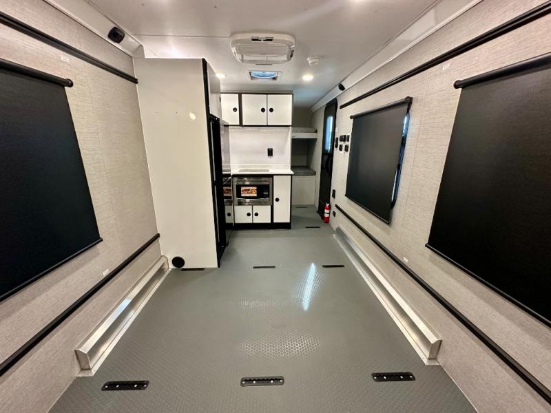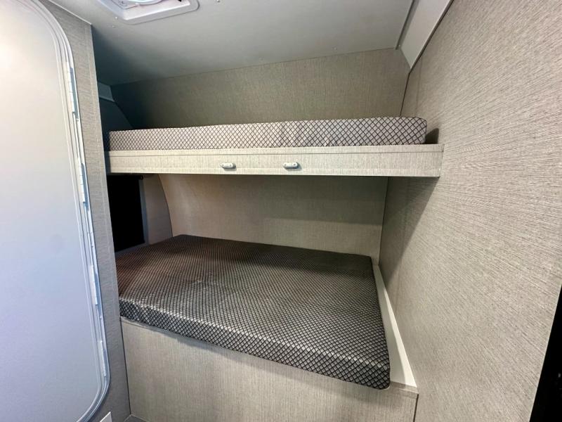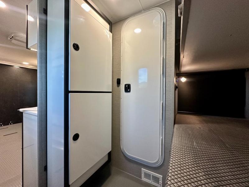 Grab your riding helmet and load up your bikes in this toy hauler! Once your toys are unloaded from the cable-less ramp door with non-slip tread, you can relax on the sofa here or make lunch in the kitchen. There is a flush mount two burner LP cooktop and a convection microwave, plus a 12V refrigerator to store leftovers. The wet bath includes a shower and porcelain toilet so you can freshen up after a trail ride, and the front bunk beds with reading lamps will let you stay up late with a good book!