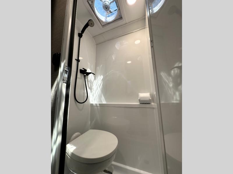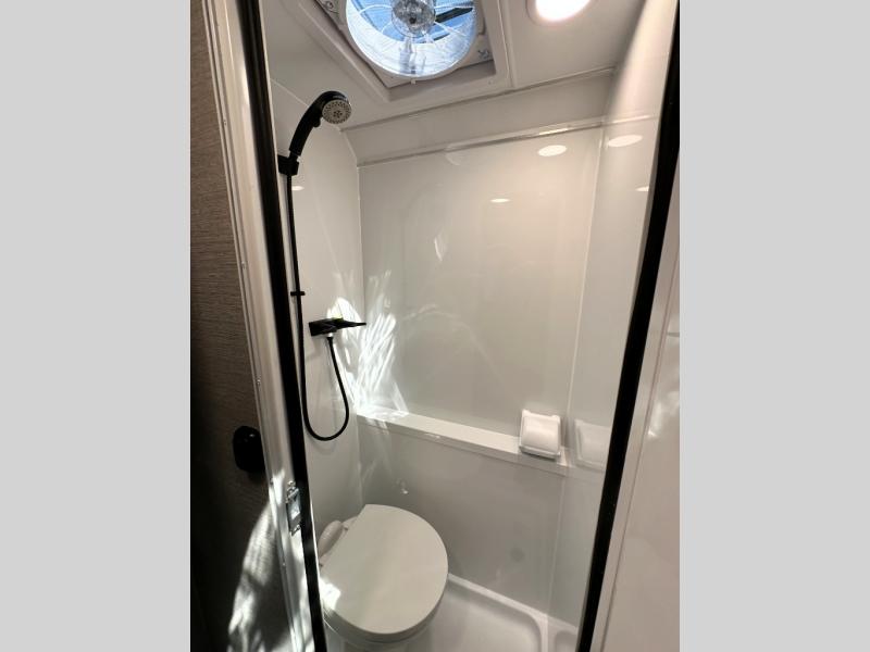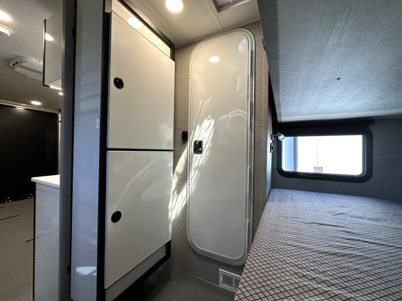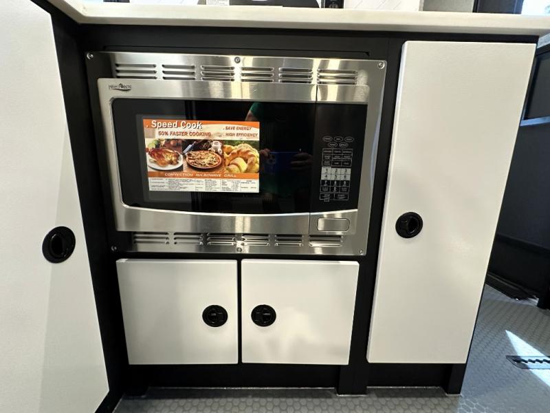 Grab your riding helmet and load up your bikes in this toy hauler! Once your toys are unloaded from the cable-less ramp door with non-slip tread, you can relax on the sofa here or make lunch in the kitchen. There is a flush mount two burner LP cooktop and a convection microwave, plus a 12V refrigerator to store leftovers. The wet bath includes a shower and porcelain toilet so you can freshen up after a trail ride, and the front bunk beds with reading lamps will let you stay up late with a good book!