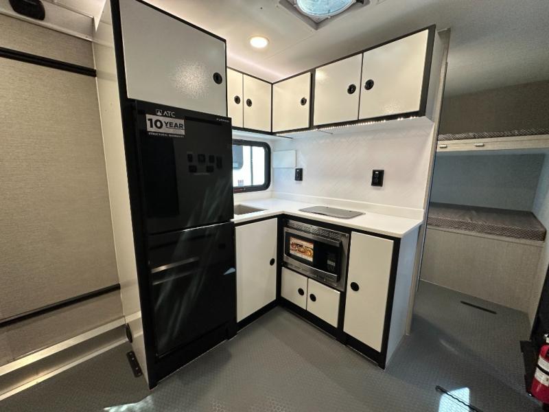 With any PLA 450 toy hauler travel trailer by ATC Trailers, you will enjoy lightweight towing and a configurable garage space for your toys, gear, and more! The all-aluminum and composite construction features no wood so you won't have to worry about rot, and the All-Weather Protection Package means you can extend your camping season. There is a 200-watt solar panel with a solar port, a heated lithium battery, plus 12V outlets to keep your adventures going. Outside, you'll find storage for your gear, a power awning with a light strip, sleek frameless dual pane tinted windows, and more convenient features. The interior is just as accommodating with decorative backsplash, configurable furniture track system, blackout roller shades, and residential solid surface countertops!