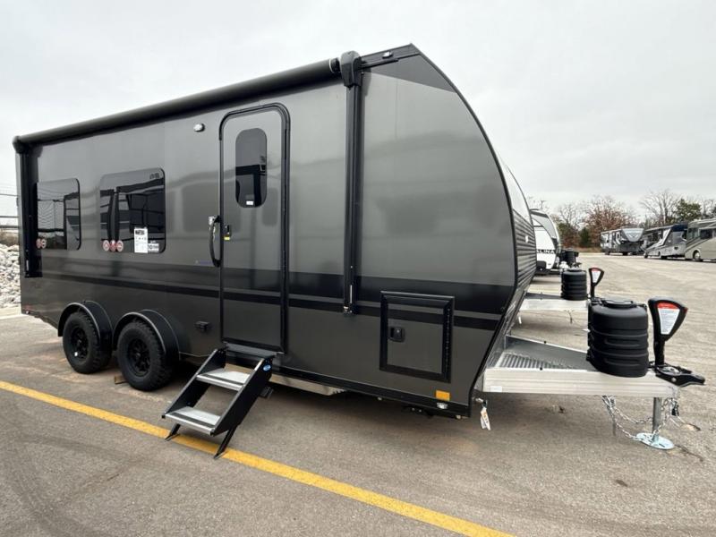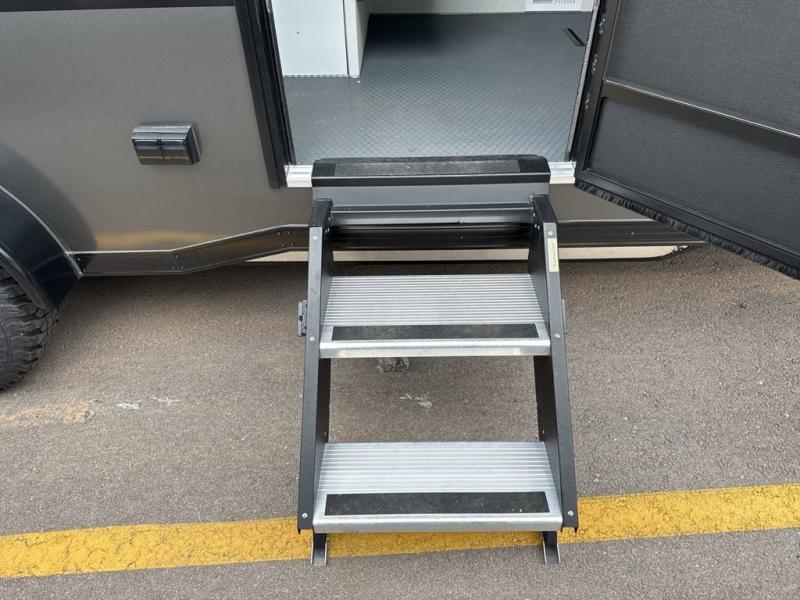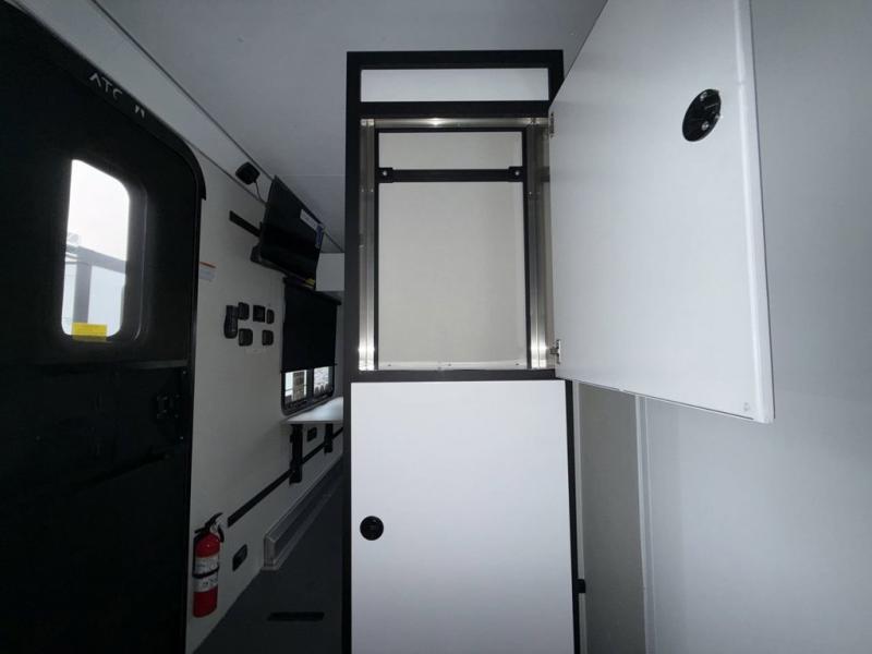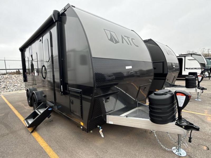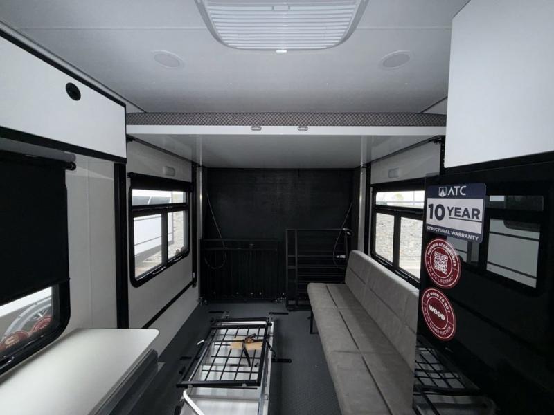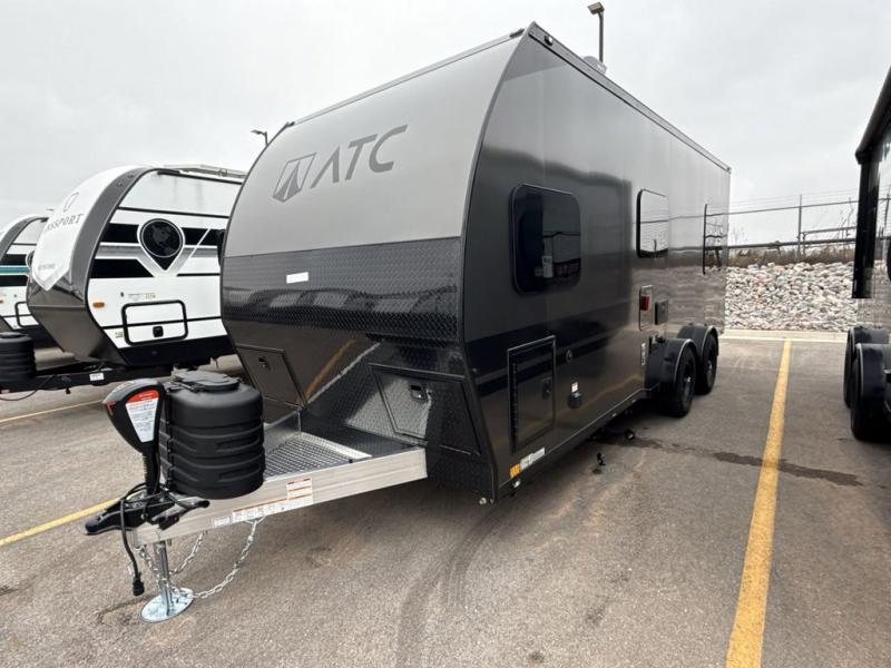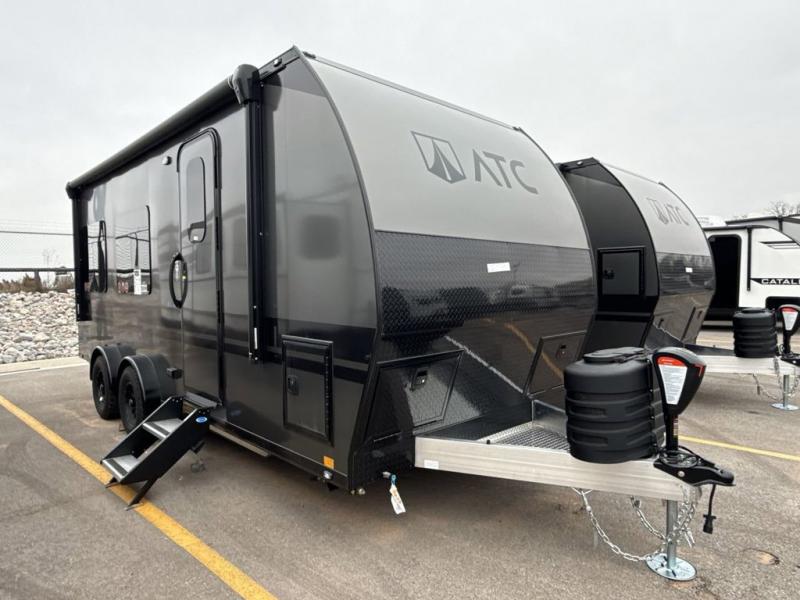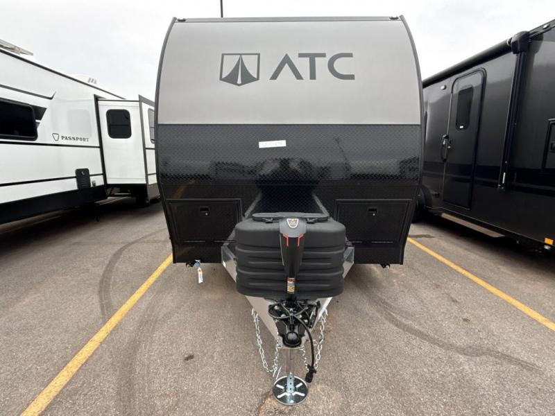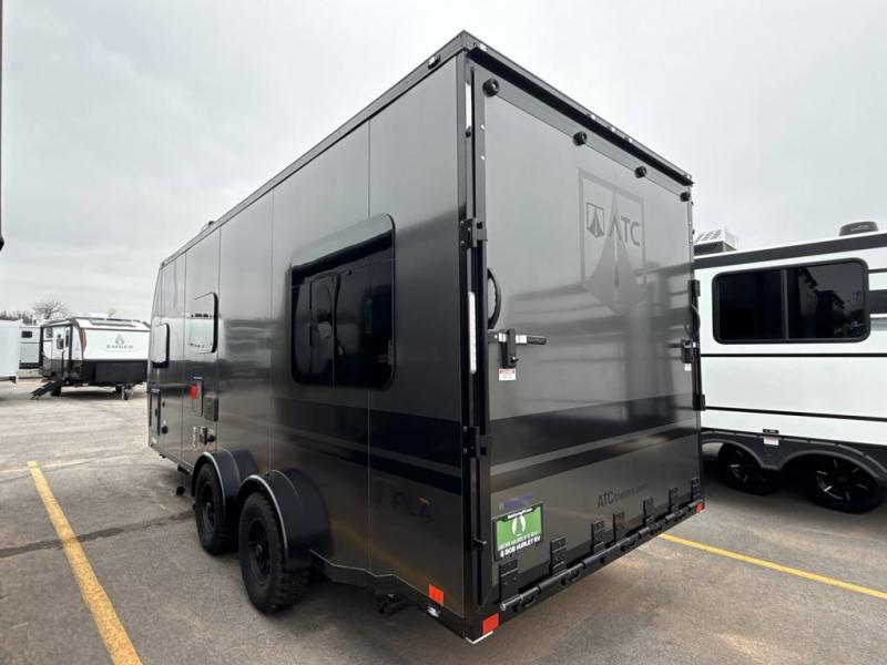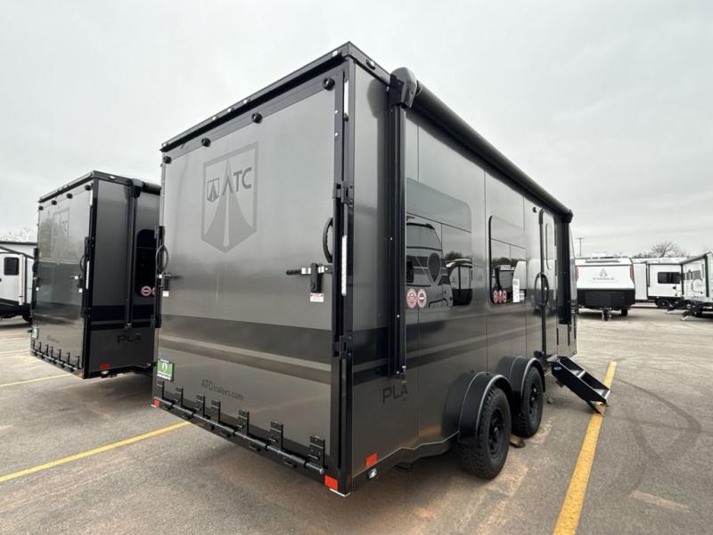 With any PLA 450 toy hauler travel trailer by ATC Trailers, you will enjoy lightweight towing and a configurable garage space for your toys, gear, and more! The all-aluminum and composite construction features no wood so you won't have to worry about rot, and the All-Weather Protection Package means you can extend your camping season. There is a 200-watt solar panel, a 100-watt inverter, and 120V/USB outlets to keep your adventures going. Outside, you'll find storage for your gear, a power awning with a light strip, sleek frameless dual pane windows, and more convenient features. The interior is just as accommodating with aluminum cabinets, dimmable can ceiling lights, configurable furniture track system, and solid surface countertops!
