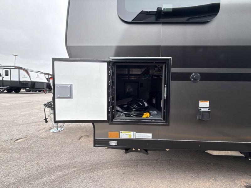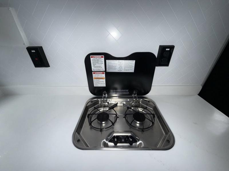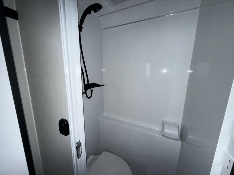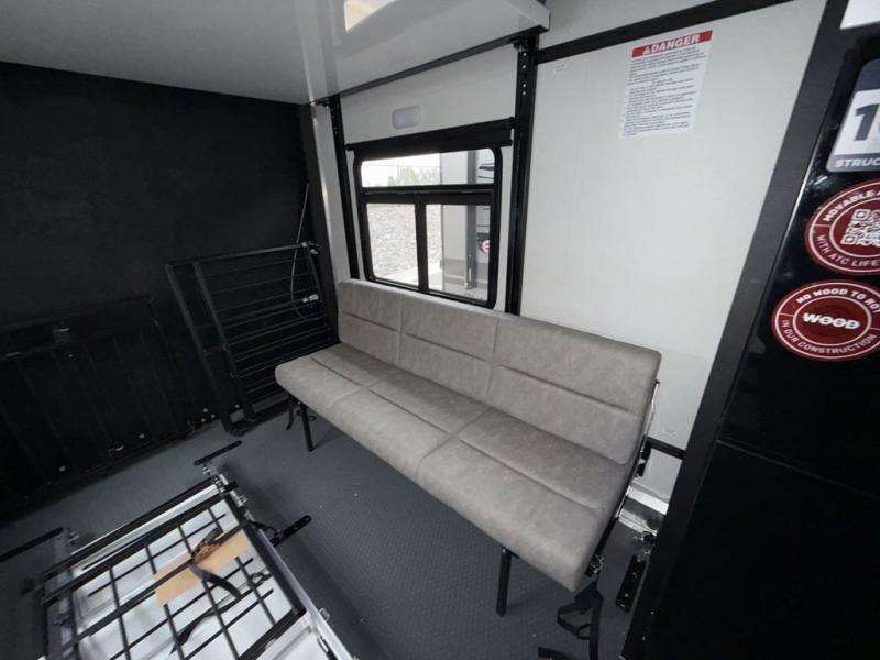 Grab your riding helmet and load up your bikes in this toy hauler! Once your toys are unloaded from the cable-less ramp door with non-slip tread, you can add an optional sleeper sofa to relax, then make lunch in the kitchen. There is a flush mount two burner LP cooktop and a convection microwave, plus a 12V refrigerator to store leftovers. The wet bath includes a shower and porcelain toilet so you can freshen up after a trail ride, and the front bunk beds will provide a great night's rest. And an optional Happijac queen bed can be added in the garage for even more sleeping space if needed!