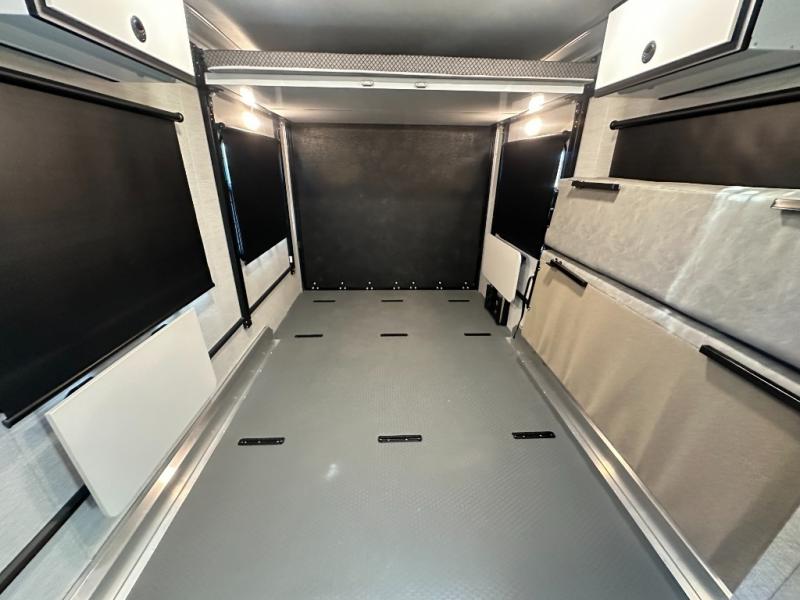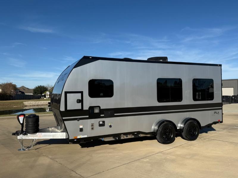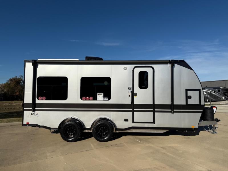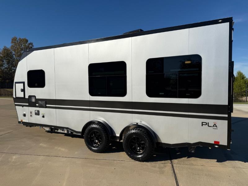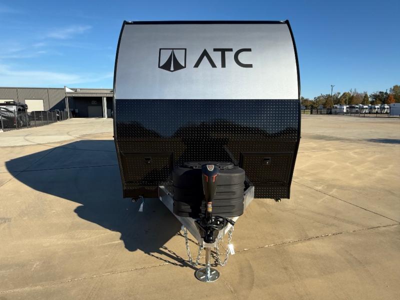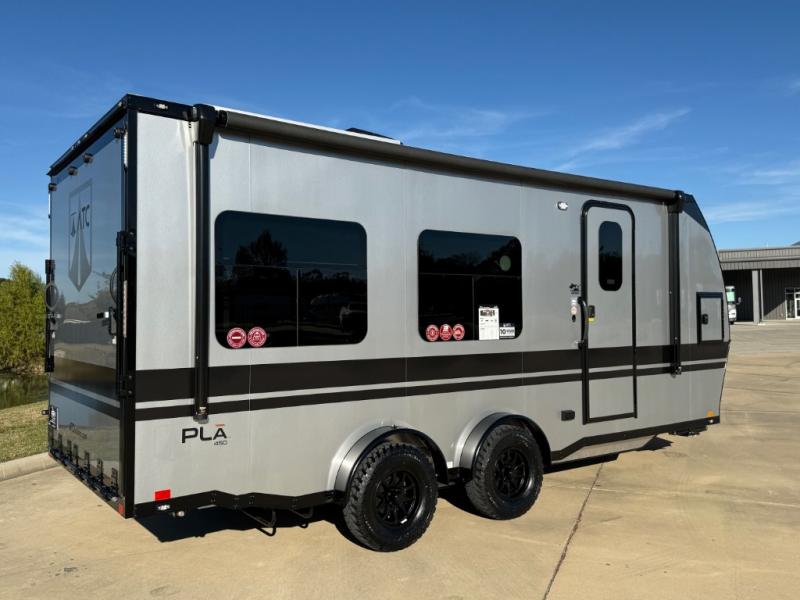 With any PLA 450 toy hauler travel trailer by ATC Trailers, you will enjoy lightweight towing and a configurable garage space for your toys, gear, and more! The all-aluminum and composite construction features no wood so you won't have to worry about rot, and the All-Weather Protection Package means you can extend your camping season. There is a 200-watt solar panel, a 100-watt inverter, and 120V/USB outlets to keep your adventures going. Outside, you'll find storage for your gear, a power awning with a light strip, sleek frameless dual pane windows, and more convenient features. The interior is just as accommodating with aluminum cabinets, dimmable can ceiling lights, configurable furniture track system, and solid surface countertops!