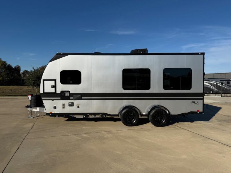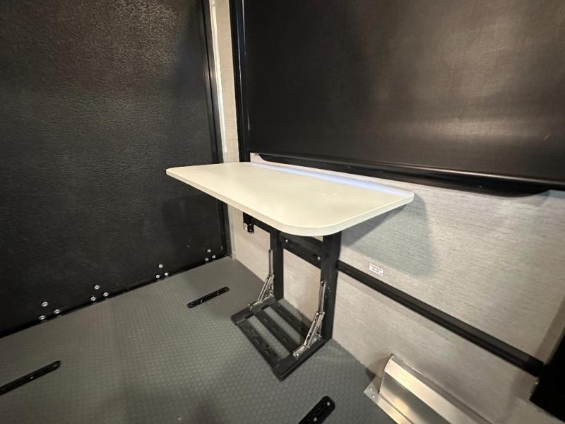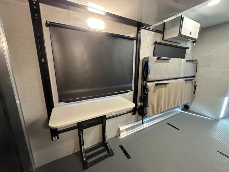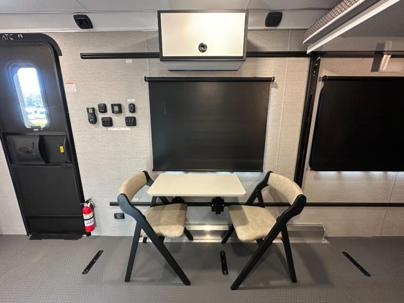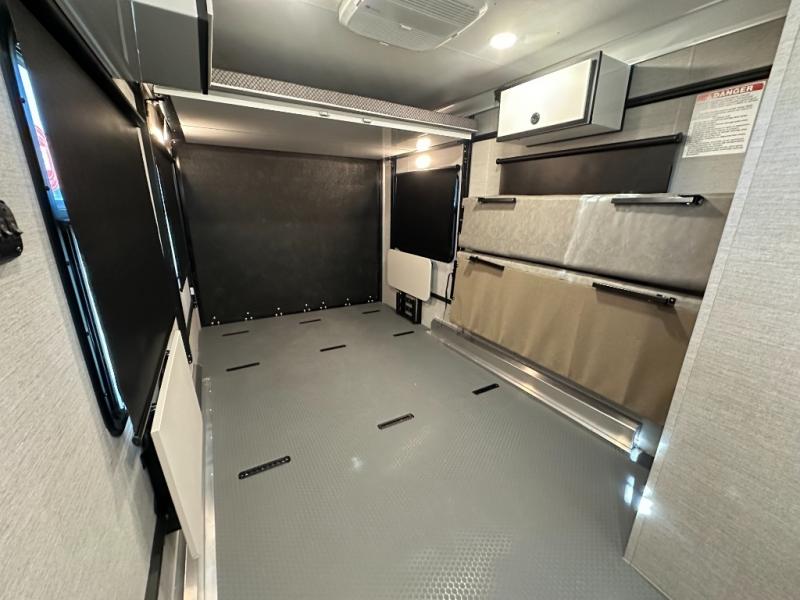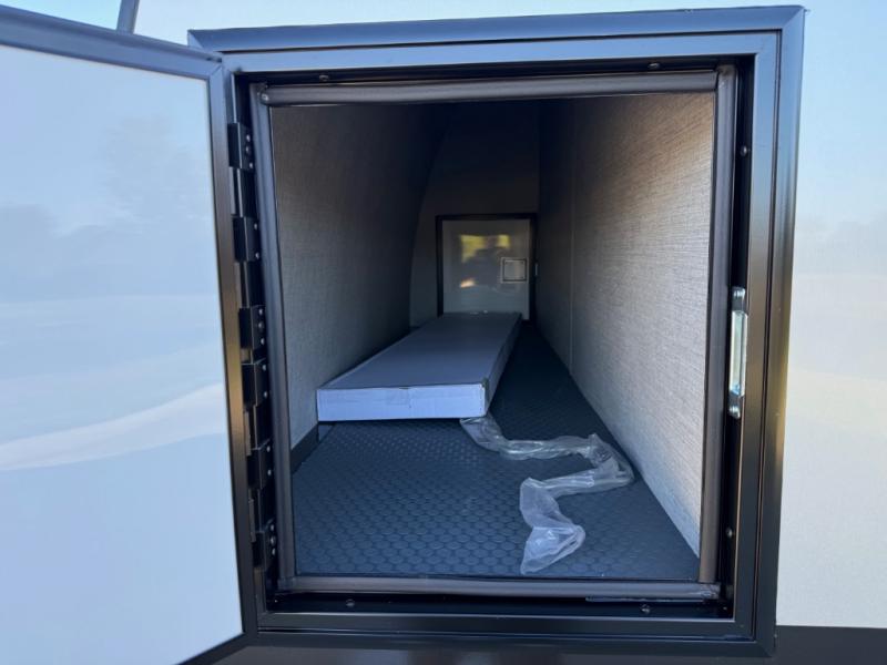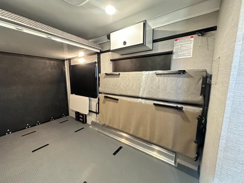 With any PLA 450 toy hauler travel trailer by ATC Trailers, you will enjoy lightweight towing and a configurable garage space for your toys, gear, and more! The all-aluminum and composite construction features no wood so you won't have to worry about rot, and the All-Weather Protection Package means you can extend your camping season. There is a 200-watt solar panel, a 100-watt inverter, and 120V/USB outlets to keep your adventures going. Outside, you'll find storage for your gear, a power awning with a light strip, sleek frameless dual pane windows, and more convenient features. The interior is just as accommodating with aluminum cabinets, dimmable can ceiling lights, configurable furniture track system, and solid surface countertops!