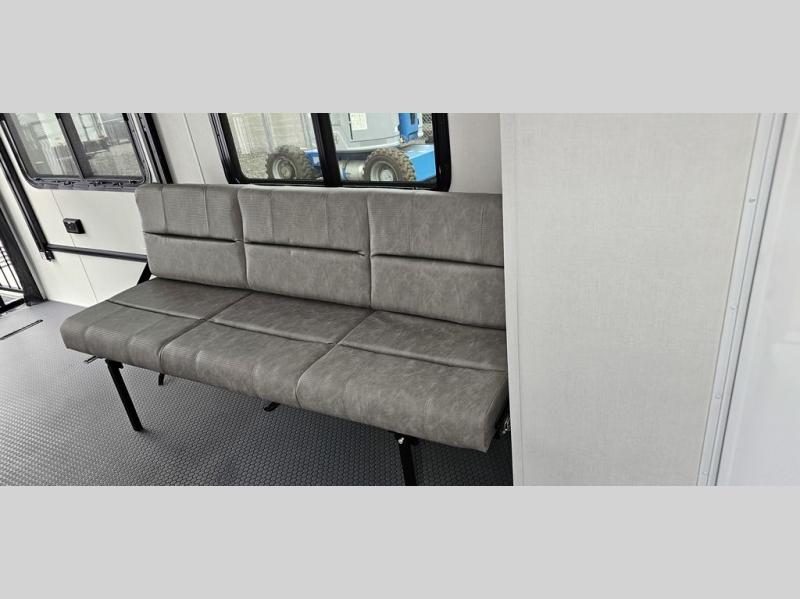 If you're ready to escape your busy weeks for weekends at the lake, this toy hauler is for you! Your kayaks will fit perfectly when you use the space all the way up to the front kitchen, and there is a cable-less rear ramp door for easy unloading. There is also an Airline Track tie-down system to keep your gear secure, and an optional Happijac queen bed can be added if you need additional sleeping space other than the sleeper sofa. The front kitchen includes a two-burner cooktop, a convection microwave, and a 12V refrigerator to keep cold items fresh.