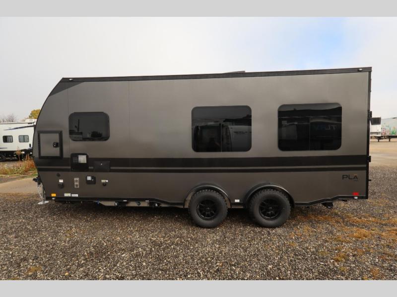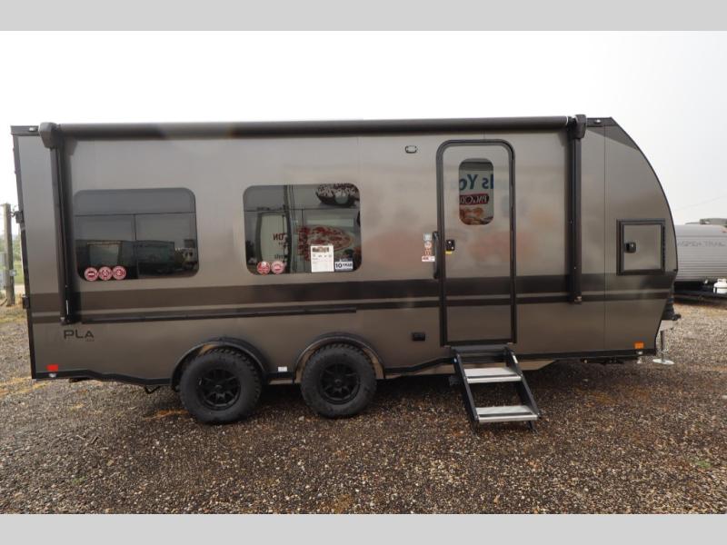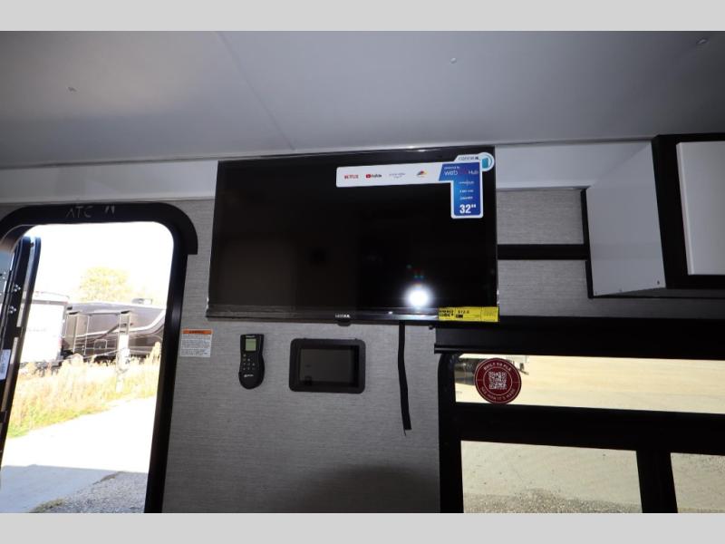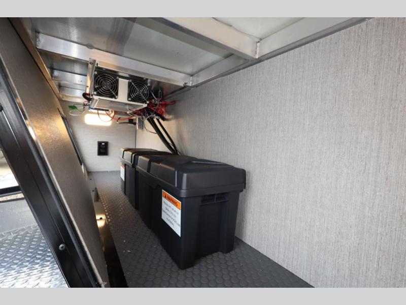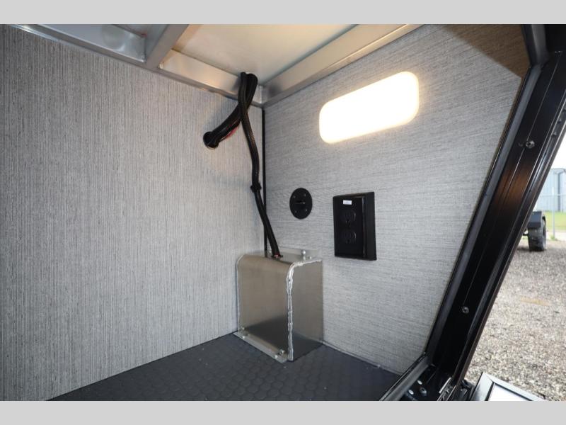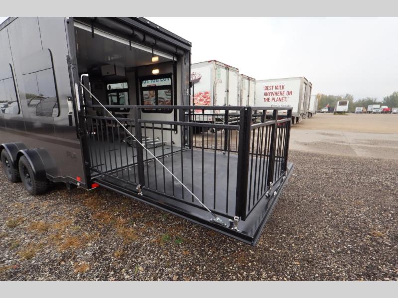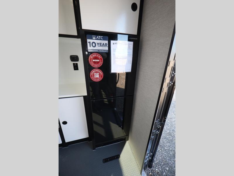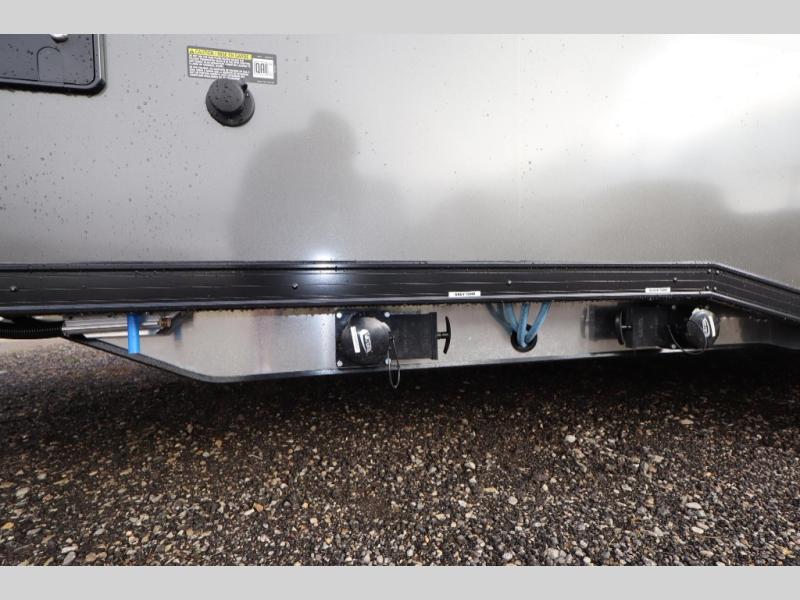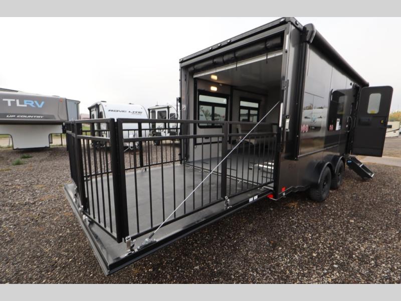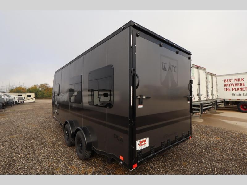With any PLA 450 toy hauler travel trailer by ATC Trailers, you will enjoy lightweight towing and a configurable garage space for your toys, gear, and more! The all-aluminum and composite construction features no wood so you won't have to worry about rot, and the All-Weather Protection Package means you can extend your camping season. There is a 400-watt solar panel, a 2000-watt inverter, and 120V/USB outlets to keep your adventures going. Outside, you'll find storage for your gear, a power awning with a light strip, sleek frameless dual pane windows, and more convenient features. The interior is just as accommodating with aluminum cabinets, dimmable can ceiling lights, configurable furniture track system, and solid surface countertops!
