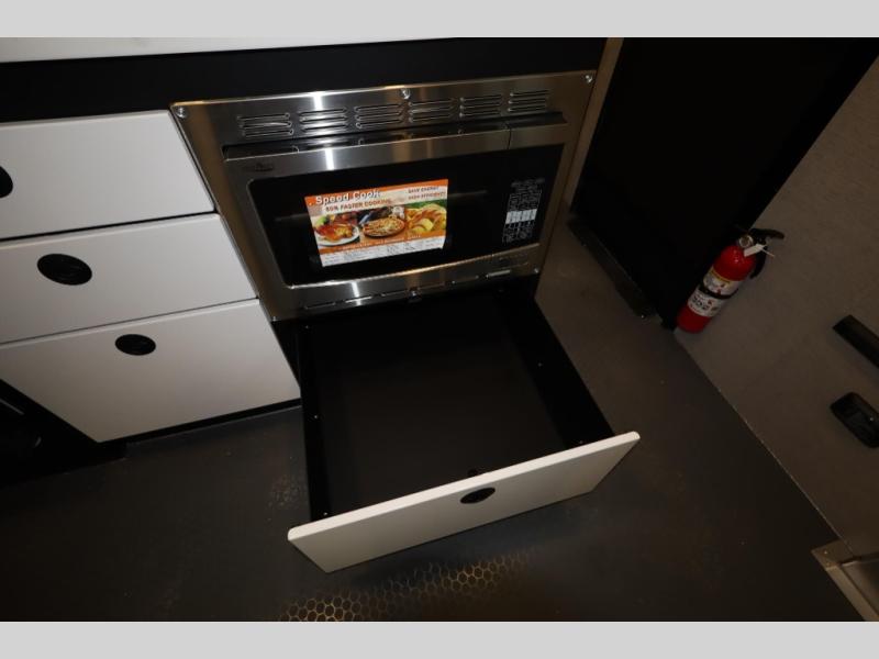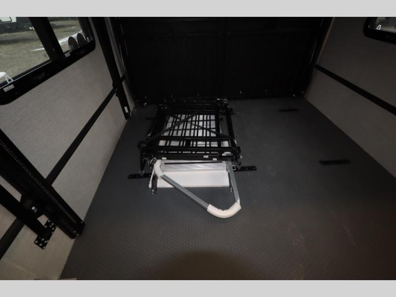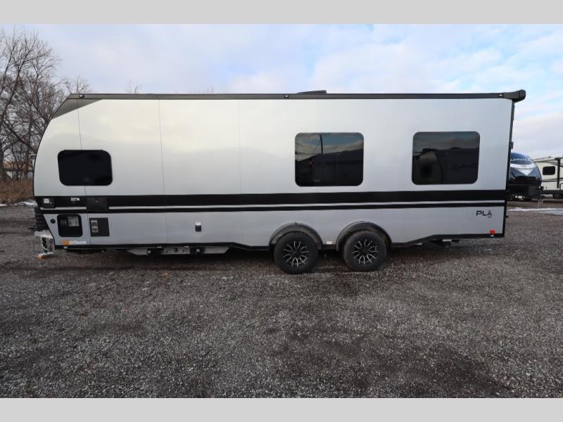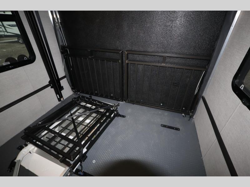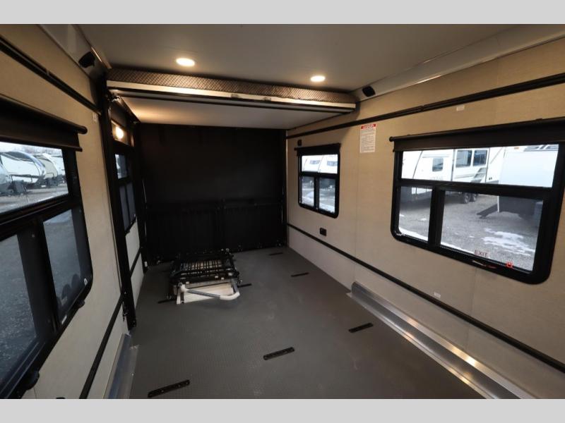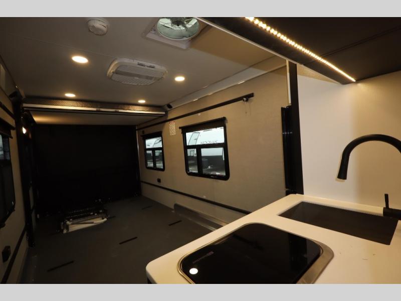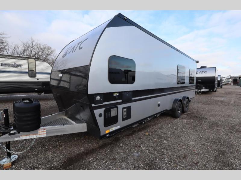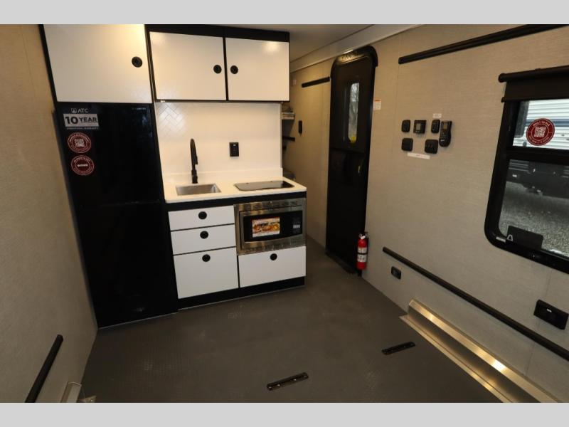 With any PLA 450 toy hauler travel trailer by ATC Trailers, you will enjoy lightweight towing and a configurable garage space for your toys, gear, and more! The all-aluminum and composite construction features no wood so you won't have to worry about rot, and the All-Weather Protection Package means you can extend your camping season. There is a 200-watt solar panel, a 1000-watt inverter, and 120V/USB outlets to keep your adventures going. Outside, you'll find storage for your gear, a power awning with a light strip, sleek frameless dual pane windows, and more convenient features. The interior is just as accommodating with aluminum cabinets, dimmable can ceiling lights, configurable furniture track system, and solid surface countertops!