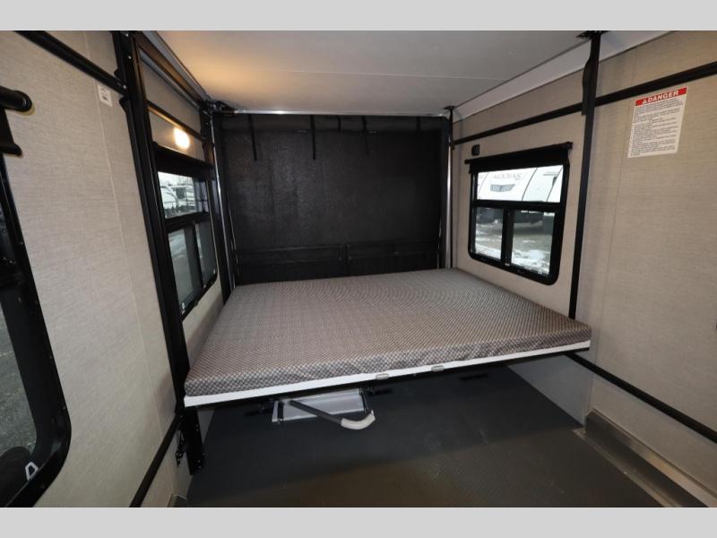 This toy hauler travel trailer is perfect for outdoor enthusiasts and thrill-seekers. The 15' garage is the ideal space for hauling your favorite toys, whether it's ATVs, dirt bikes, or kayaks. With plenty of room to store your gear, you'll be ready for whatever adventure comes your way. Enjoy cooking up a storm with the cooktop, microwave, and fridge. The sink provides a convenient spot for cleaning up after a long day of play. The wet bath is a practical and efficient space for getting cleaned up, and the bunk beds provide a comfortable spot to rest and relax after a long day of play.