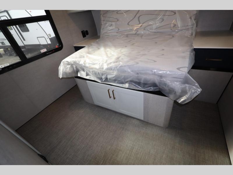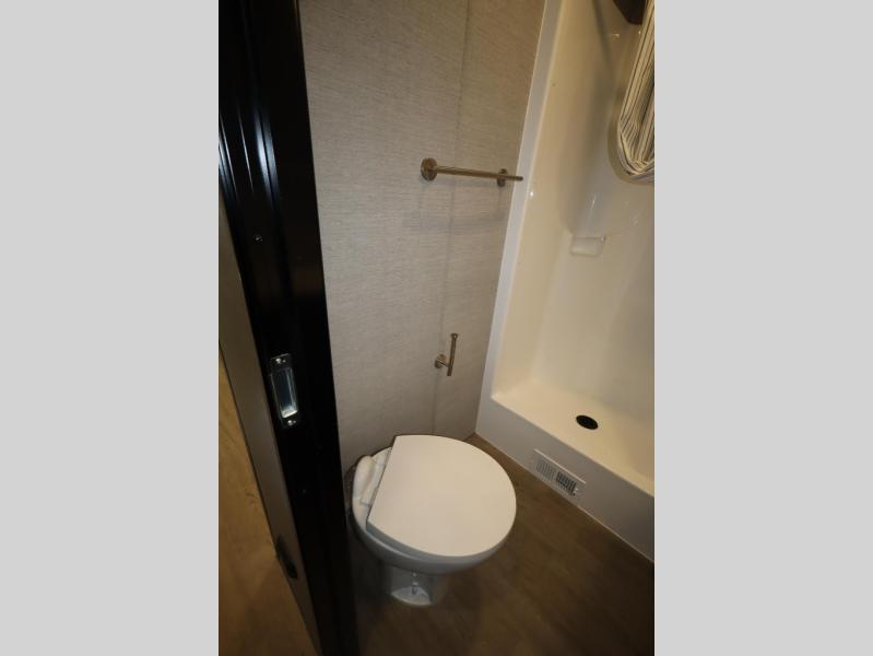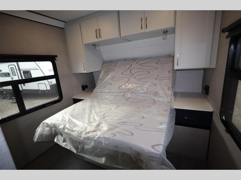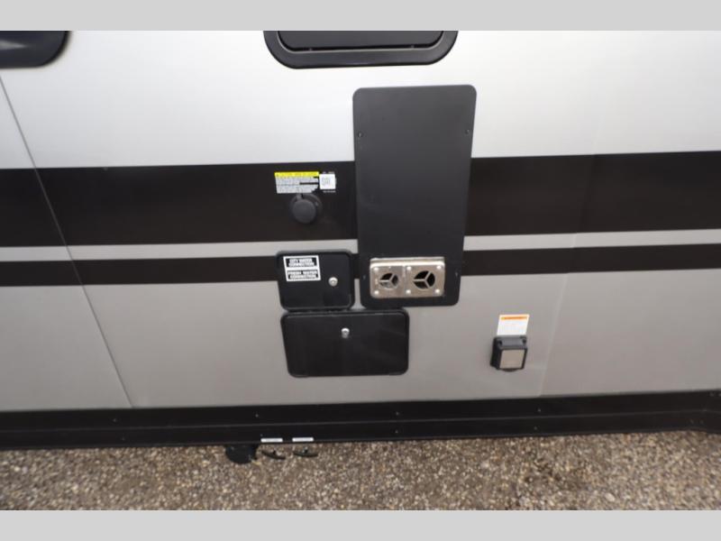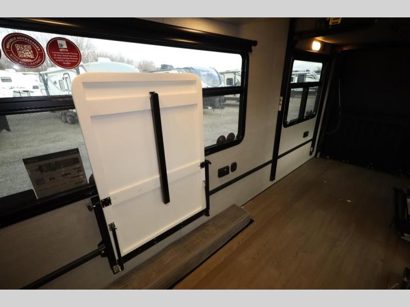 Time spent in this toy hauler will be time well spent! There is 15' 7" total garage space for your toys plus a cableless rear ramp door for easy unloading. You can whip up a meal on the LP two burner cooktop or in the convection microwave when you get back from trail riding, and the 10-cu. ft. 12V refrigerator will keep your food fresh. There is also a dinette table with four folding chairs where you can dine together. A full bath lets you clean up before bed, and you'll find a front private bedroom with a queen bed for all-around comfort!