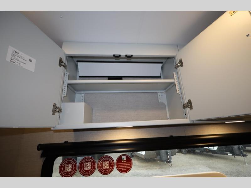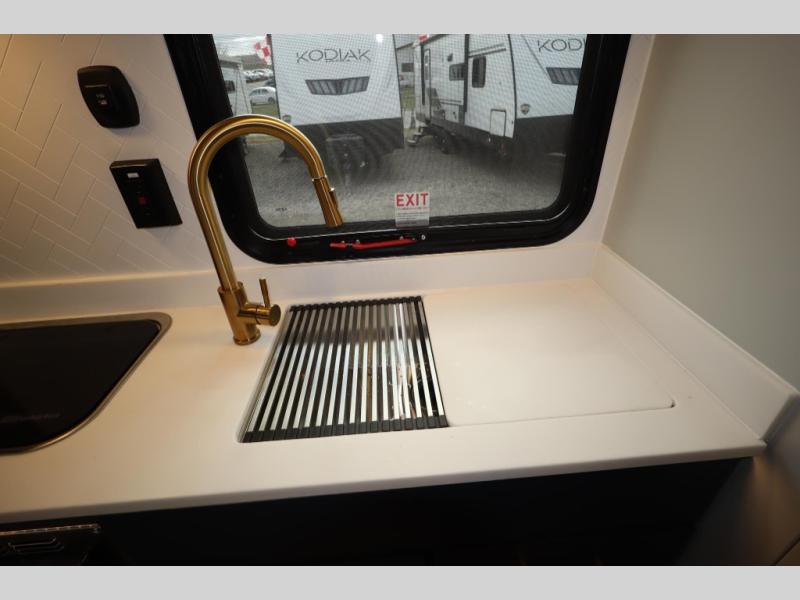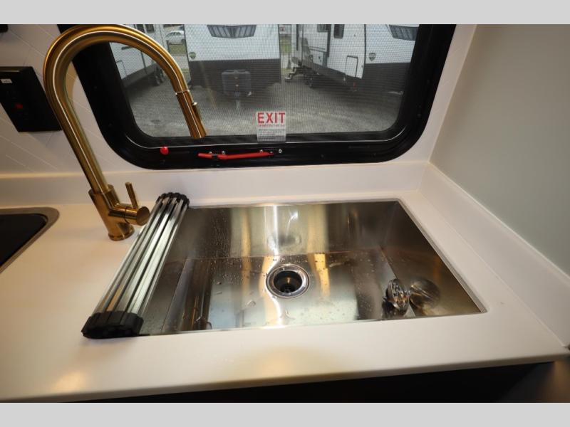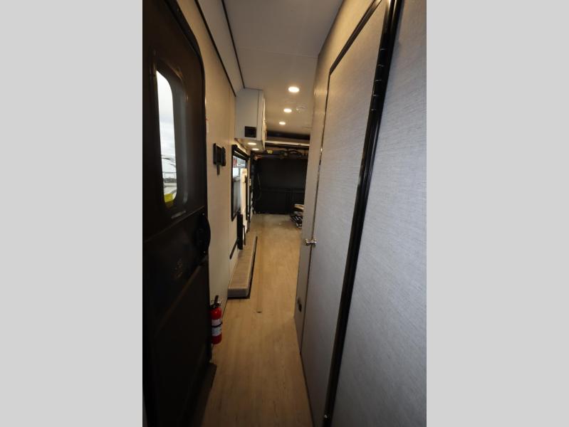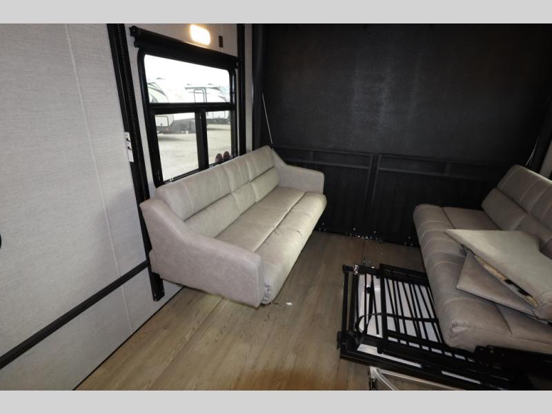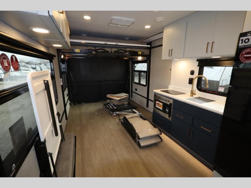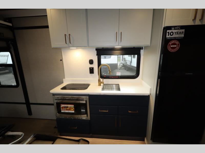 The PLA 550 toy hauler travel trailers by ATC Trailers are built for the long haul with a fully integrated aluminum frame, a one-piece aluminum roof, composite ramp door, and an enclosed underbelly. There is an electric tongue jack outside, along with a pass-through storage, power awning with a light strip, and electric scissor jacks for easy set up. The LifeTrac modular component system will let you configure your garage space how you need it, and there are three rows of Airline tracks with covers to secure your gear. You will also love the interior with its aluminum cabinets with solid surface countertops, dimmable can ceiling lights, and composite with commercial-grade vinyl flooring to name a few comforts!