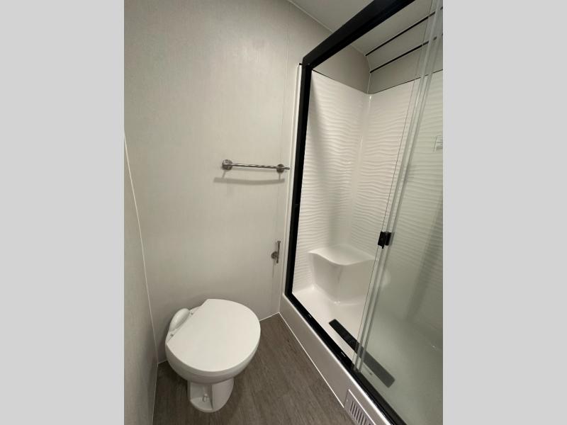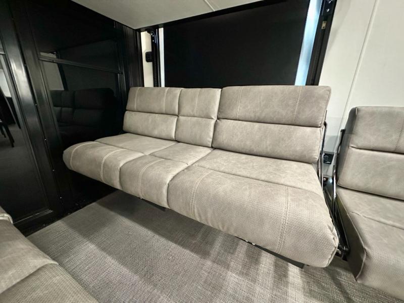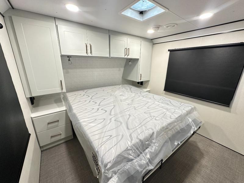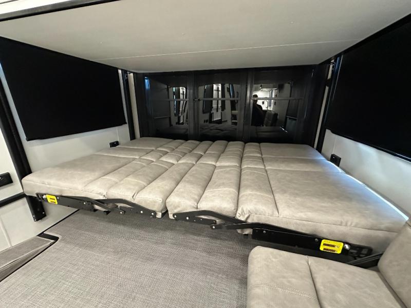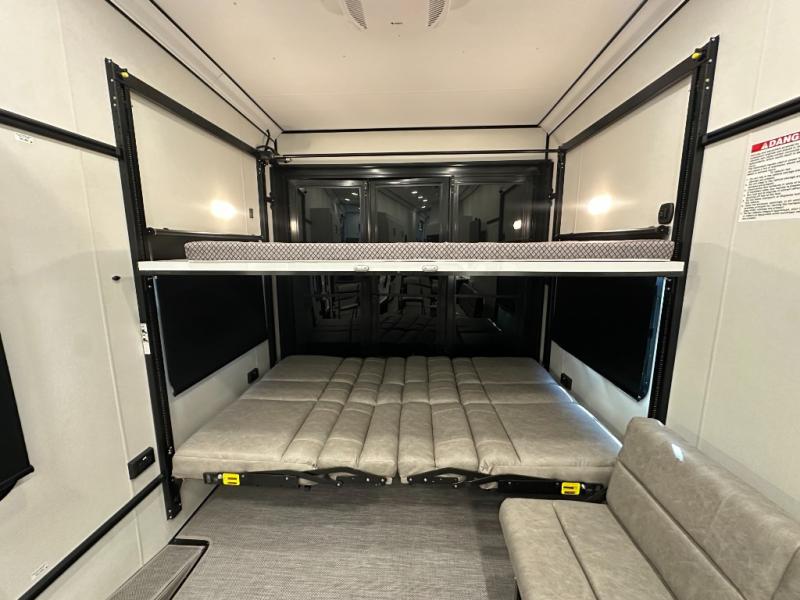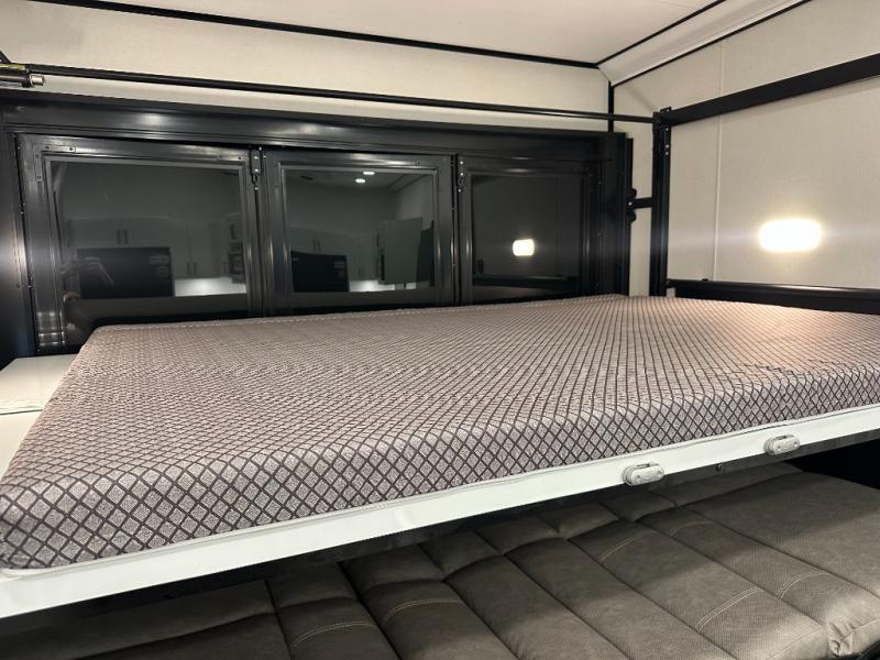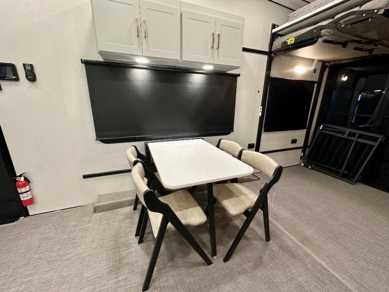 Start a new adventure in this spacious toy hauler that can sleep 2-10 depending on the options you choose to add! Once your toys are unloaded using the cableless rear ramp door, you can head out on a trail or two. You'll find a residential queen bed with storage in the front bedroom, along with storage space for your things and TV prep if you want to add a television. The full bath includes a spa/jet shower fixture that is sure to be nice after a day of riding the trails, and there is a glass shower door for added luxury. Head to the kitchen where you can whip up a meal for your crew on the LP three burner cooktop or in the convection microwave, and you can dine at the dinette with four chairs. If you'd like to get some fresh air, take your plate outdoors to sit under the power awning with a light strip!