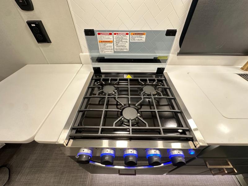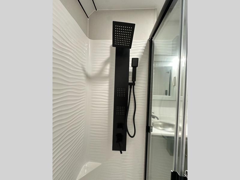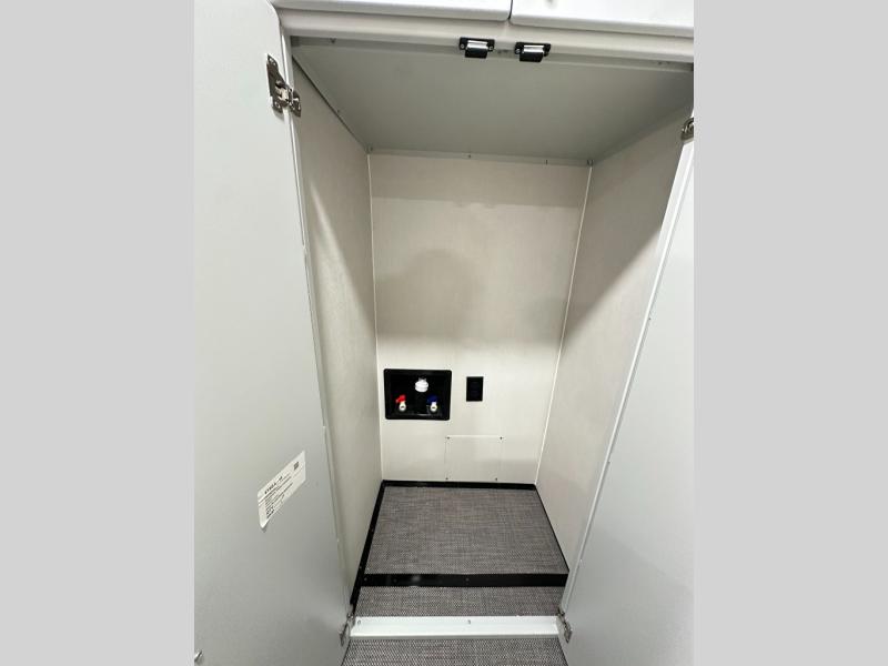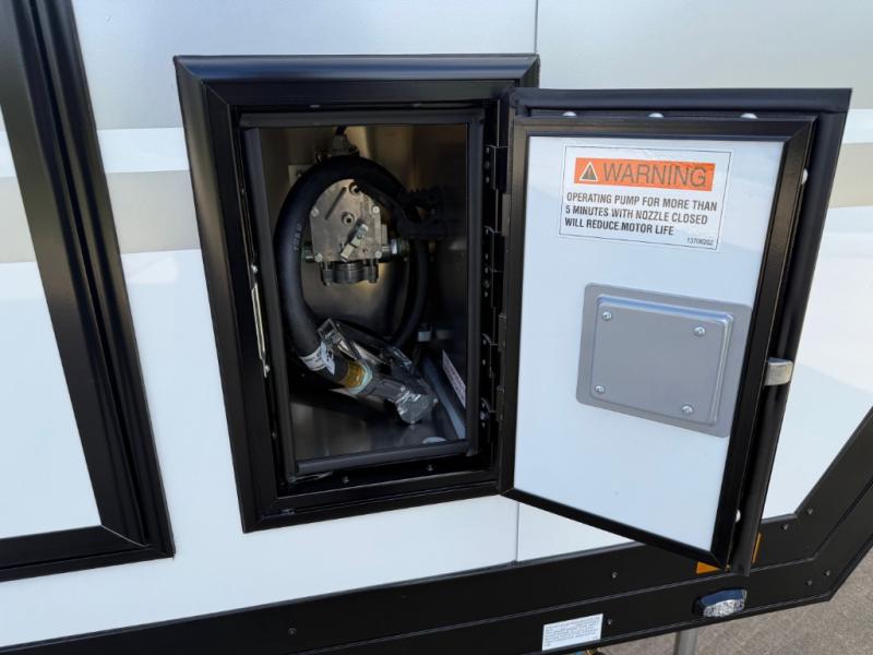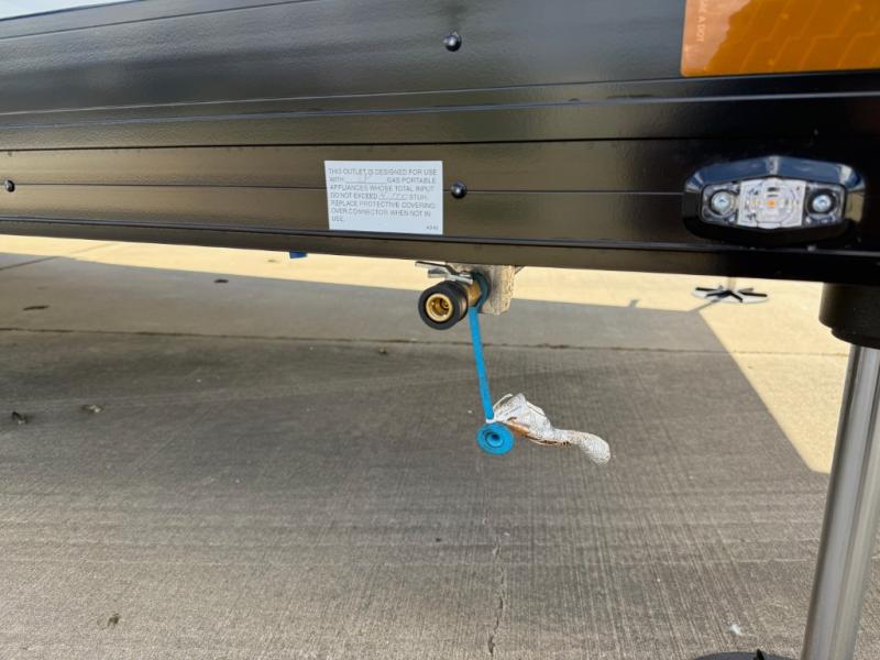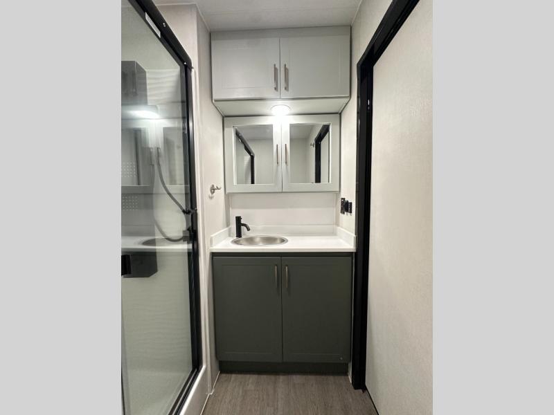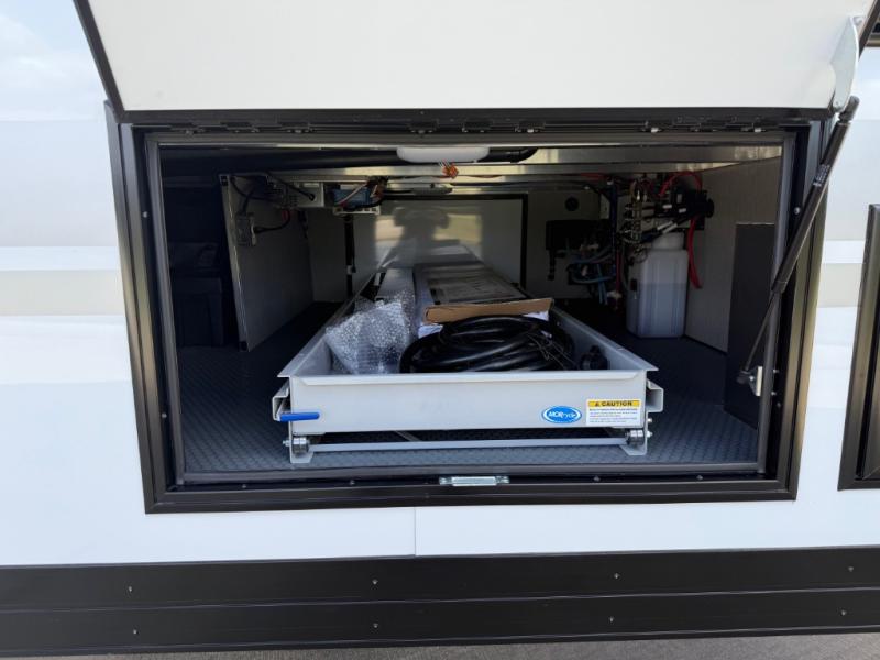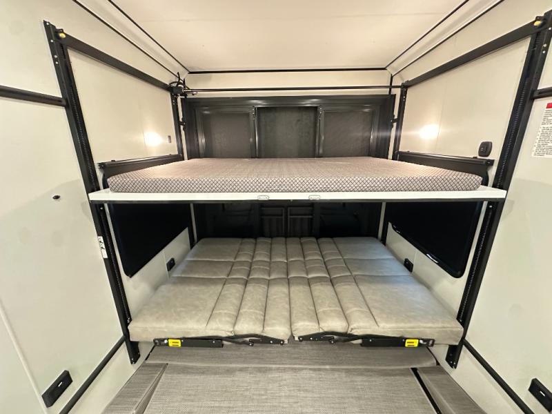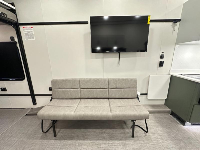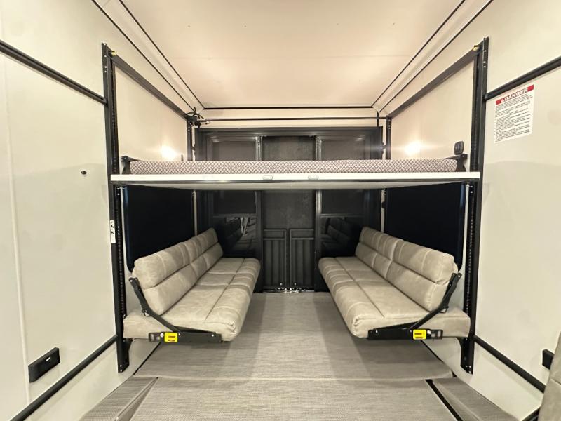 Start a new adventure in this spacious toy hauler that can sleep 2-12 depending on the options you choose to add! Once your toys are unloaded using the cableless rear ramp door, you can head out on a trail or two. You'll find a residential queen bed with storage in the front bedroom, along with a large front closet and TV prep if you want to add a television. The full bath includes a spa/jet shower fixture that is sure to be nice after a day of riding the trails, and there is a glass shower door for added luxury. Head to the kitchen where you can whip up a meal for your crew on the LP three burner cooktop or in the convection microwave, and you can dine at the dinette with four chairs. If you'd like to get some fresh air, take your plate outdoors to sit under the power awning with a light strip!