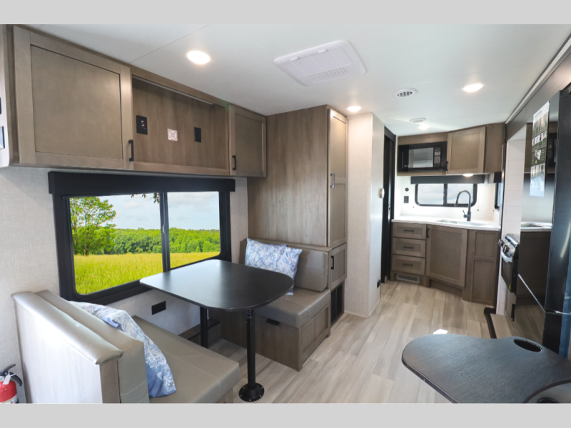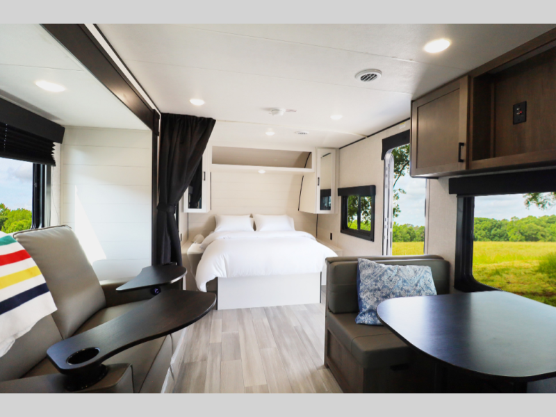 Sleeps up to 4 — includes front bed and convertible dinette or lounge seating.
