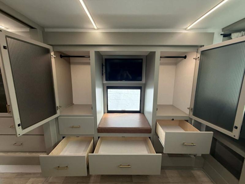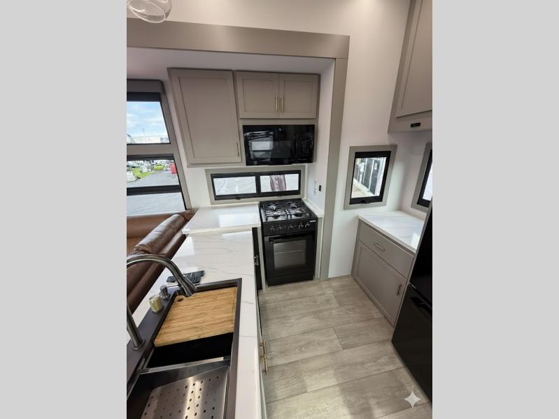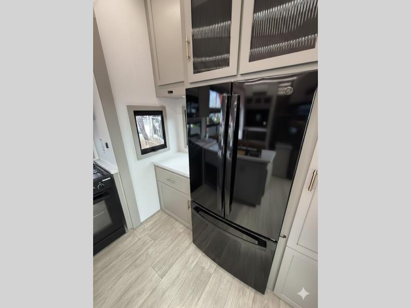 Inside, you’ll find a true residential-style kitchen with solid surface countertops, hardwood cabinetry with hidden hinges, a 22 cu. ft. 12V refrigerator, and The Ultimate Kitchen Sink—built to look and function like home, not a camper.