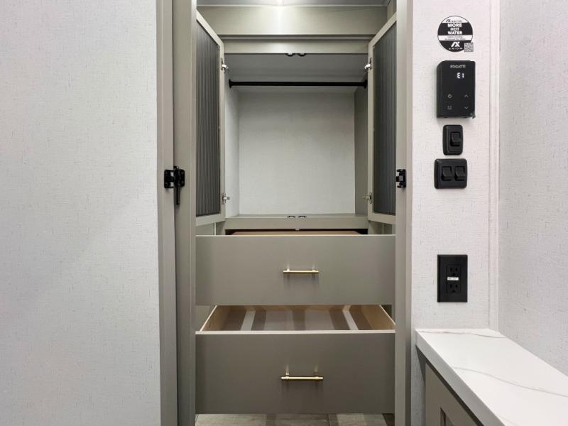 With any Imperium fifth wheel by Axiom RV, you will find comfort at every turn! The Curt touring coil suspension system with a Curt coil pin box provides smooth towing from home to campground, and the Lippert 6-point hydraulic leveling system will make set up a breeze. There are also Lippert solid step triple entry steps, a Pathfinder lighting system integrated within the turn signals, an extended latch entry door lock system, and a 200-watt solar panel for off-grid capabilities. These features are found within the Lux Package and Essential Package, while the AX Comfort Package includes hardwood cabinet doors and solid surface kitchen countertops. There is also a Fogotti on-demand water heater, a Freedom pass-through storage, and sleek tinted frameless windows. Available options that can be chosen include a second solar panel, a Splendide washer/dryer, a 6K LP generator, and more!