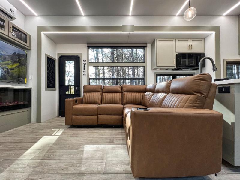 Trips are made complete in this spacious, rear kitchen fifth wheel! There is ample counter space to prep meals, plus a JBL party box so you can listen to your favorite tunes as you cook. The dinette table with two seats provides a place to dine together, and the living area includes a large sofa plus a second, L-shaped sofa with a patent pending AX ottoman/table. A full bath lets you freshen up each day, and a front private bedroom with a king bed tilt lets you stay up late with a book!