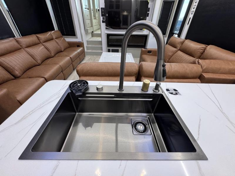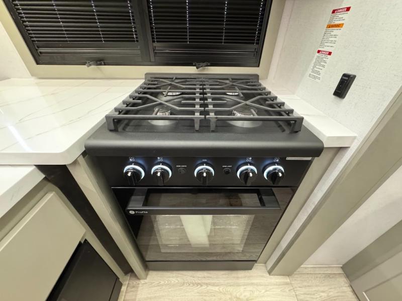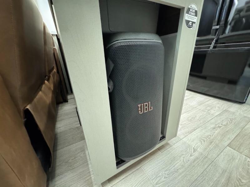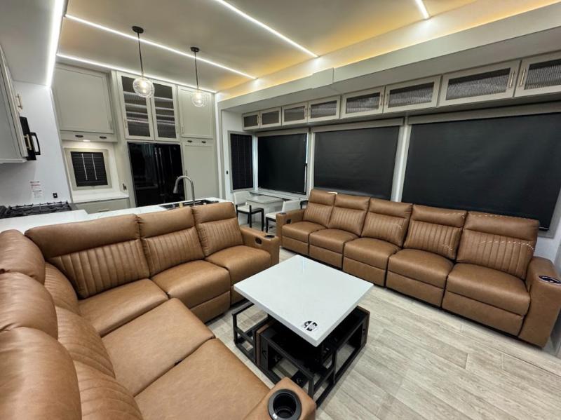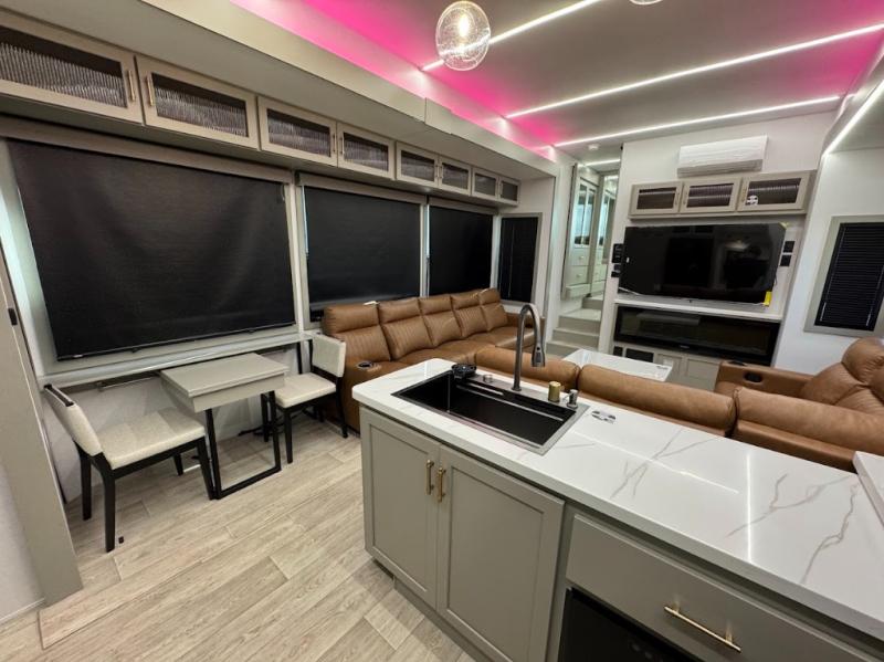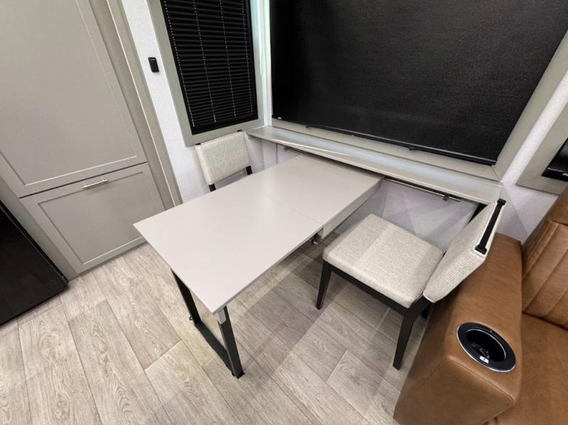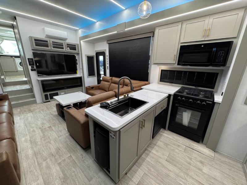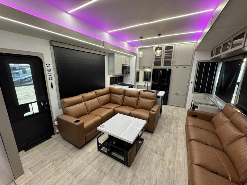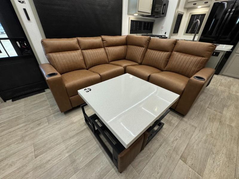 Trips are made complete in this spacious, rear kitchen fifth wheel! There is ample counter space to prep meals, plus a JBL party box so you can listen to your favorite tunes as you cook. The dinette table with two seats provides a place to dine together, and the living area includes a large sofa plus a second, L-shaped sofa with a patent pending AX ottoman/table. A full bath lets you freshen up each day, and a front private bedroom with a king bed tilt lets you stay up late with a book!