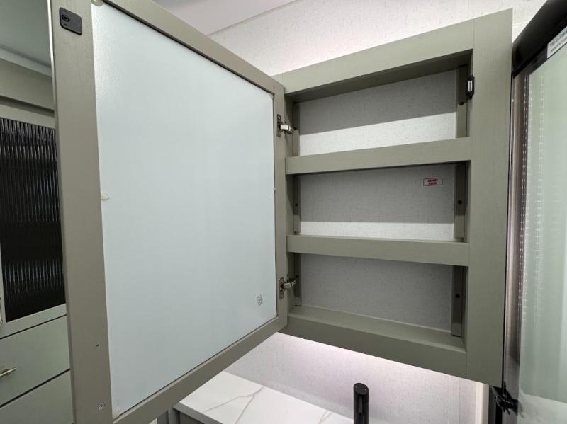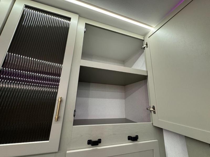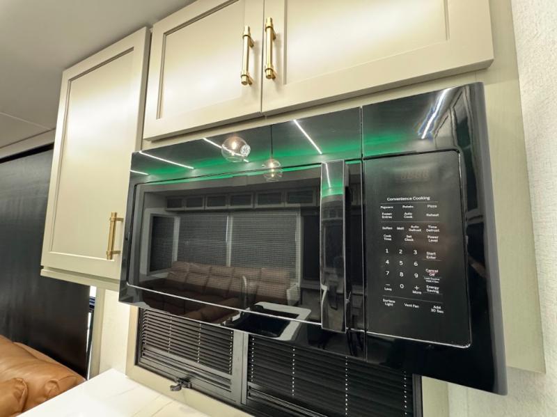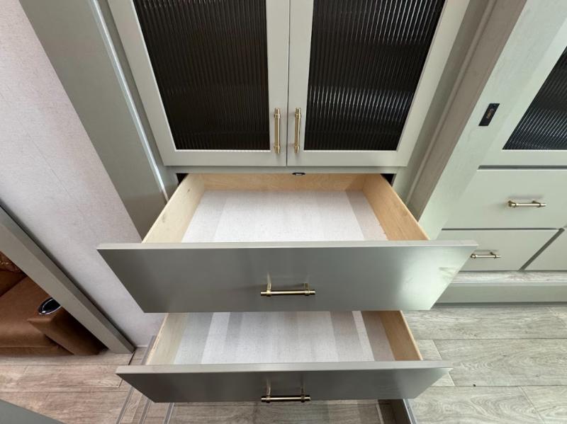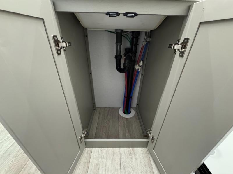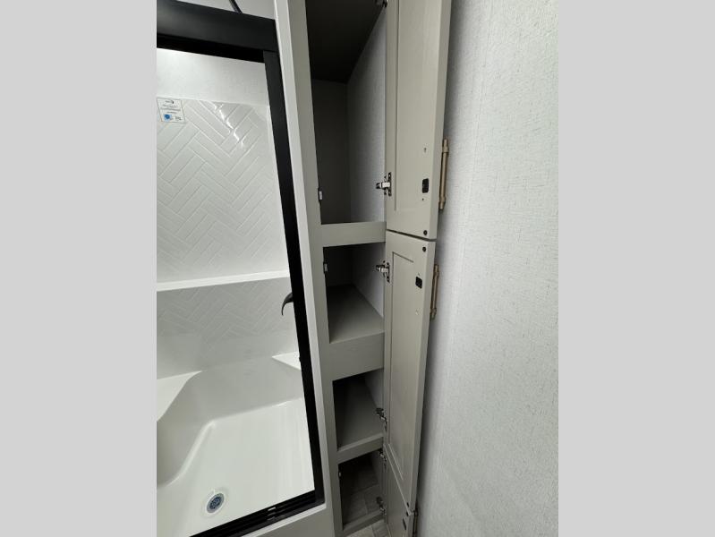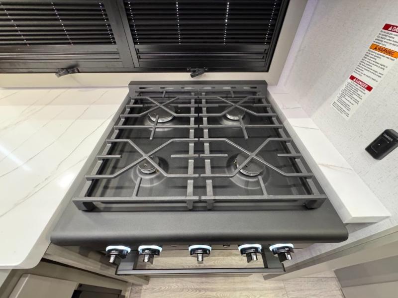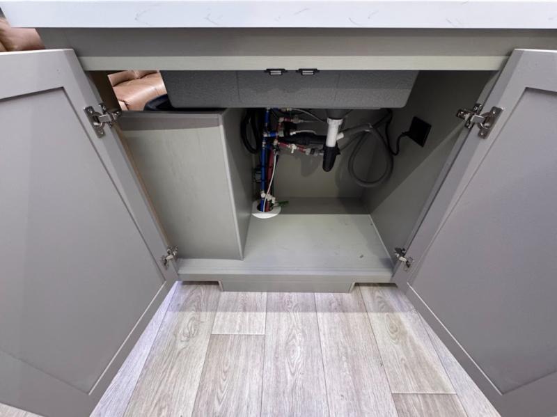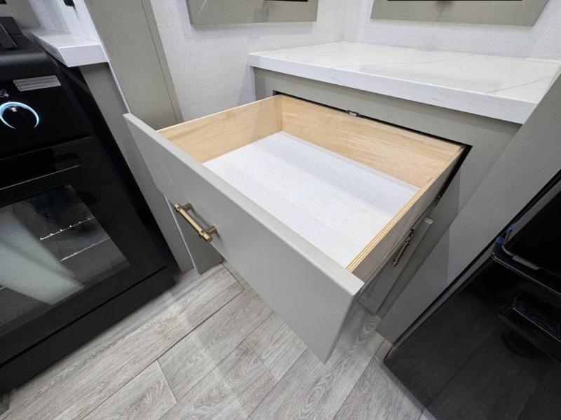 Trips are made complete in this spacious, rear kitchen fifth wheel! There is ample counter space to prep meals, plus a JBL party box so you can listen to your favorite tunes as you cook. The dinette table with two seats provides a place to dine together, and the living area includes a large sofa plus a second, L-shaped sofa with a patent pending AX ottoman/table. A full bath lets you freshen up each day, and a front private bedroom with a king bed tilt lets you stay up late with a book!