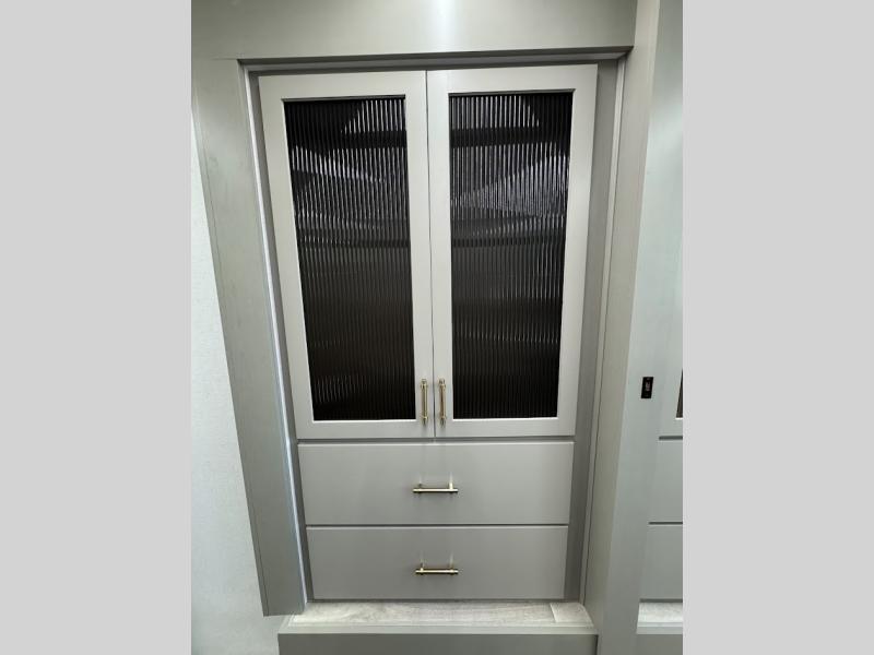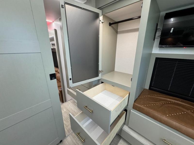 With any Vendetta toy hauler fifth wheel by Axiom RV, you will find innovation and comfort at every turn! The Curt Touring Coil Suspension System with a Curt pin box will provide smooth towing from home to campground, and the deluxe graphics with marine grade fiberglass exterior is sure to be eye-catching. These features are found within the Lux Package, along with a Pathfinder lighting system with integrated turn signals, Lippert solid step triple entry steps, and a low alloy steel construction that is stronger than the competition! The Essential Package features a Lippert 6-point hydraulic leveling system to have you set up at camp in no-time, and the 200-watt solar panel with a 2000-watt inverter provides off-grid capabilities. Solid surface kitchen countertops are included with the AX Comfort Package, along with a Fogotti on-demand water heater, a freedom pass-through storage, Starlink internet prep, and hardwood cabinet doors with slow close hidden hinges.