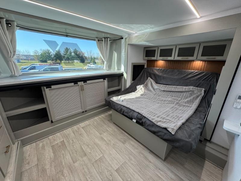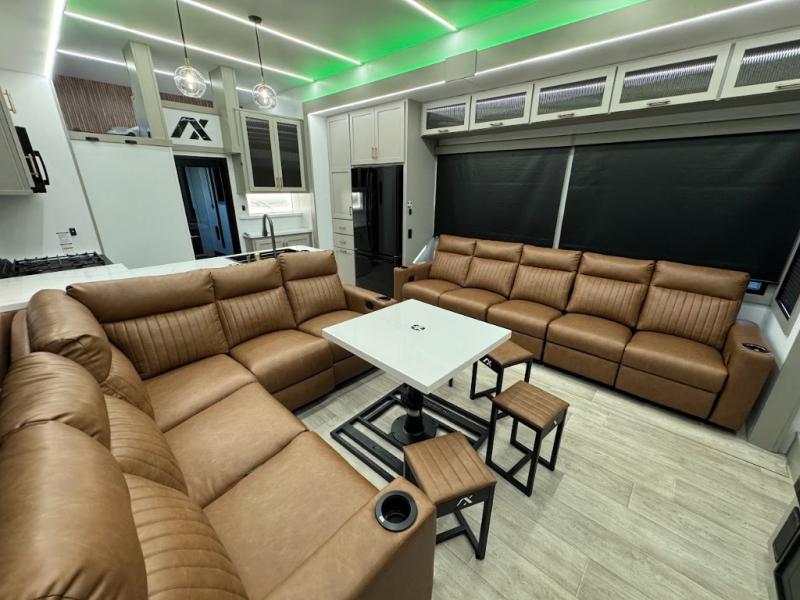 Load up your motorcycles or side-by-side for fun adventures at the campground! There is a 14' 6" garage with one of the dual entry doors to the unit, along with a 60" x 100" mega bed, half bath, fold-down garage sink, plus a loft for even more sleeping space. As you head into the kitchen and living room, you'll find an island peninsula for ample counter space, a large sofa within the slide out, plus an L-shaped sofa with a patent-pending AX ottoman/table. The full bath is right next to the front private bedroom, complete with a king bed tilt and large slide out with generous storage space!