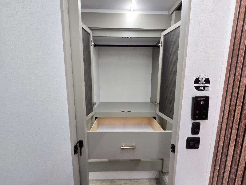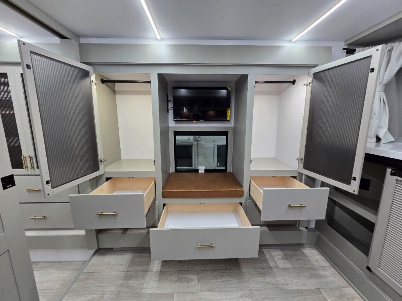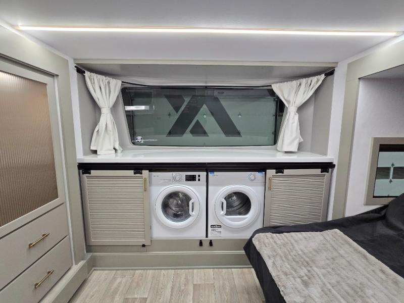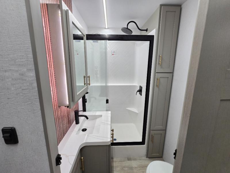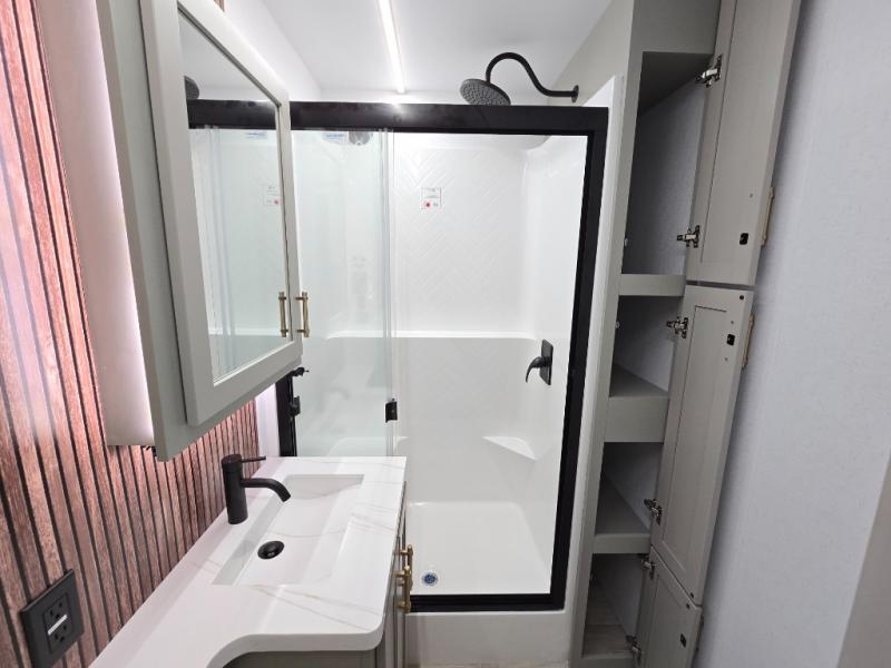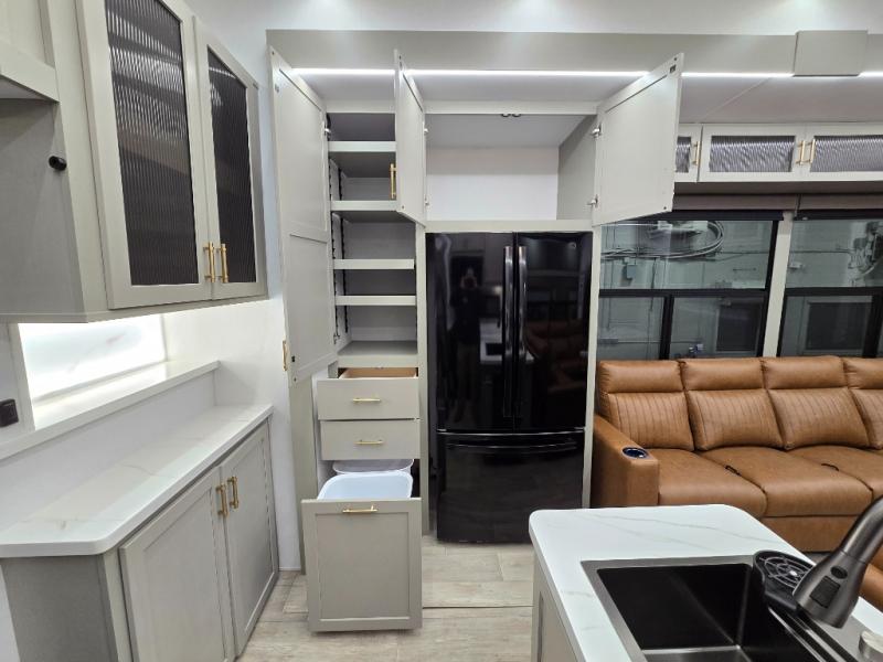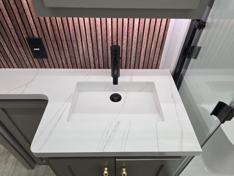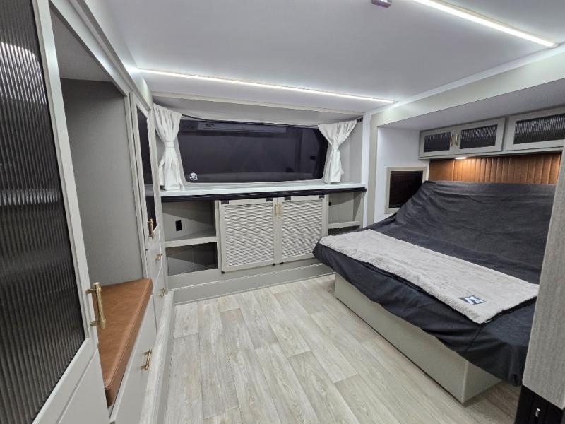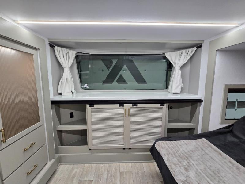 With any Vendetta toy hauler fifth wheel by Axiom RV, you will find innovation and comfort at every turn! The Curt Touring Coil Suspension System with a Curt pin box will provide smooth towing from home to campground, and the deluxe graphics with marine grade fiberglass exterior is sure to be eye-catching. These features are found within the Lux Package, along with a Pathfinder lighting system with integrated turn signals, Lippert solid step triple entry steps, and a low alloy steel construction that is stronger than the competition! The Essential Package features a Lippert 6-point hydraulic leveling system to have you set up at camp in no-time, and the 200-watt solar panel with a 2000-watt inverter provides off-grid capabilities. Solid surface kitchen countertops are included with the AX Comfort Package, along with a Fogotti on-demand water heater, a freedom pass-through storage, Starlink internet prep, and hardwood cabinet doors with slow close hidden hinges.