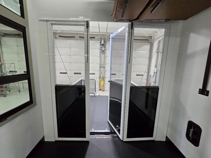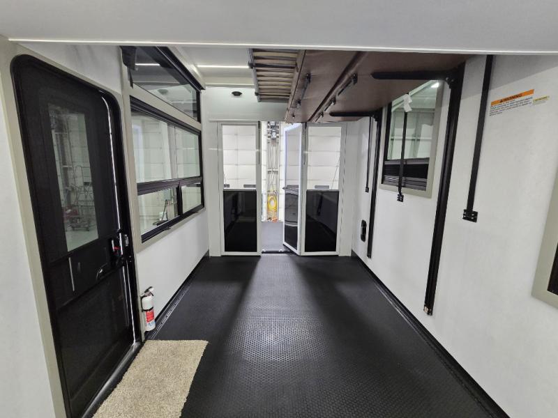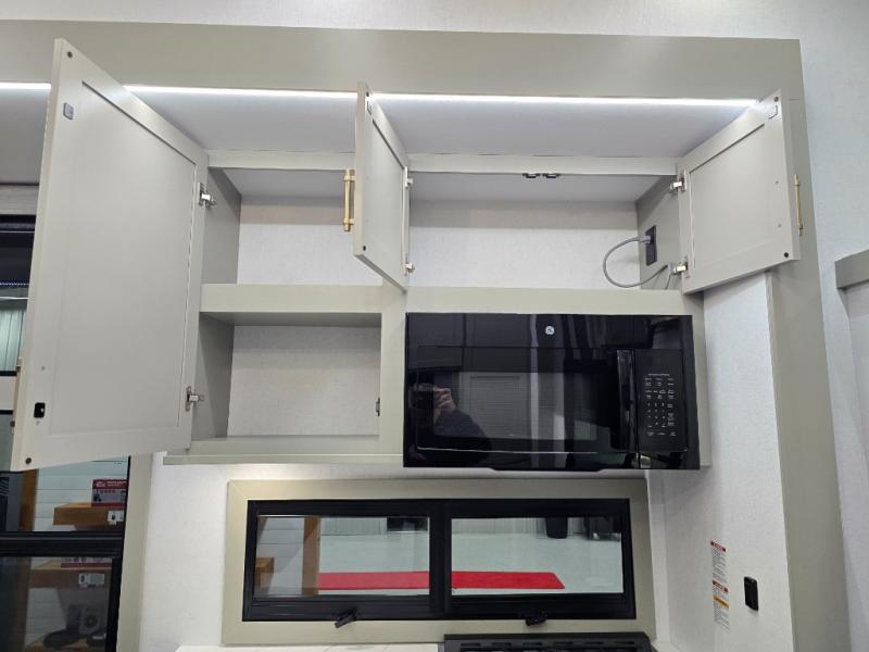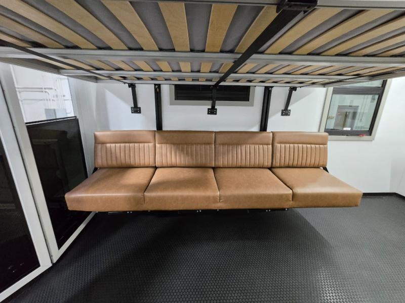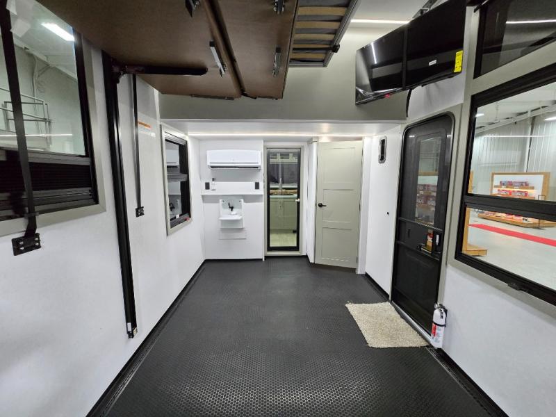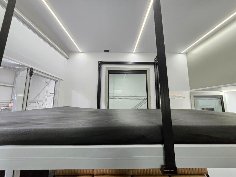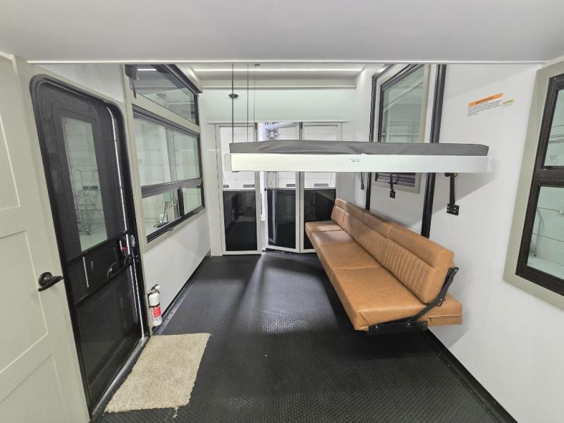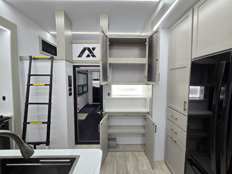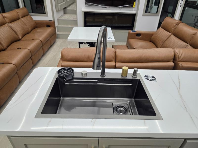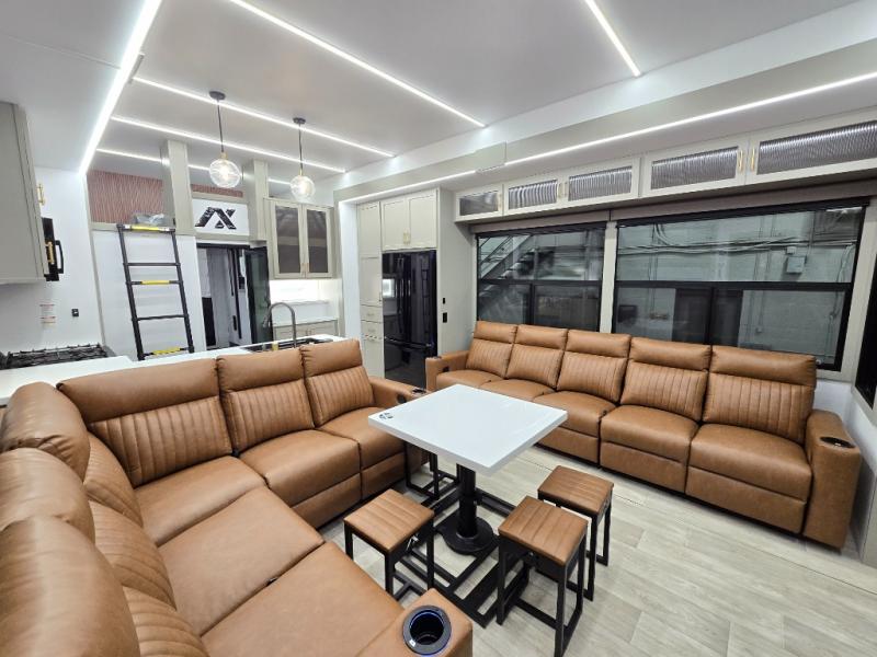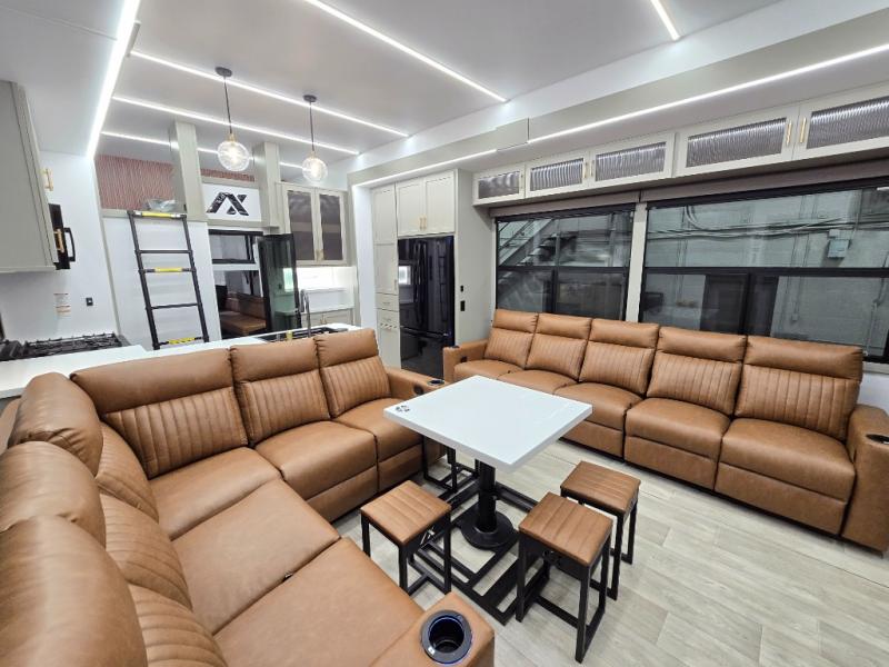 Load up your motorcycles or side-by-side for fun adventures at the campground! There is a 14' 6" garage with one of the dual entry doors to the unit, along with a 60" x 100" mega bed, half bath, fold-down garage sink, plus a loft for even more sleeping space. As you head into the kitchen and living room, you'll find an island peninsula for ample counter space, a large sofa within the slide out, plus an L-shaped sofa with a patent-pending AX ottoman/table. The full bath is right next to the front private bedroom, complete with a king bed tilt and large slide out with generous storage space!