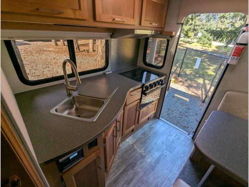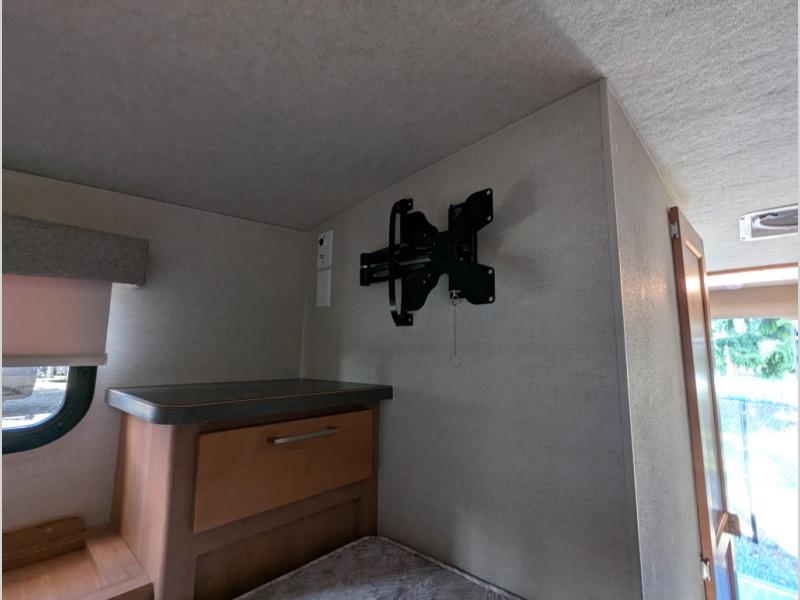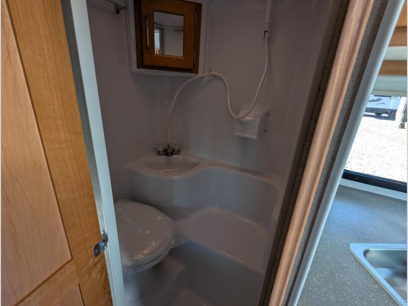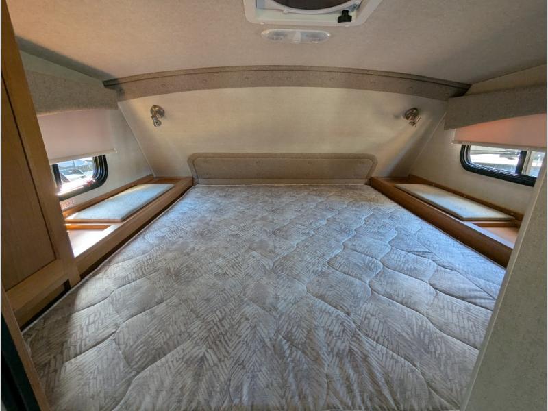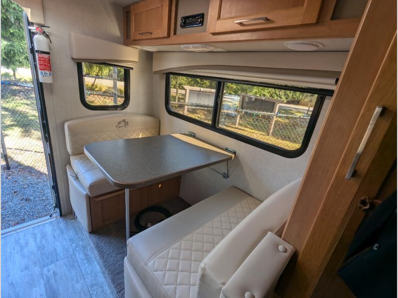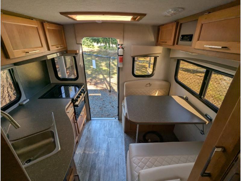 This truck camper will meet your every need while you explore the great outdoors. You will have a convenient wet bath to freshen up in each day, plus a full kitchen with a three burner cooktop, a 2-way refrigerator, plus ample counter space to prep meals. The booth dinette will be perfect for meal times, game night, and additional sleeping space, and you'll enjoy the front RV queen bed all to yourselves.