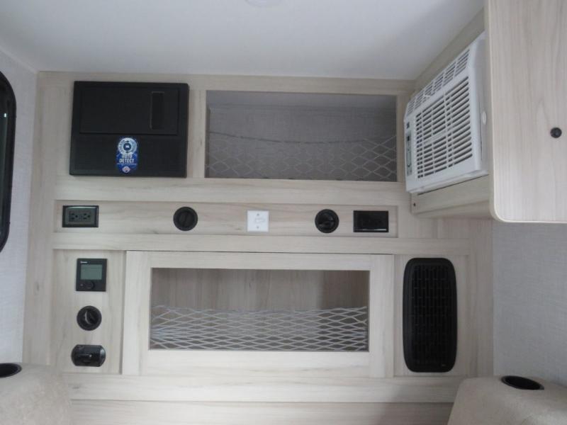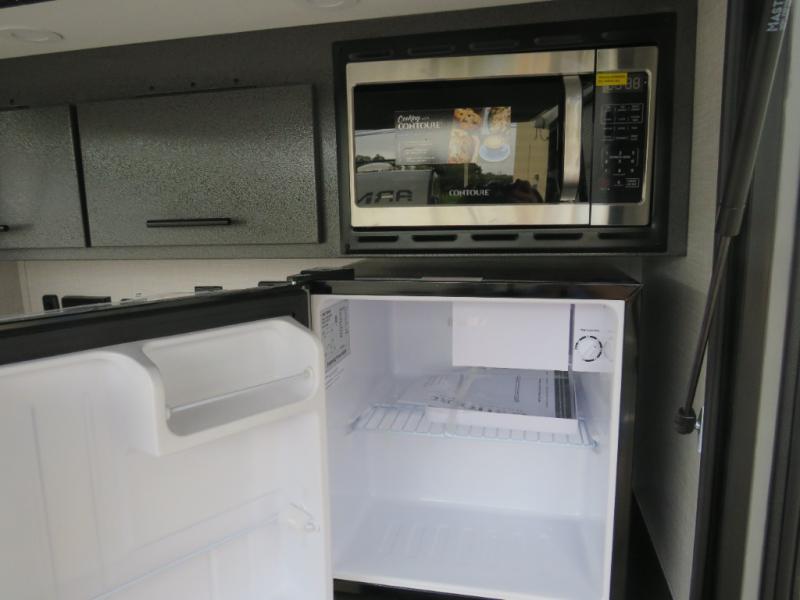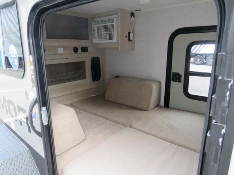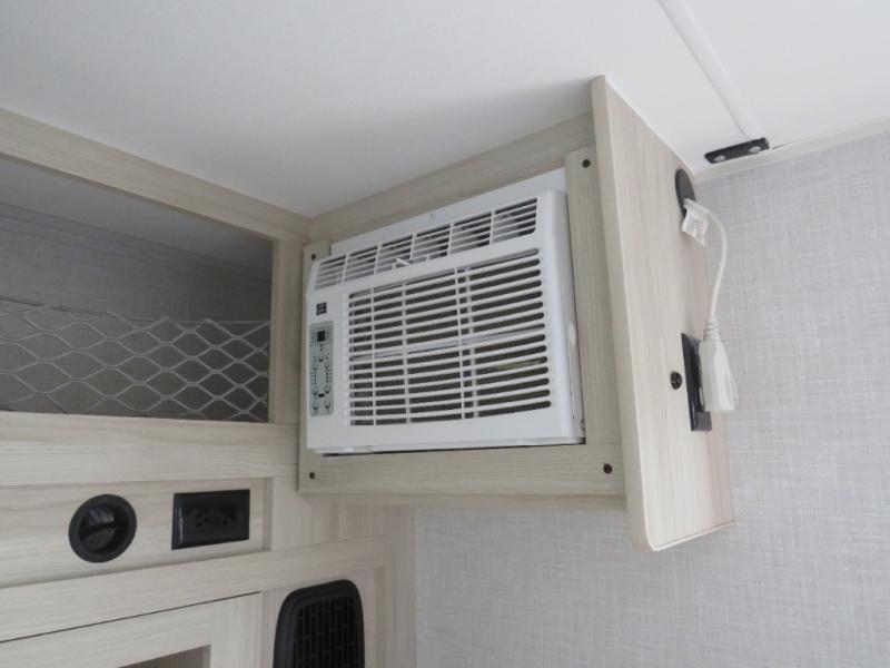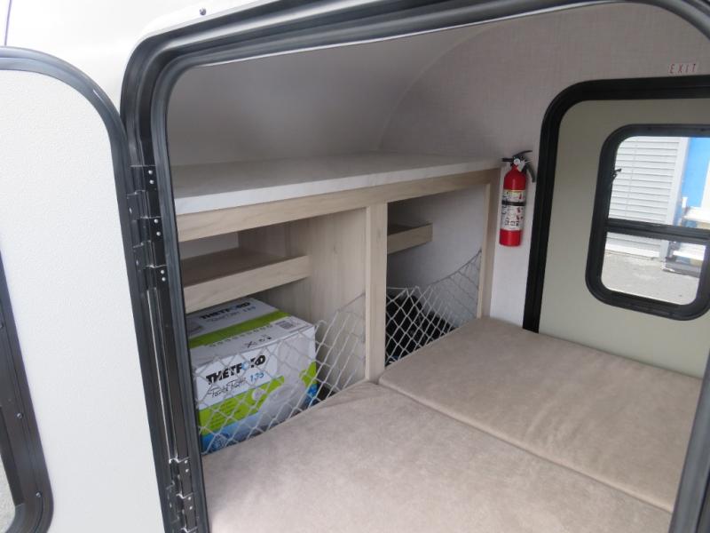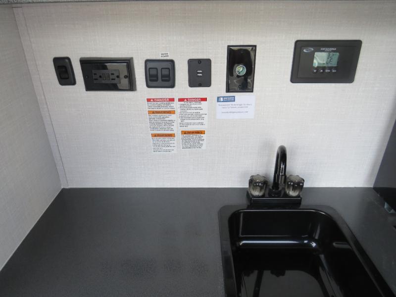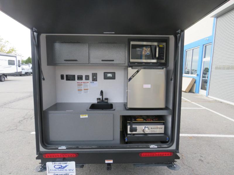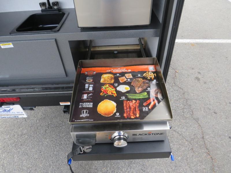 You'll enjoy are more spacious interior in this teardrop trailer, along with dual entry doors so you won't feel like you're climbing on each other to get out in the morning. There is a front countertop with storage space below for your things, and you're sure to sleep great on the 4-inch, deluxe comfort quilted bed mattress. There is also a vent plus a cozy fireplace that will keep you warm. The exterior kitchenette includes a microwave, 12V refrigerator plus a Blackstone Griddle to make your best burgers. This model also includes a 5,000 BTU wall-mounted A/C to help keep you cool during the warmer camping months!