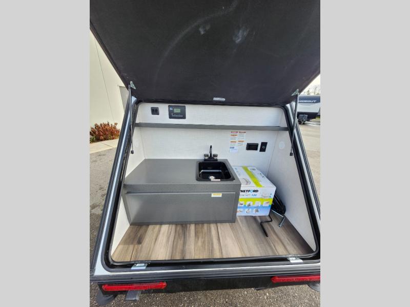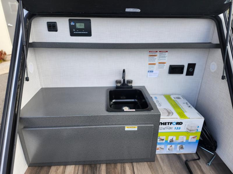 You and your loved one will have a great adventure with this teardrop trailer! Start your mornings off feeling recharged and ready to go after sleeping on the front mattresses. The 12V vent helps to circulate fresh air in and out of the unit, and the 13,500 wall-mounted A/C has a simple interface to cool it off quicker. There are LED lights and multiple 110V, 12V, and USB outlets conveniently located throughout. The exterior kitchenette includes a two burner cooktop and cooler plus an integrated sink with a 26 gallon fresh water tank and 12V water pump.