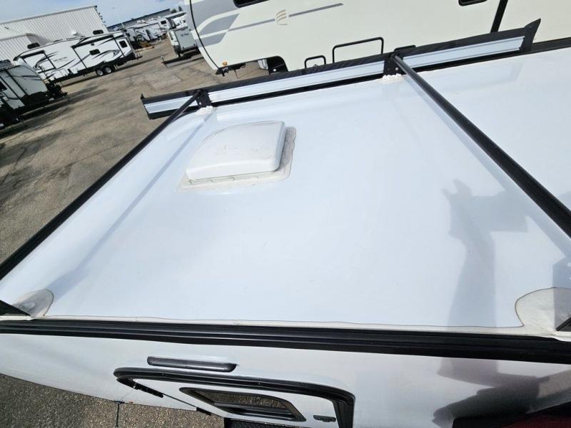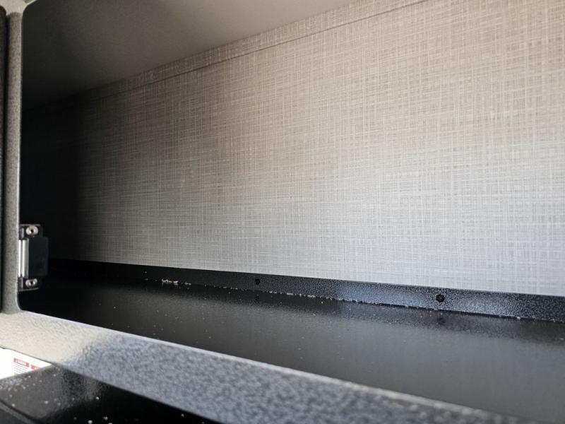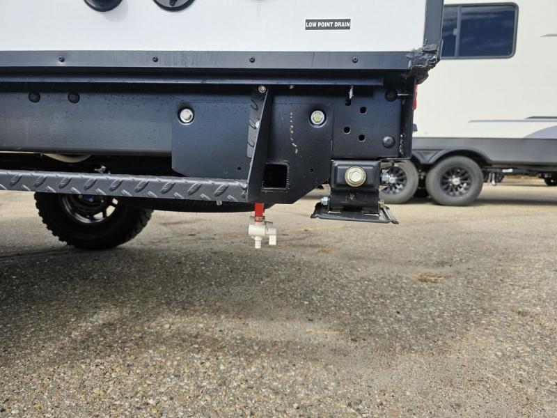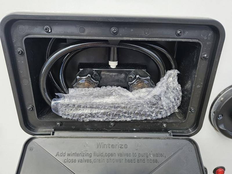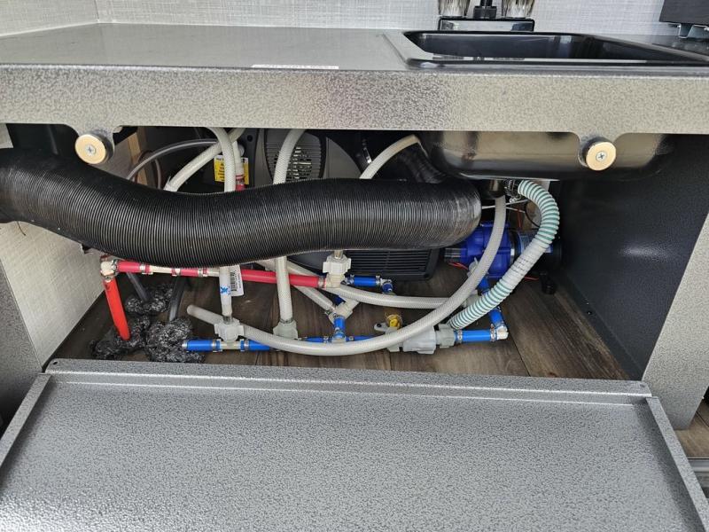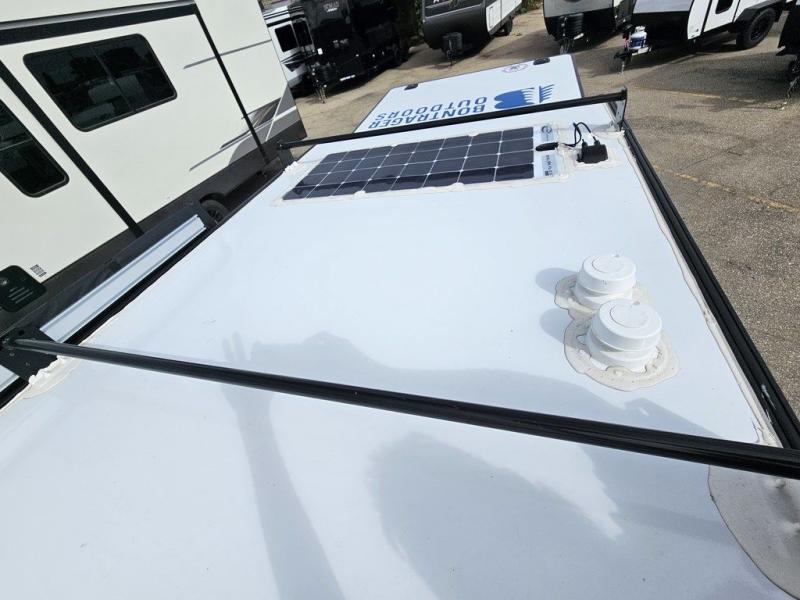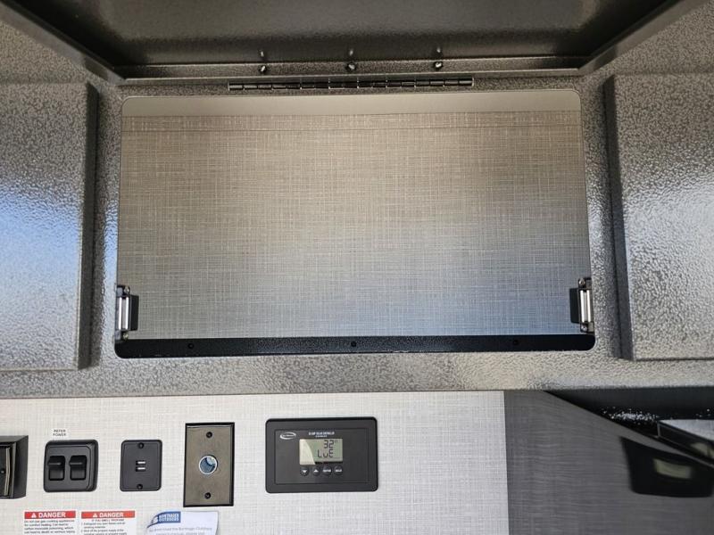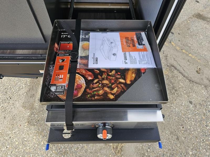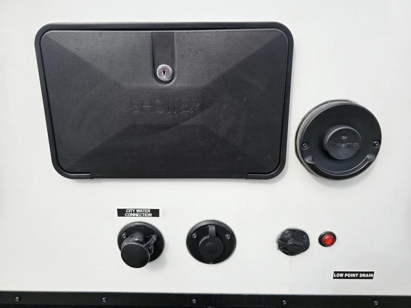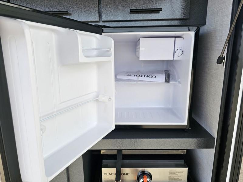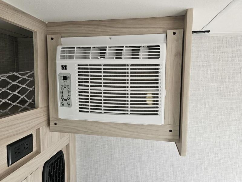 Pack your bags and head for the hills in this easy-to-tow trailer for two! The full outside kitchen includes everything you need to prepare meals each day, and there is an outside shower to fill the dogs water bowl or wash off your hiking boots. Head inside to rest on the mattress with storage below, or maybe just relax by the fireplace! This model also includes a countertop with storage below, a 110V floor mounted A/C and a furnace to help extend your camping season, and a vent to keep fresh air moving inside.
