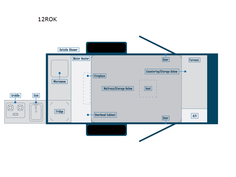 Pack your bags and head for the hills in this easy-to-tow trailer for two! The full outside kitchen includes everything you need to prepare meals each day, and there is an outside shower to fill the dogs water bowl or wash off your hiking boots. Head inside to rest on the mattress with storage below, or maybe just relax by the fireplace! This model also includes a countertop with storage below, a 110V floor mounted A/C and a furnace to help extend your camping season, and a vent to keep fresh air moving inside.