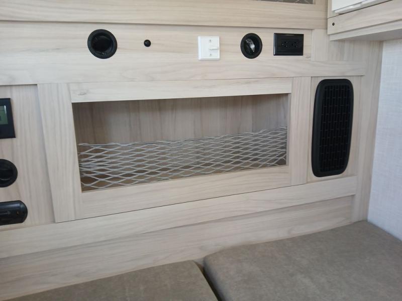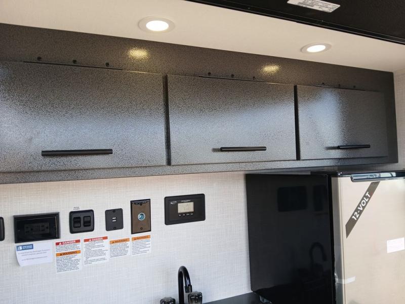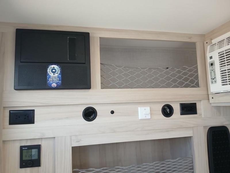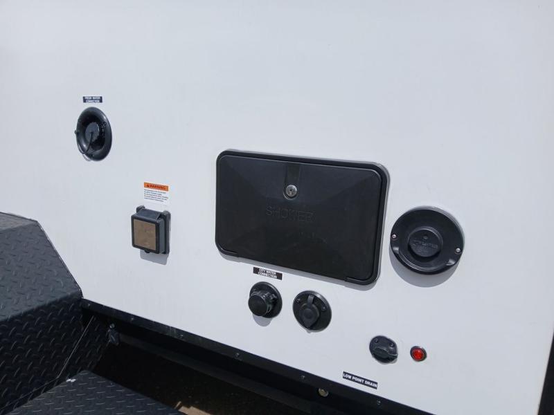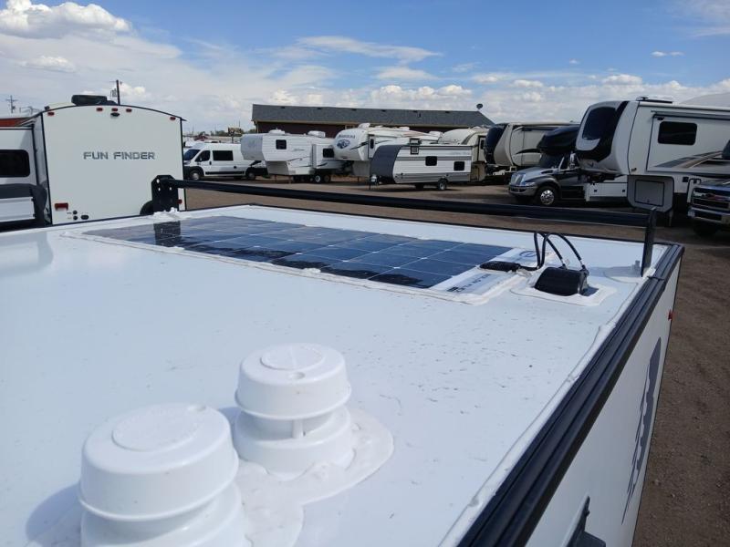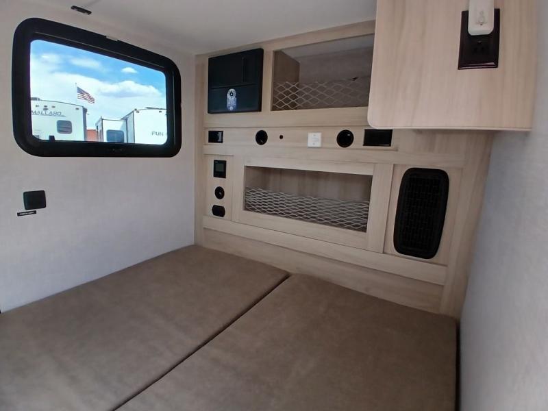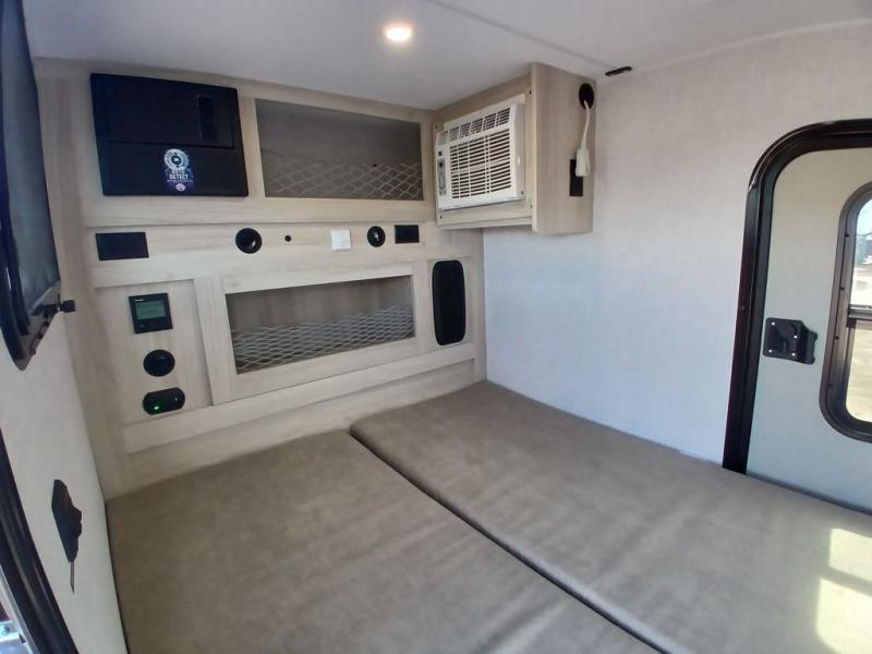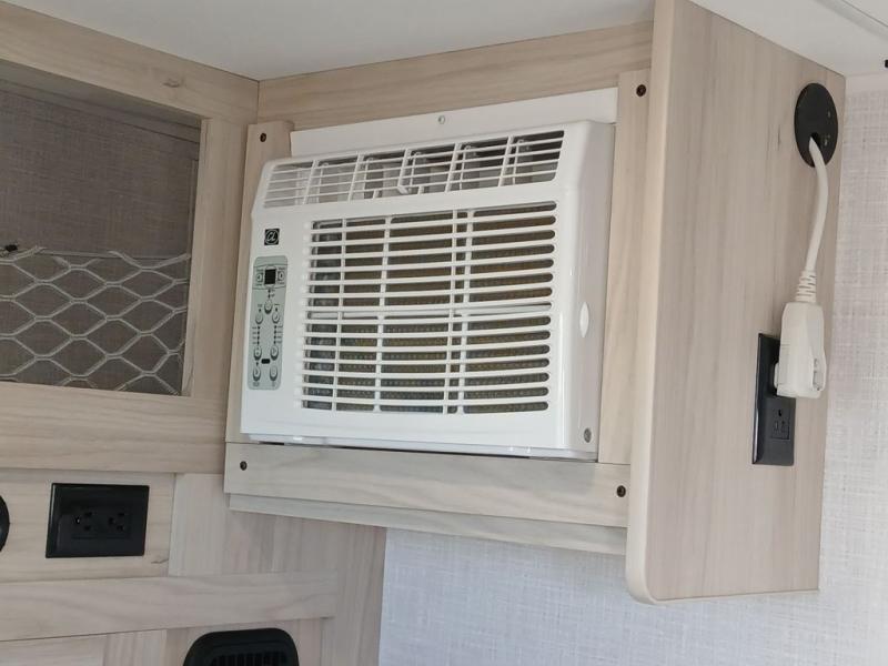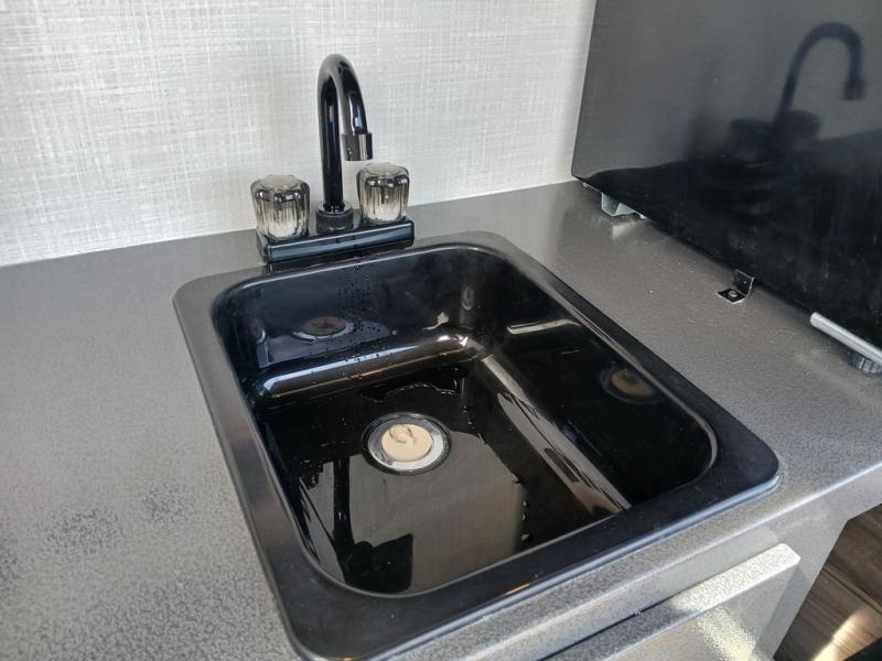 Pack your bags and head for the hills in this easy-to-tow trailer for two! The full outside kitchen includes everything you need to prepare meals each day, and there is an outside shower to fill the dogs water bowl or wash off your hiking boots. Head inside to rest on the mattress with storage below, or maybe just relax by the fireplace! This model also includes a countertop with storage below, a 110V floor mounted A/C and a furnace to help extend your camping season, and a vent to keep fresh air moving inside.
