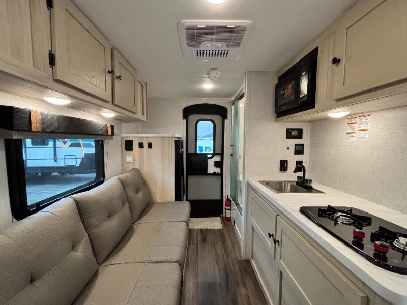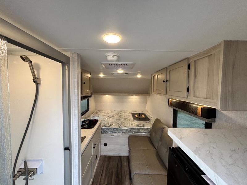 The Standard teardrop trailers by Bontrager Outdoors include a 3,000 lb. high-clearance, torsion-flex, independent axle for smooth towing, and over-sized, all-terrain radial tires with alloy aluminum sport wheels to go off the beaten path. The durable Norco, stamped steel, powder-coated mainframe means you can enjoy your trailer for years to come, and the two rear BAL stabilizing jacks will provide stability as you camp. The Standard teardrop trailers are perfect for those looking for a little extra comfort during their adventures. You'll find an extended wet bath, which you won't find on most teardrop trailers, a small but mighty kitchen area that allows you to make meals each day, plus a 14,300 BTU Truma Combi heater and water heater so you can camp well into the colder months.
