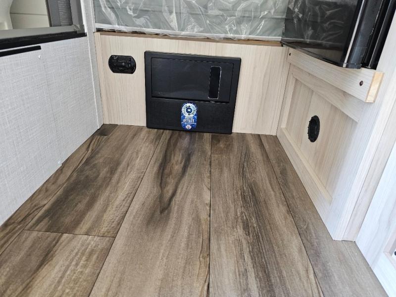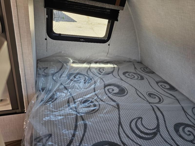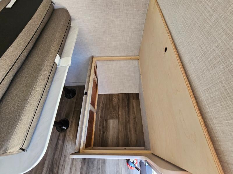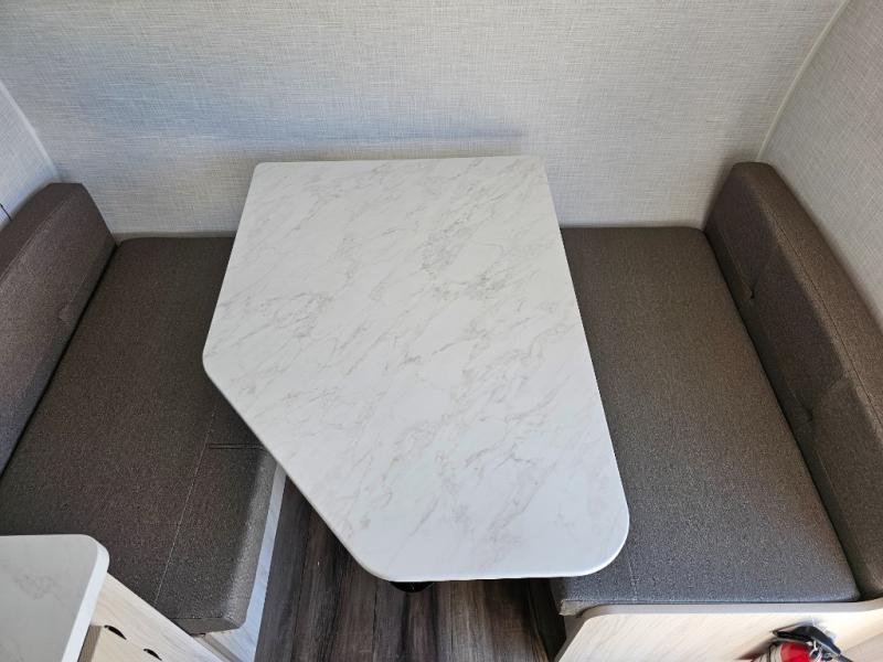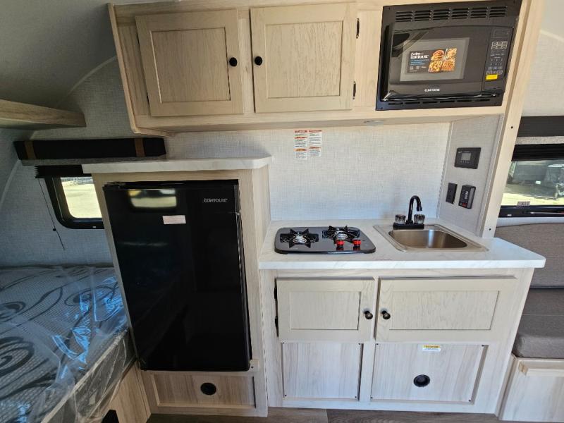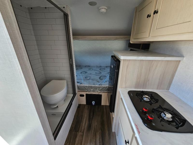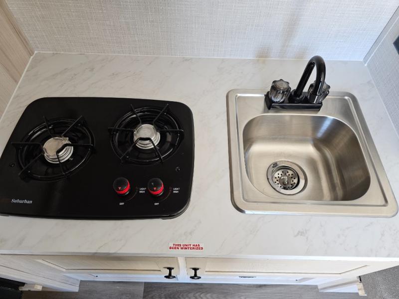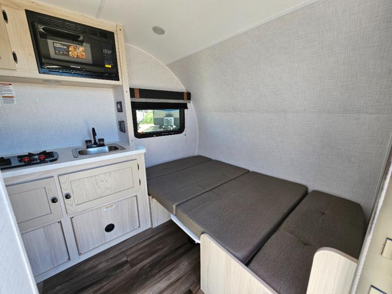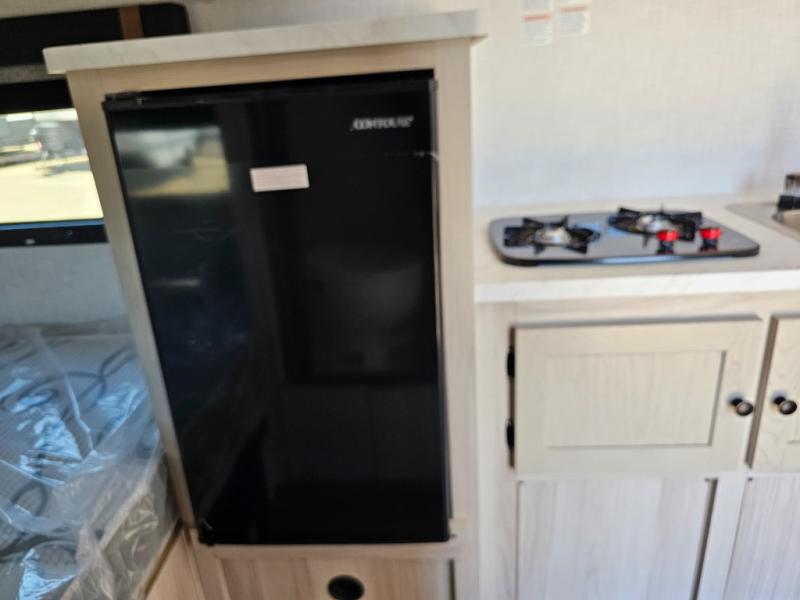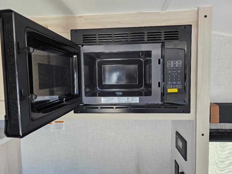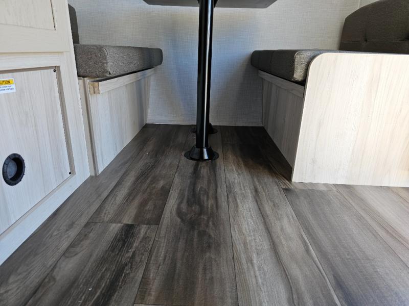 This trailer will feel a little more like home with its queen-size bed! You'll find a convenient wet bath to clean up in each day, plus full kitchen amenities, including a two burner cooktop and a microwave oven. The front dinette will be perfect for dining, playing games, and sleeping an extra guest or two little ones. And since there is a 110V floor mounted A/C included you may just decide to camp all summer!