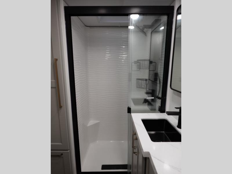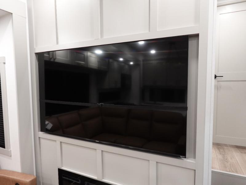 With any Model G toy hauler fifth wheel by Brinkley you will enjoy luxurious amenities, tons of storage space, and innovative features that have been developed and tested in the real world. Durable construction includes an industry leading PDI process, an industry best insulation package, and reinforced and walkable slide roofs. Some of the exterior features you'll find are a 3-way pass-through with a multi-functional flip-up bulkhead wall, under I-beam storage, a MAX-Vision reverse lighting system, and a low-maintenance roof to name a few. A Rockford Fosgate audio system comes standard, along with a Full app-based coach control system (iOS & Android) that lets you control your fifth wheel's functions right from your mobile device. You will find the solar system with a designated storage area to be ultra convenient, plus there is a FlexPower 5500 with a dual fuel inverter generator for all your power needs. Head inside to find a residential interior with Brinkley's CraftSense wood trim construction, floating entrance steps, integrated window screens and insulated blackout blinds, and residential solid surface countertops plus backsplash. You will also enjoy the neon shower lighting and recessed medicine cabinets in the bath, plus motion activated LED bed lights and dual bedside outlets in the bedroom. Choose a Model G toy hauler fifth wheel to experience all the luxury it has to offer!