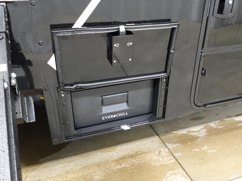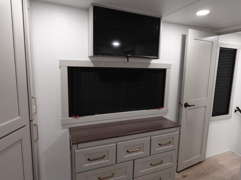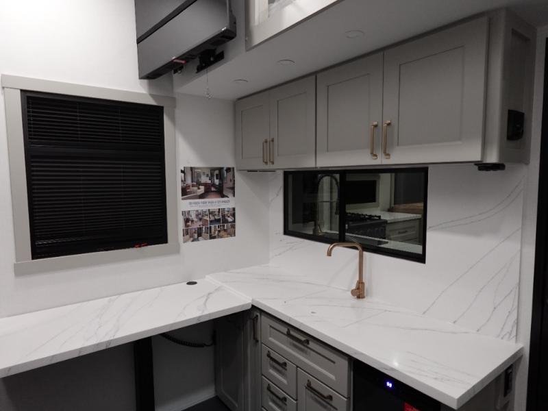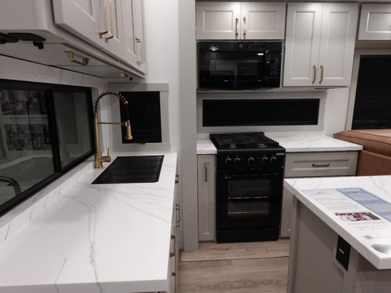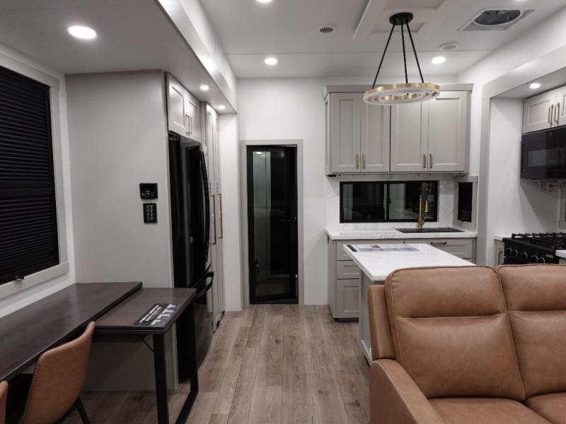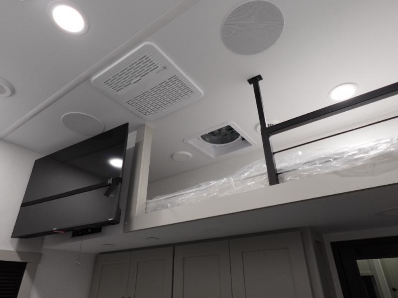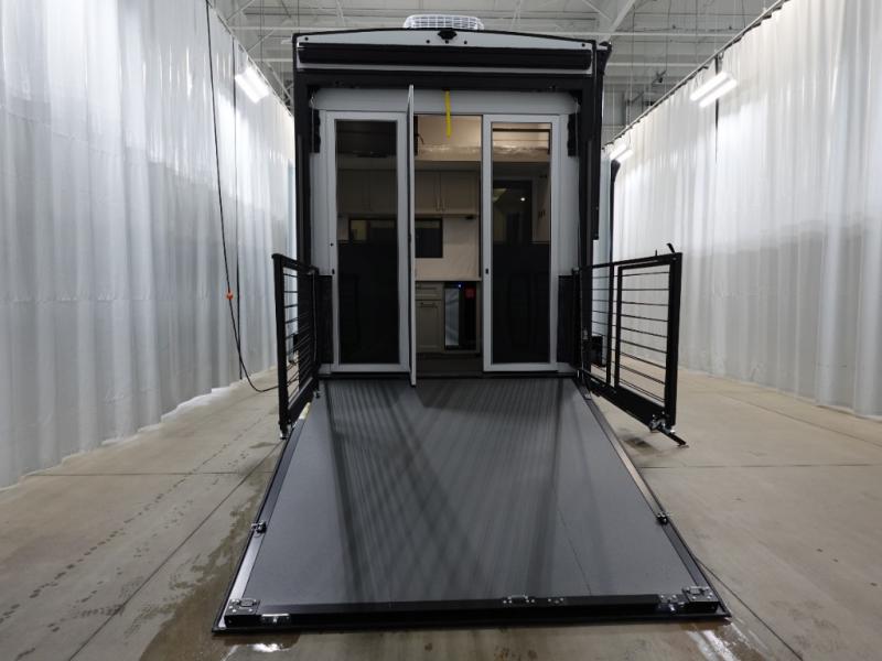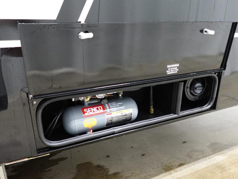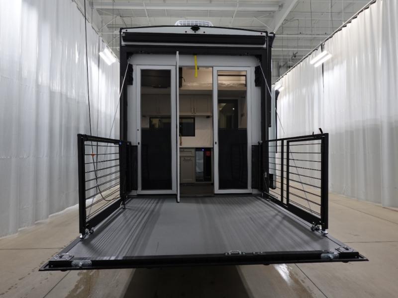 You can't imagine how much this toy hauler has to offer! The garage/outdoor kitchen/office space will allow you to utilize the garage how you need it, plus there is an adjustable tie-down system, as well as a loft for storage and a twin bed to sleep more campers! The garage patio with a 1,500 lb. capacity is another feature you are sure to love, especially with its own awning to keep you protected from the elements. Head to the kitchen to prepare meals with a 24" GE oven with a four burner range, a GE microwave with an air fryer, plus a spacious GE Energy Star 19 cu. ft. refrigerator. The island with two stools will let others visit with you while you cook, and there are even dog bowls to easily feed Frodo. You'll find the convertible dining table/L-desk will be accommodating since it can be use to dine at, and to get some work done. You may just find yourselves spending most of your time on the L-sofa in front of the entertainment center with a TV, fireplace and storage. A full bath is up front by the bedroom, and here you'll find a 30" x 42" shower and and pull-out linen storage with a trash bin to keep towels ready to use. After a day outdoors you'll love nothing more than coming back to your own bedroom with a king bed slide out, TV, a walk-in closet, and many more storage spaces. And we haven't even touched on the exterior features, like the 3-way pass-through storage, three power awnings, an air compressor to fill up tires, and the list goes on and on! This is a pre-production preview, all features and layout placement subject to change.