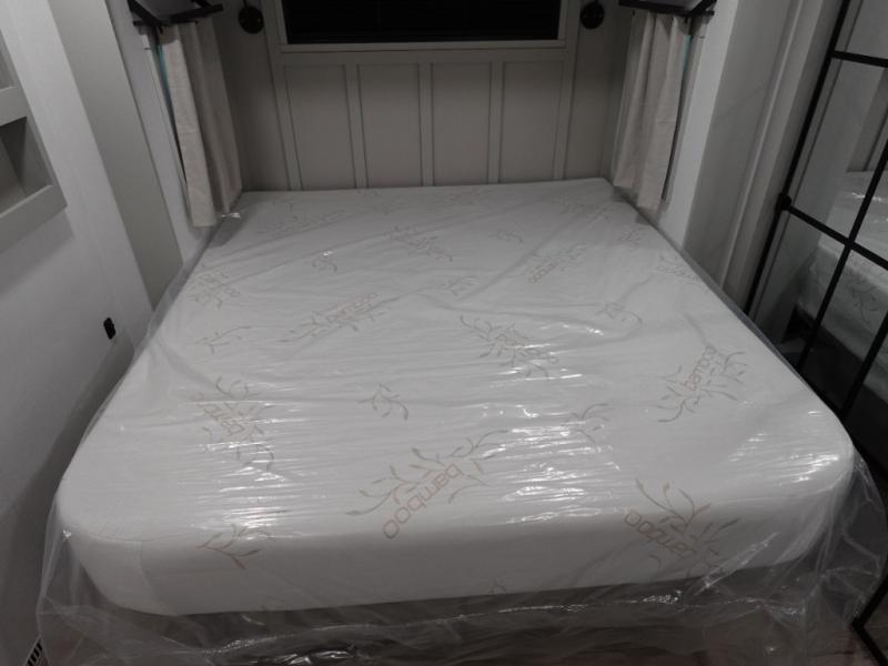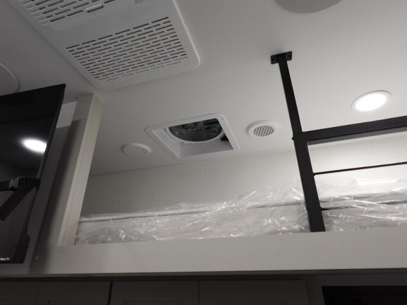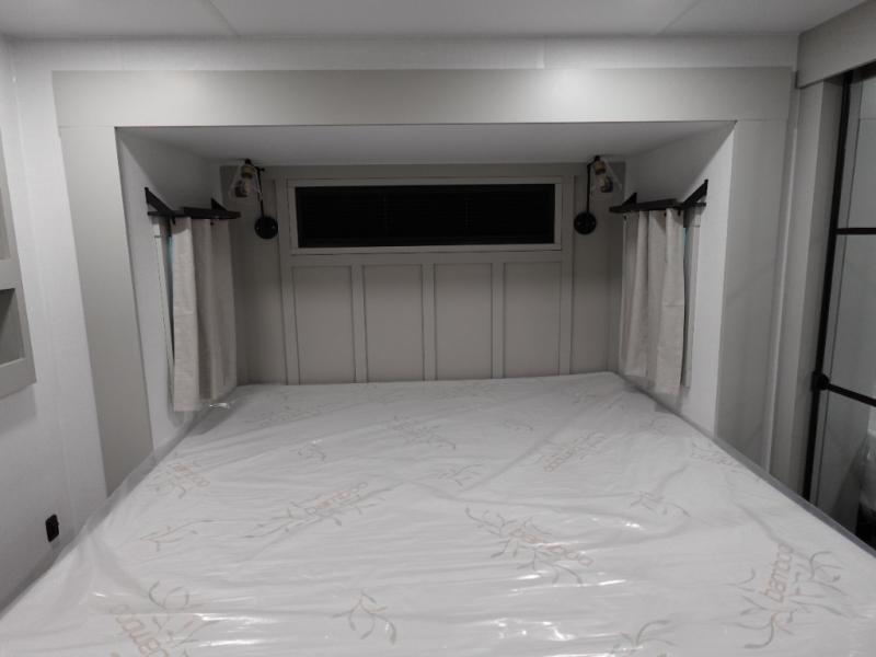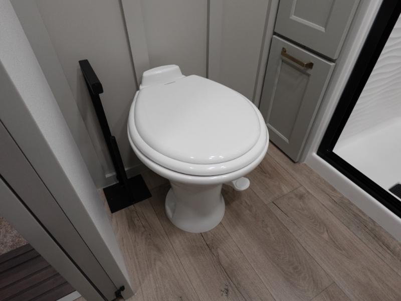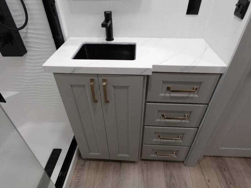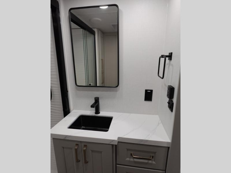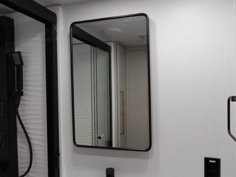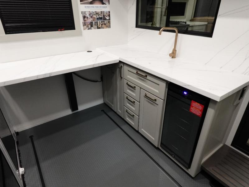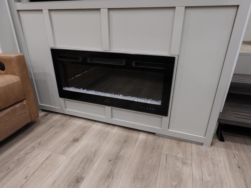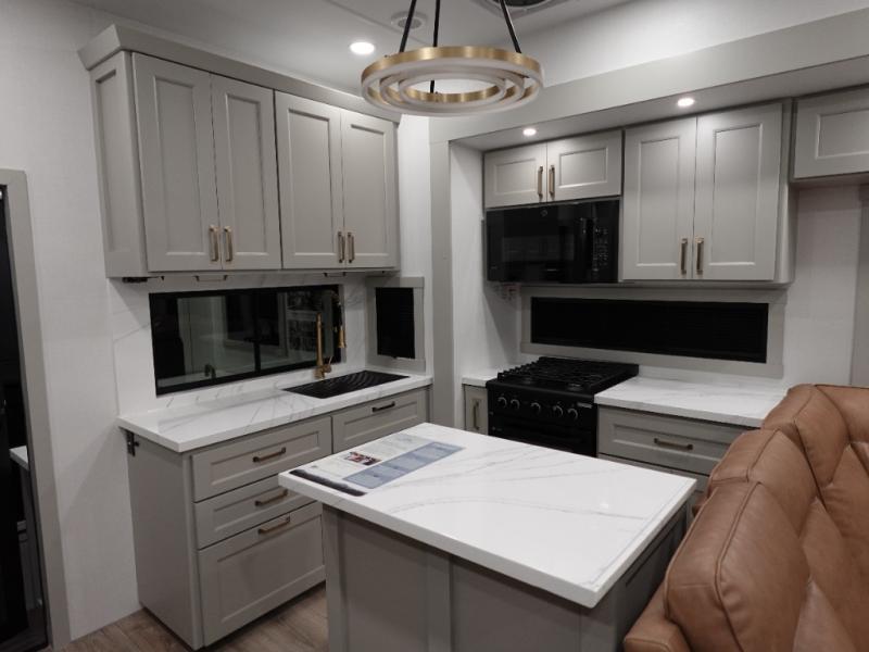 You can't imagine how much this toy hauler has to offer! The garage/outdoor kitchen/office space will allow you to utilize the garage how you need it, plus there is an adjustable tie-down system, as well as a loft for storage and a twin bed to sleep more campers! The garage patio with a 1,500 lb. capacity is another feature you are sure to love, especially with its own awning to keep you protected from the elements. Head to the kitchen to prepare meals with a 24" GE oven with a four burner range, a GE microwave with an air fryer, plus a spacious GE Energy Star 19 cu. ft. refrigerator. The island with two stools will let others visit with you while you cook, and there are even dog bowls to easily feed Frodo. You'll find the convertible dining table/L-desk will be accommodating since it can be use to dine at, and to get some work done. You may just find yourselves spending most of your time on the L-sofa in front of the entertainment center with a TV, fireplace and storage. A full bath is up front by the bedroom, and here you'll find a 30" x 42" shower and and pull-out linen storage with a trash bin to keep towels ready to use. After a day outdoors you'll love nothing more than coming back to your own bedroom with a king bed slide out, TV, a walk-in closet, and many more storage spaces. And we haven't even touched on the exterior features, like the 3-way pass-through storage, three power awnings, an air compressor to fill up tires, and the list goes on and on! This is a pre-production preview, all features and layout placement subject to change.